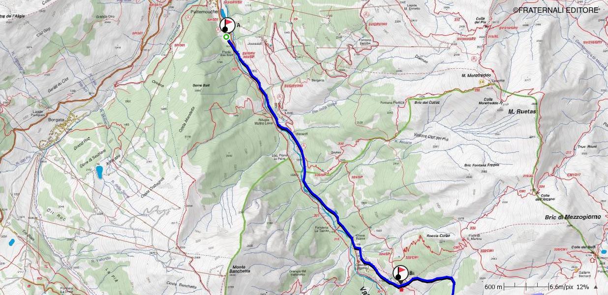 a-b: Seguire la strada di fondovalle, che in inverno è mantenuta come pista di fondo e poi con traccia battuta dal gatto delle nevi fino al bivio per Troncea (1.768 m). Da qui, si prende a seguire la strada che, diramandosi sulla sinistra, si inerpica sul fianco della valle sino a raggiungere – a quota 1.915 m – Troncea, antico borgo distrutto dai tedeschi nel 1944, e l’omonimo rifugio, ove è eventualmente possibile pernottare.