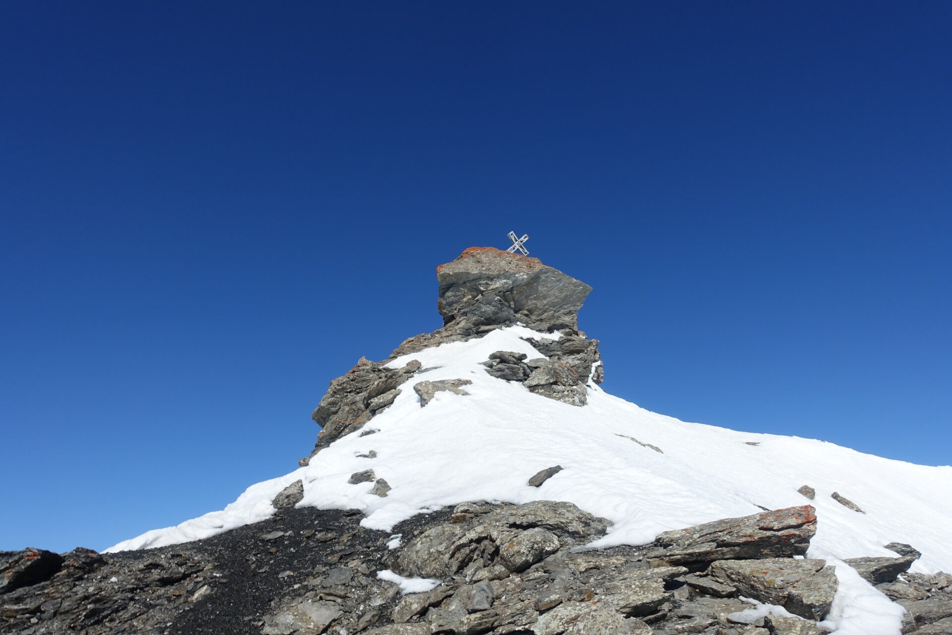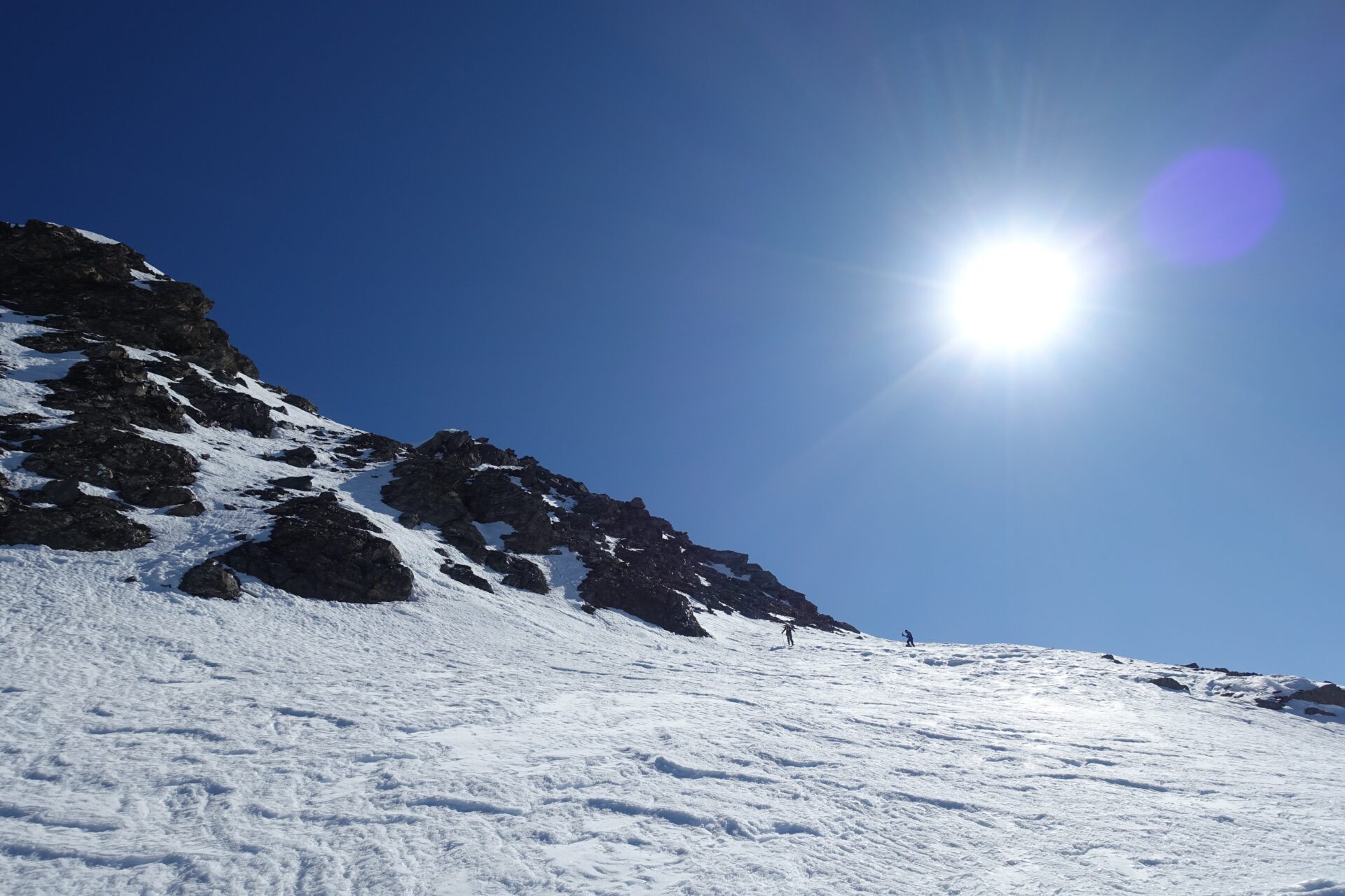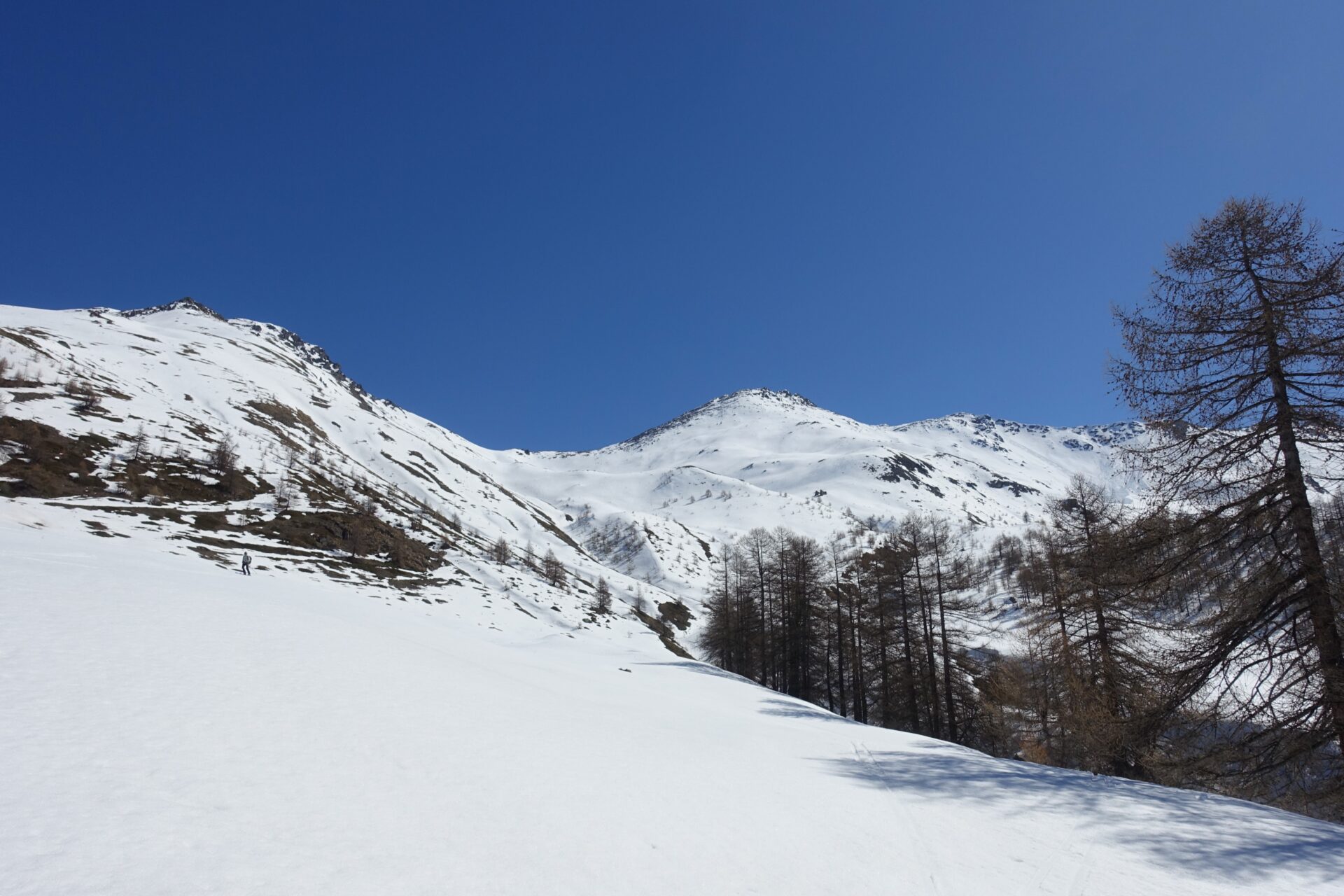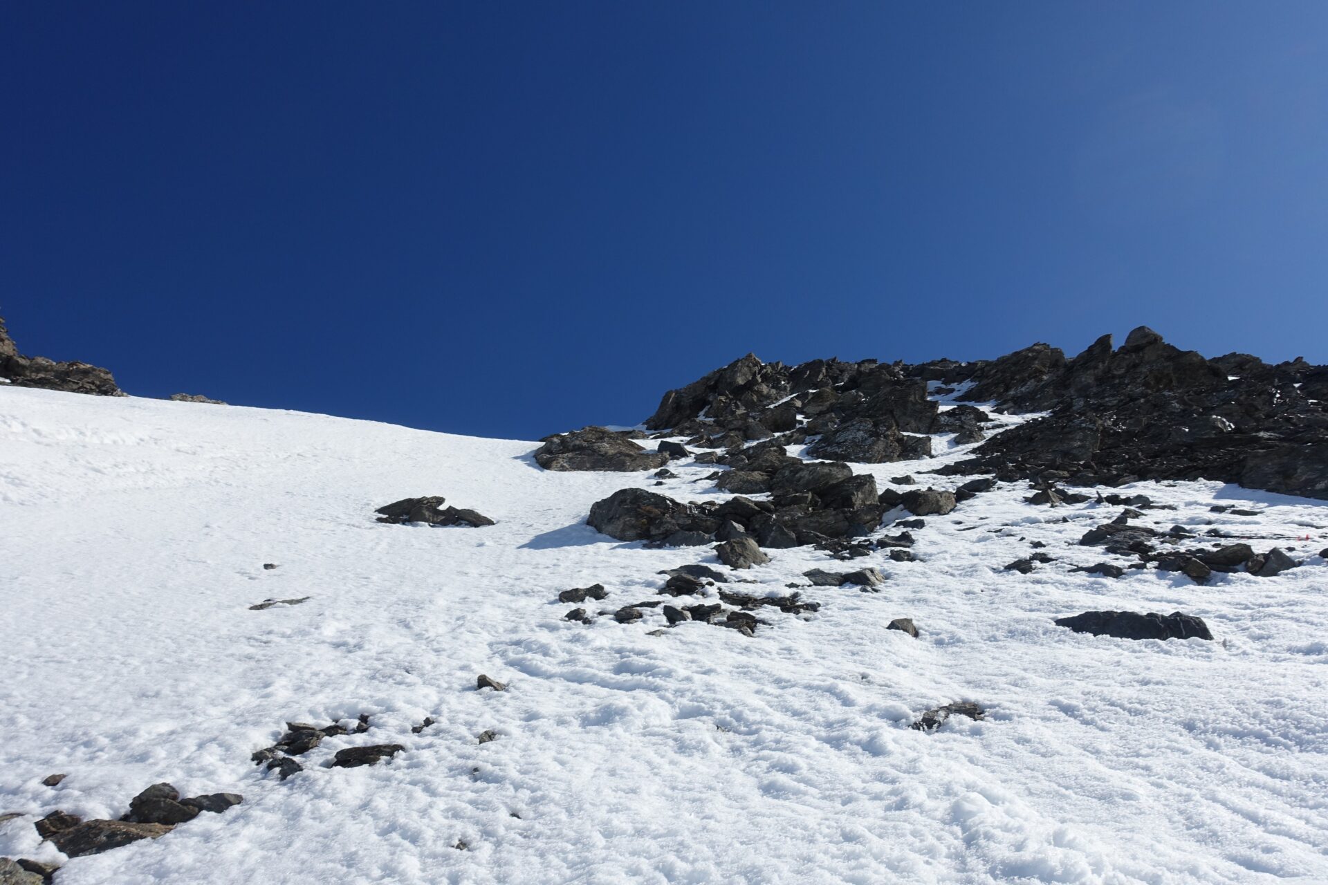 c-d: Di qui, attraversati i due canali di quest’ultimo, si procede per l’appunto lungo il costone del Ghinivert (a quota 2.435 si trova “l’Angolo”, evidente rudere delle vecchie installazioni minerarie) sino a quota 2.900 circa; quindi si piega a destra e, approfittando di un gradino naturale situato poco al di sotto della cresta nord-ovest, si attraversa il versante sud-ovest sino a trovarsi sotto la verticale della vetta che, lasciati gli sci, si raggiunge percorrendo per un centinaio di metri facili roccette affioranti. In alternativa, è possibile continuare ad attraversare in falso piano fino a congiungersi con la cresta sud della montagna. Di qui, intercettate le tracce del sentiero estivo, spesso sgombro da neve in stagione avanzata, si è agevolmente in vetta.