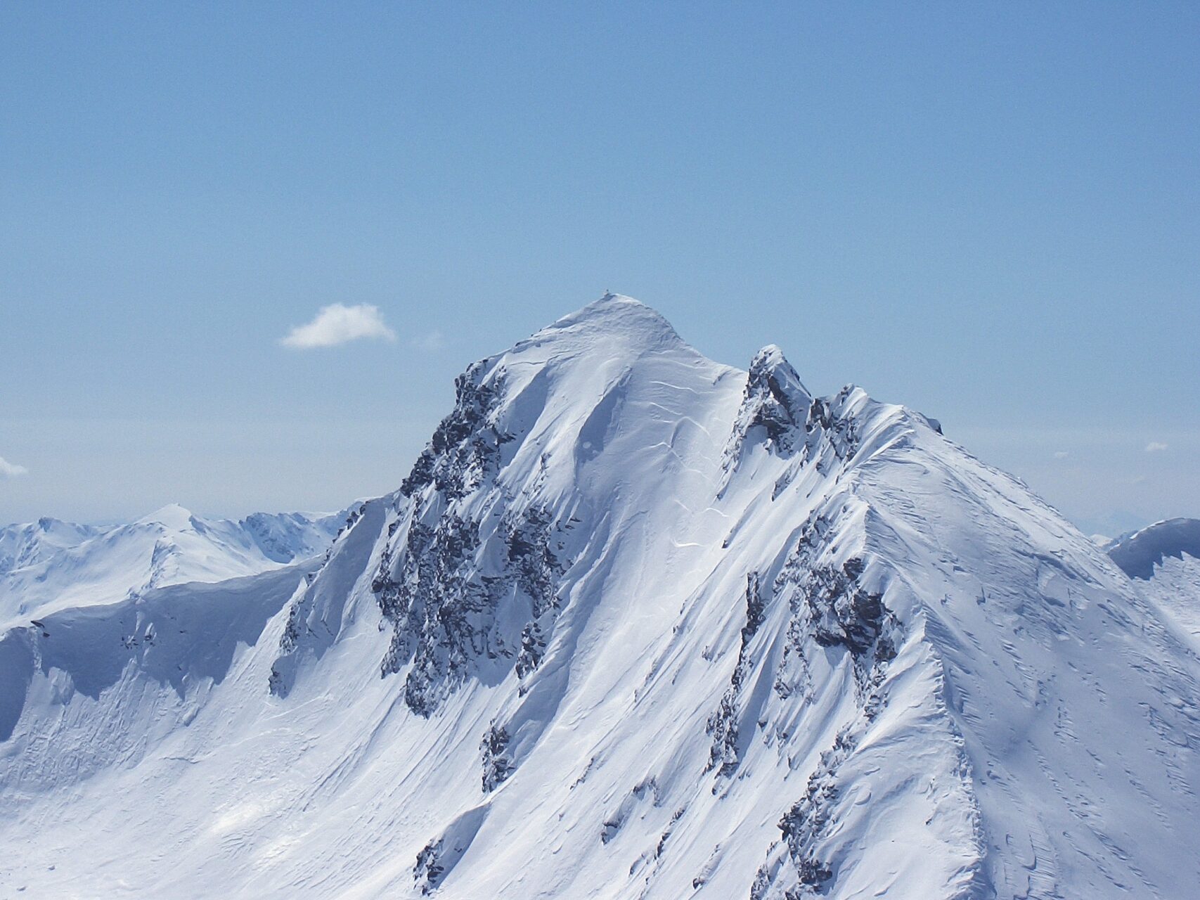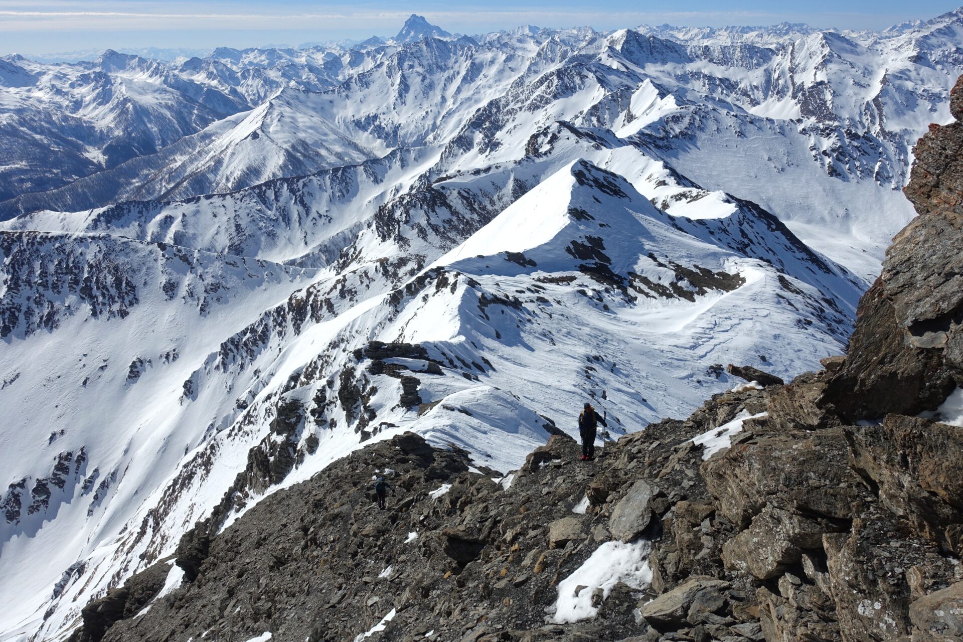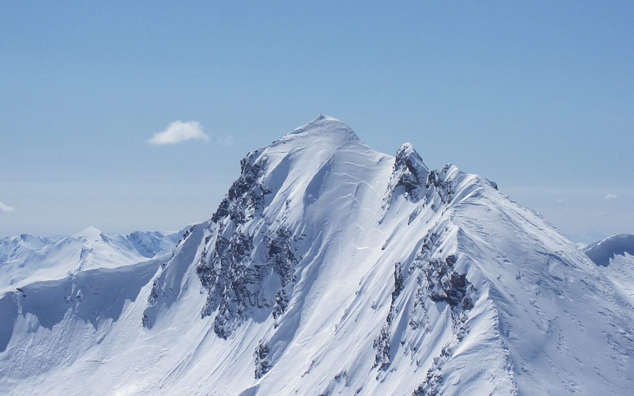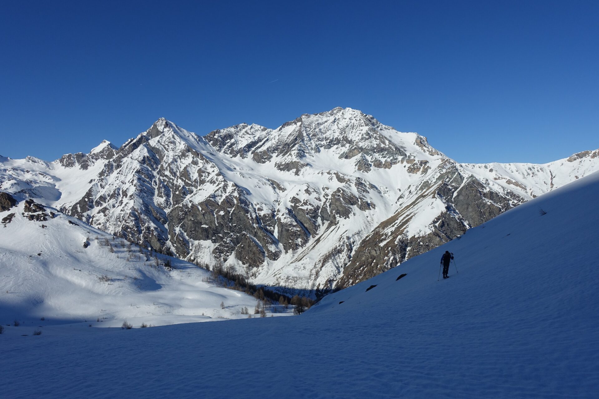 c-d: Di qui, attraversati i due canali di quest’ultimo, si procede per l’appunto lungo il costone del Ghinivert (a quota 2.435 si trova “l’Angolo”, evidente rudere delle vecchie installazioni minerarie) sino a quota 2.900 circa; quindi si piega a destra e, approfittando di un gradino naturale situato poco al di sotto della cresta nord-ovest, si attraversa il versante sud-ovest sino a trovarsi sotto la verticale della vetta che, lasciati gli sci, si raggiunge percorrendo per un centinaio di metri facili roccette affioranti. In alternativa, è possibile continuare ad attraversare in falso piano fino a congiungersi con la cresta sud della montagna. Di qui, intercettate le tracce del sentiero estivo, spesso sgombro da neve in stagione avanzata, si è agevolmente in vetta.