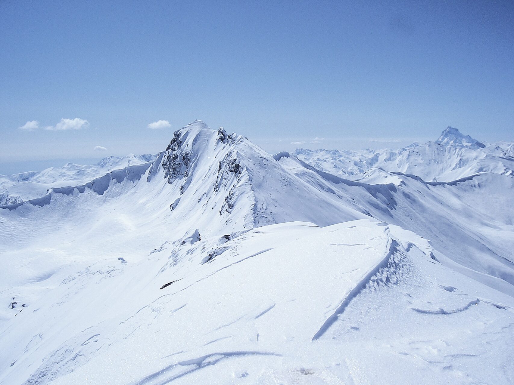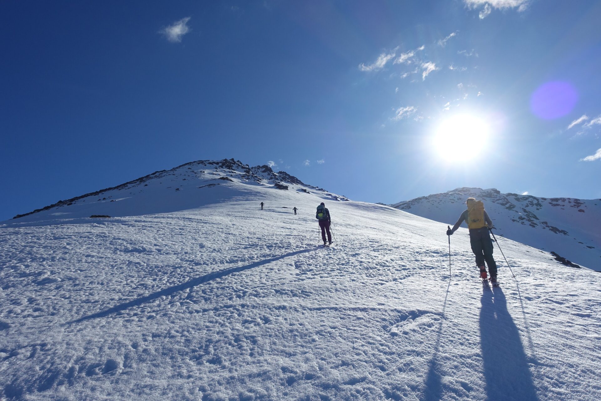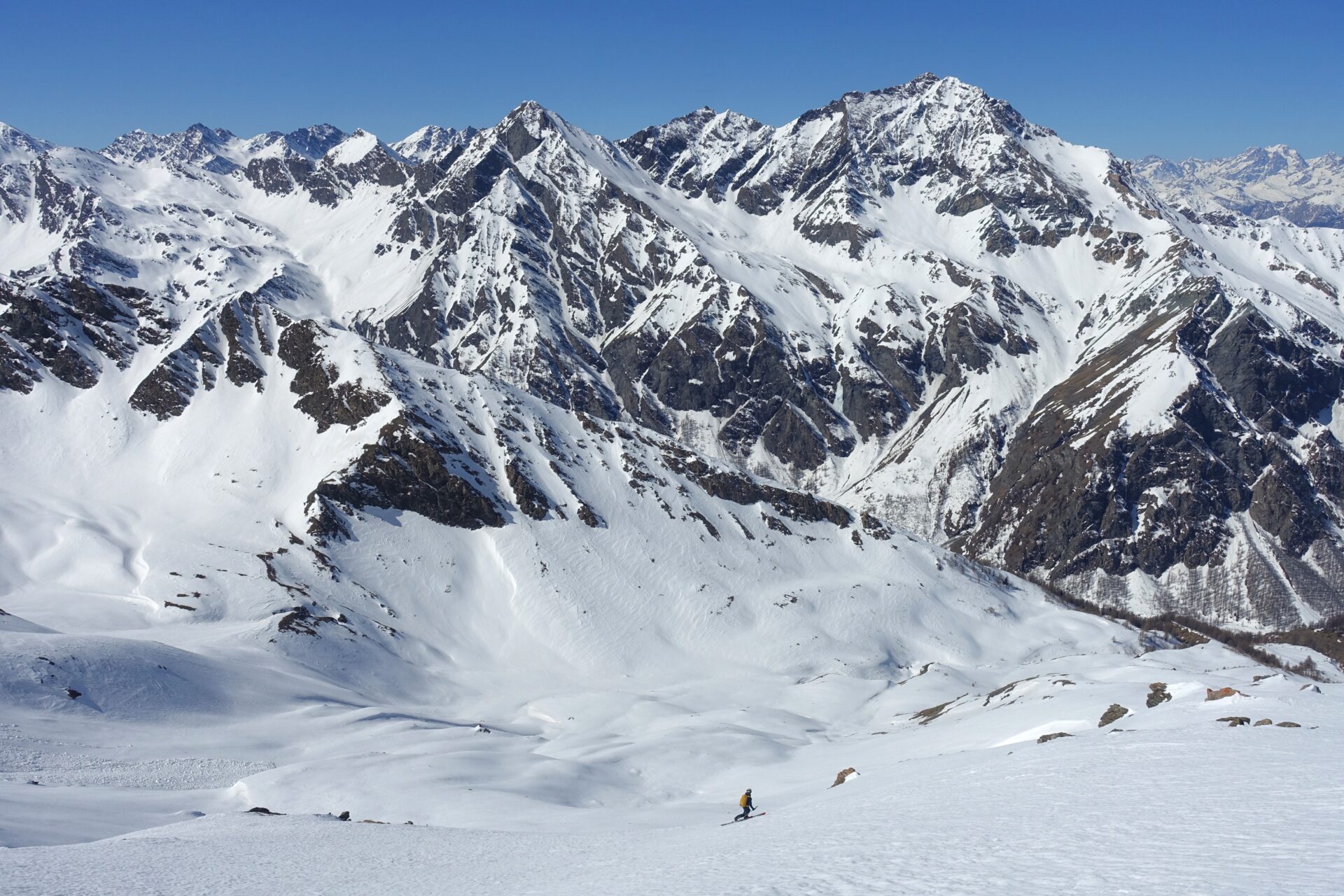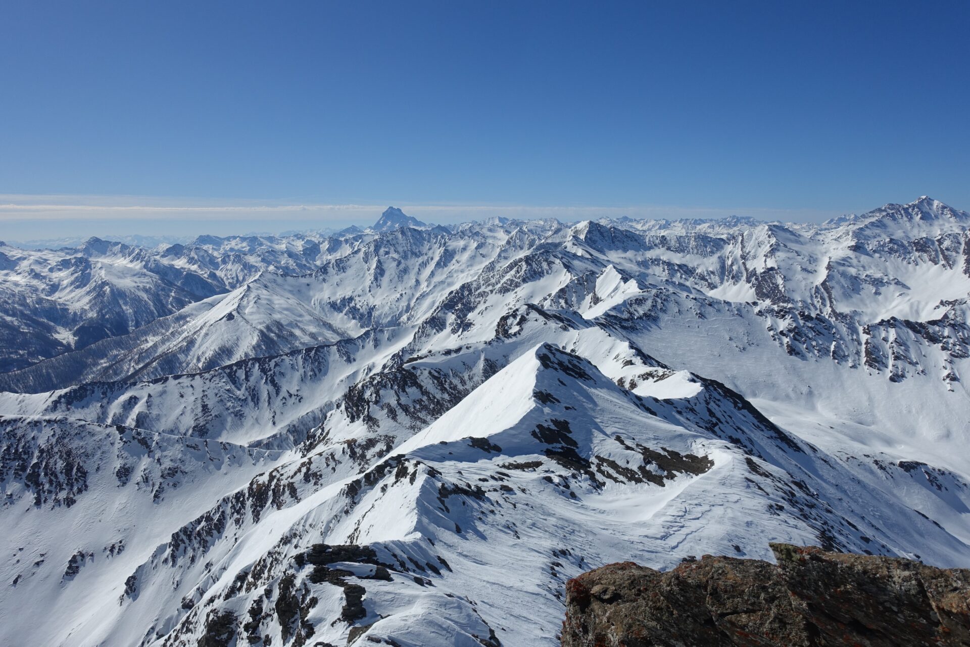 c-d: Di qui, attraversati i due canali di quest’ultimo, si procede per l’appunto lungo il costone del Ghinivert (a quota 2.435 si trova “l’Angolo”, evidente rudere delle vecchie installazioni minerarie) sino a quota 2.900 circa; quindi si piega a destra e, approfittando di un gradino naturale situato poco al di sotto della cresta nord-ovest, si attraversa il versante sud-ovest sino a trovarsi sotto la verticale della vetta che, lasciati gli sci, si raggiunge percorrendo per un centinaio di metri facili roccette affioranti. In alternativa, è possibile continuare ad attraversare in falso piano fino a congiungersi con la cresta sud della montagna. Di qui, intercettate le tracce del sentiero estivo, spesso sgombro da neve in stagione avanzata, si è agevolmente in vetta.