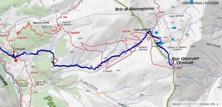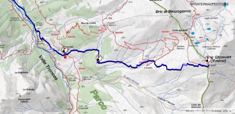 Il Ghinivert, o Eiminâl come localmente veniva anche chiamato, è la più alta montagna dello spartiacque Chisone-Germanasca. Questo bel percorso, che si sviluppa in un ambiente di notevole interesse naturalistico e storico, può essere anche molto interessante dal lato alpinistico se si percorre la variante primaverile data in calce all’itinerario principale, che risale il bel canale nord della montagna.