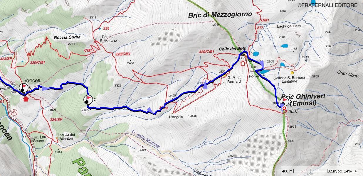Per il percorso di salita. Volendo, giunti sul costone ovest della Punta del Beth (detta anche Bric di Mezzogiorno), anziché seguire l’itinerario di salita è possibile scendere per pendii gradualmente più ripidi sino alla confluenza fra il canale del Beth e quello del Vallone di Charnier, e da qui, prendendo a destra, raggiungere gli ampi pendii sottostanti Troncea.