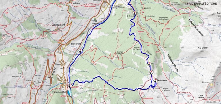 g-h: una volta superato il ponte, abbandonare la pista di fondo e dirigersi sulla traccia di sentiero che costeggia il Chisone sul suo lato destro idrografico. Pochi minuti su traccia in falso piano permettono di ricongiungerci al parcheggio dei trampolini (a seconda delle condizioni, per quest’ultima parte potrebbe valer la pena utilizzare le pelli).