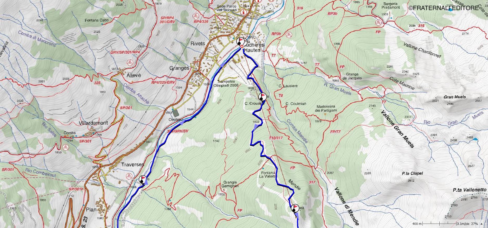 g-h: una volta superato il ponte, abbandonare la pista di fondo e dirigersi sulla traccia di sentiero che costeggia il Chisone sul suo lato destro idrografico. Pochi minuti su traccia in falso piano permettono di ricongiungerci al parcheggio dei trampolini (a seconda delle condizioni, per quest’ultima parte potrebbe valer la pena utilizzare le pelli).