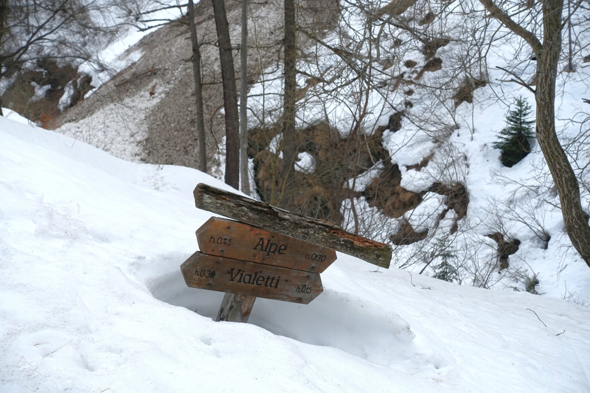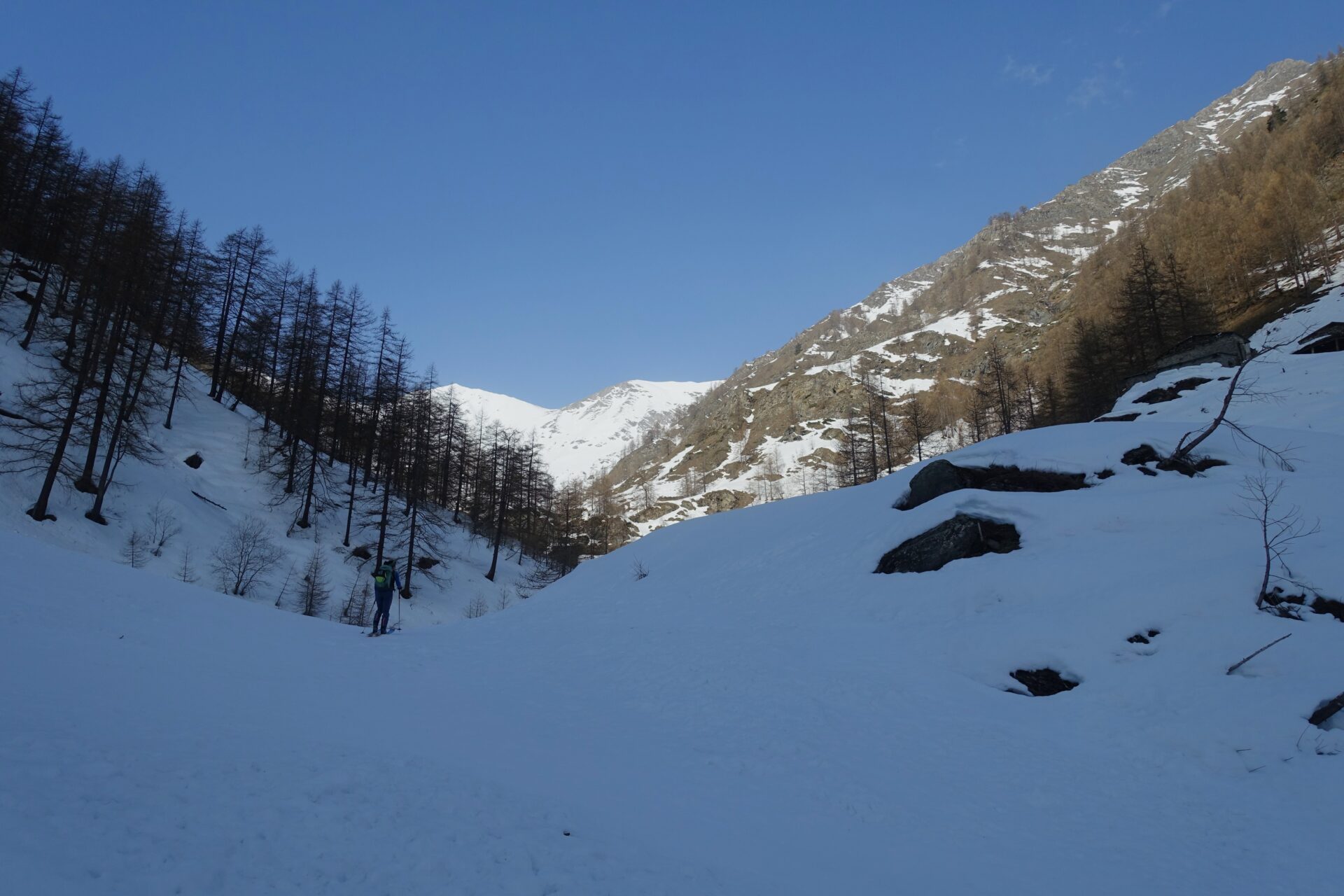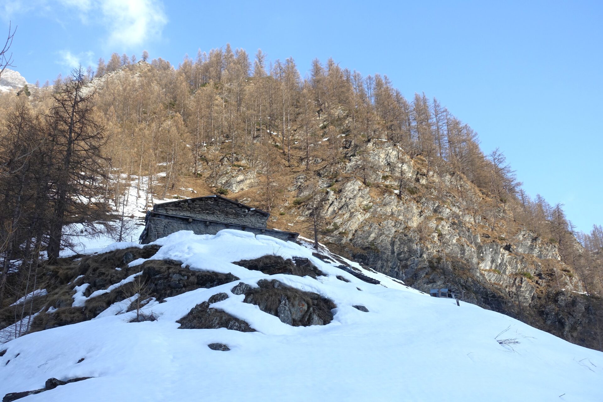 b-c: Seguire le indicazioni verso destra per l’Alpe Vialetti e continuare sul sentiero estivo che, con alcuni saliscendi, costeggia il torrente. Imboccare il ponticello e passare dall’altro versante continuando a seguire, grosso modo, il sentiero estivo, che mantiene la sponda sinistra orografica del vallone. In questa sezione di itinerario si attraversano diversi canali di valanga. Continuare fino a raggiungere l’Alpe Vialetti: per l’accesso a questo primo alpeggio potrebbe essere più agevole scendere a livello del torrente, nel caso sia debitamente coperto da accumuli.