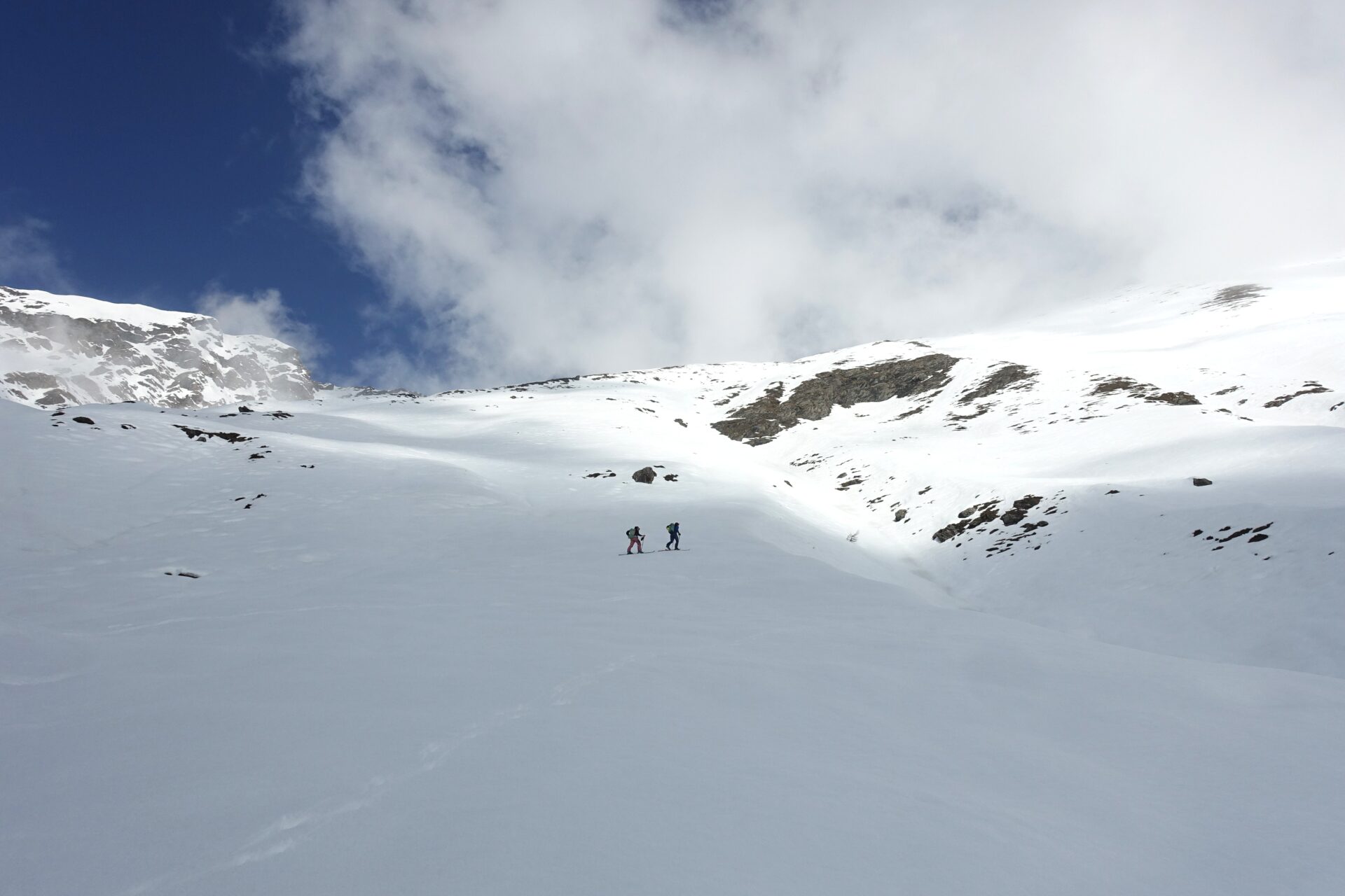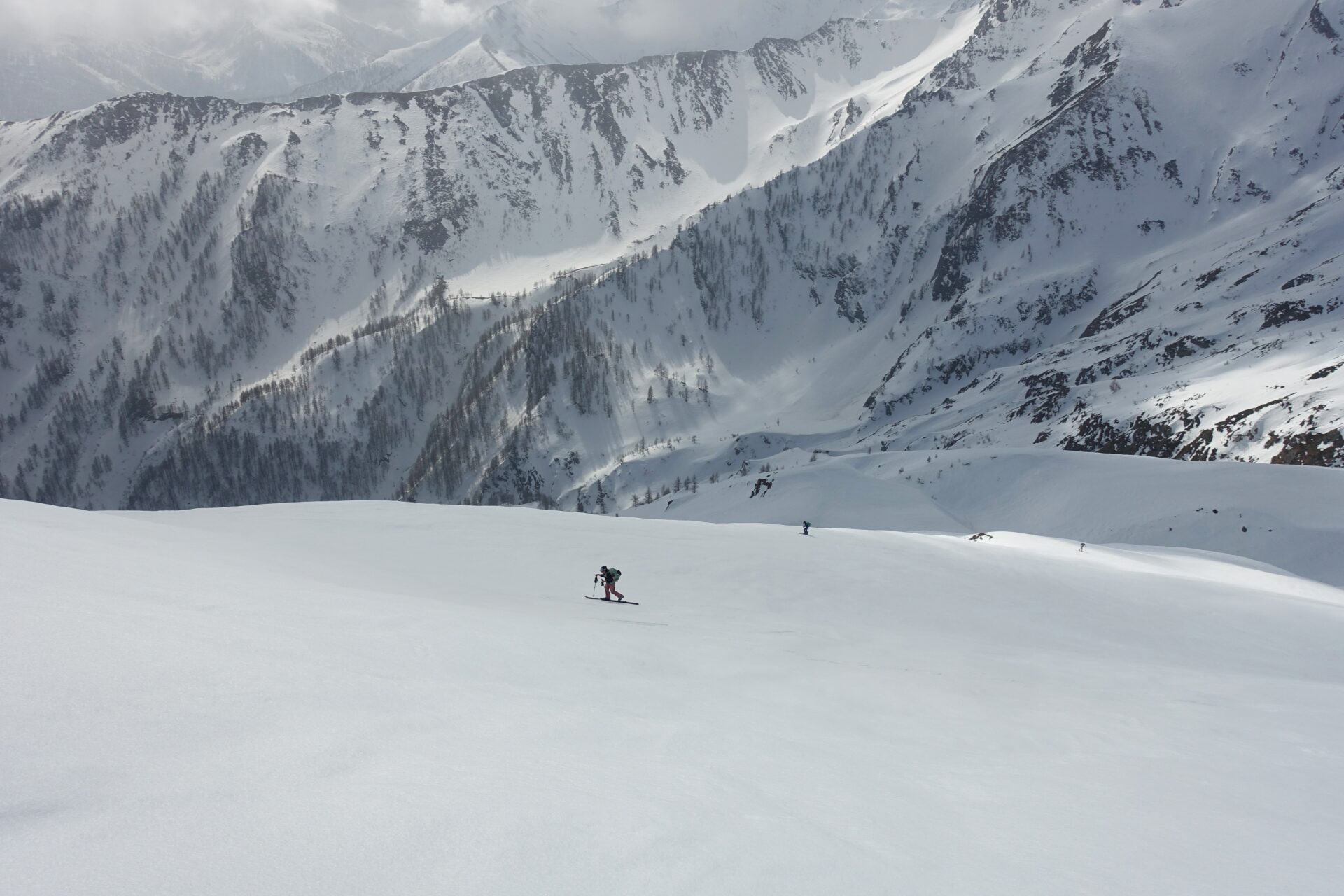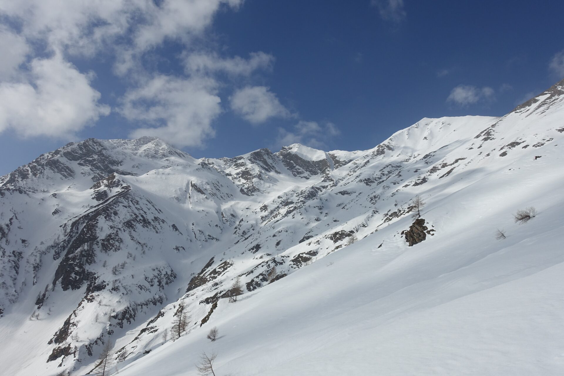 d-e: Giunti all’Alpe di Salza comincia la parte remunerativa dell’itinerario, il vallone si allarga con la vista dominata dalla mole del Pignerol. Continuare a salire in mezza costa in direzione ovest, su pendii finalmente ampi e dolci e, attraversando ancora alcuni canali con le relative colate, portarsi alla base dello splendido pendio sud del Monte Fournet, su ampi ripiani, circa a quota 1.960 m.