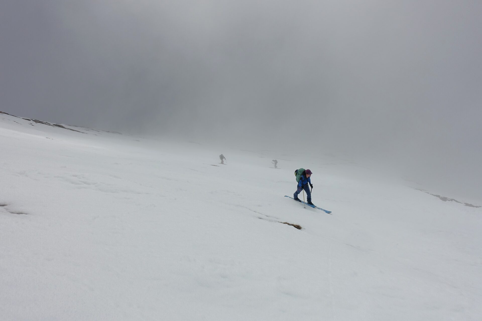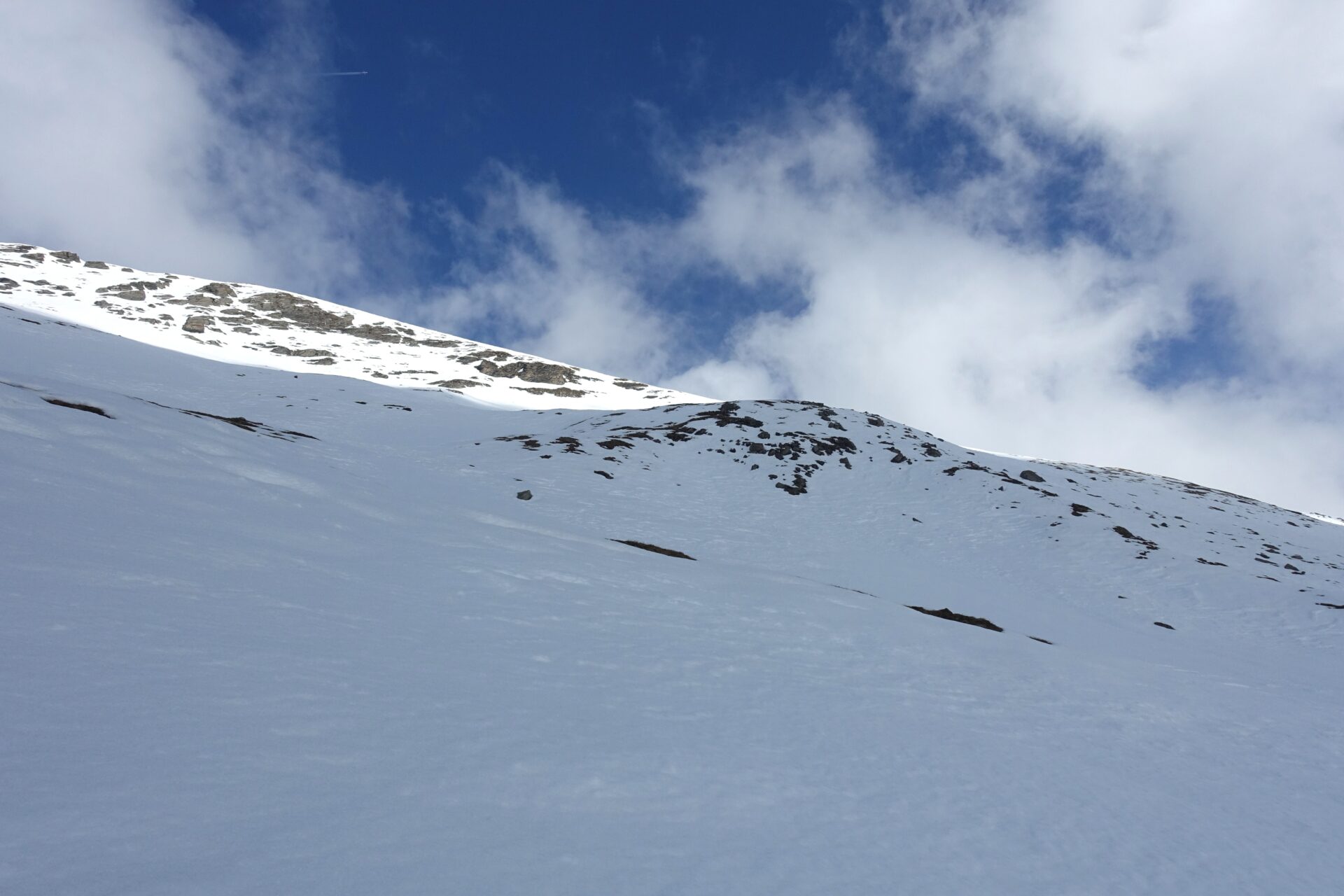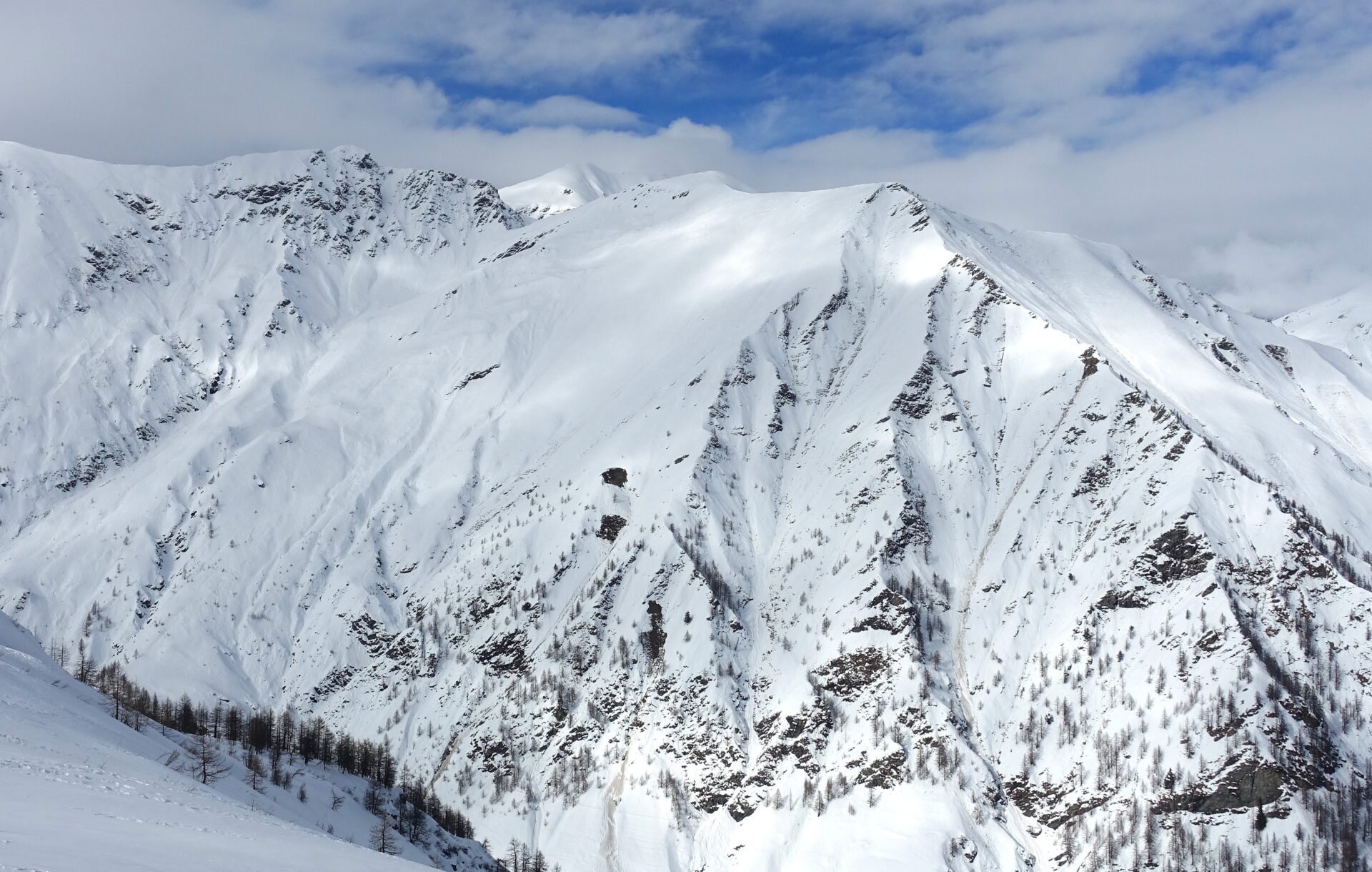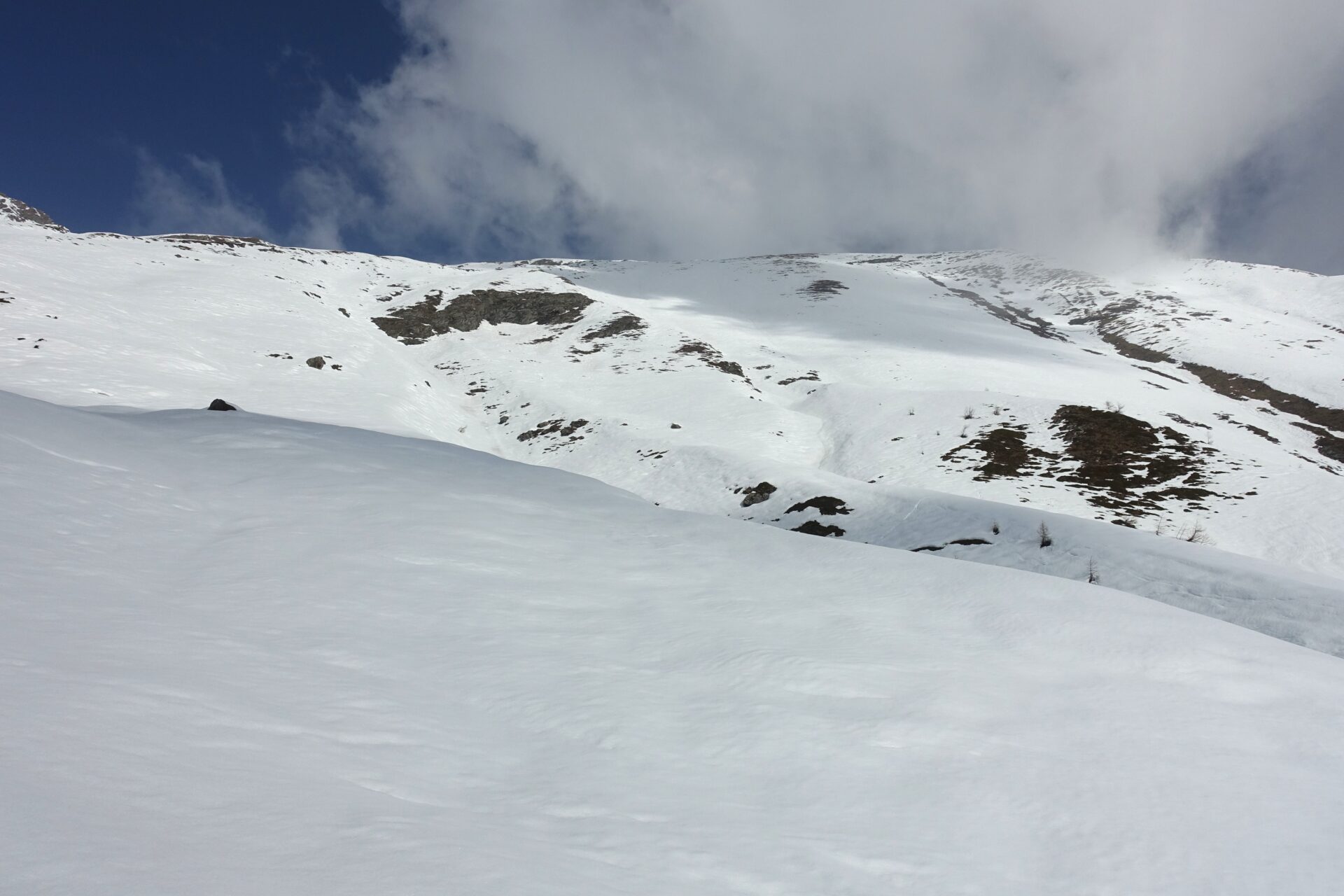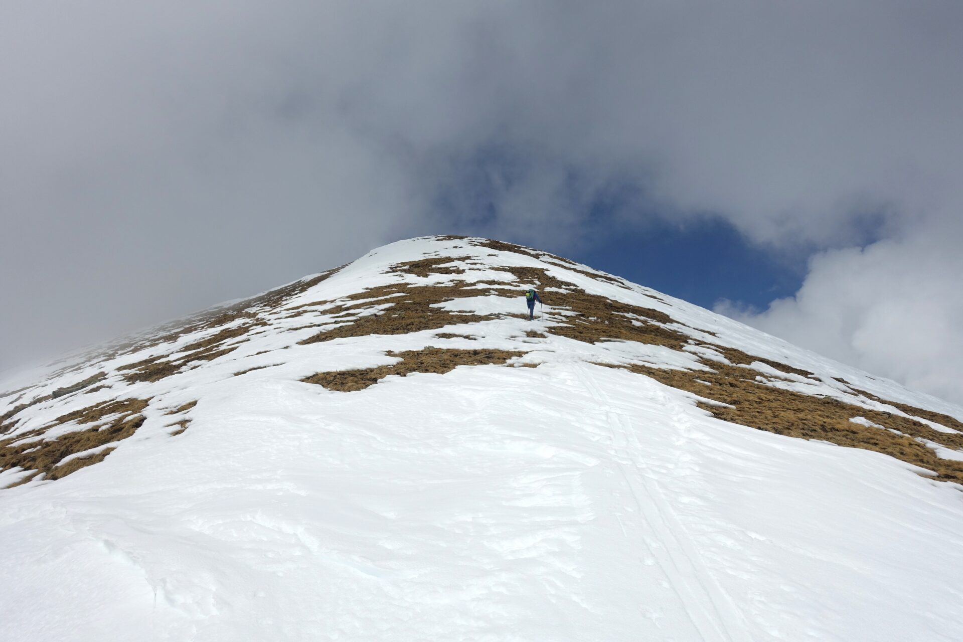 e-f: Pur non apparendo così evidente dal basso, di qui, senza percorso obbligato è possibile concatenare una serie di dossi e piccoli pendii che man mano si rivelano, salendo con pendenze sempre modeste e mantenendo, grosso modo, il lato sinistro del pendio (sguardo a monte). Il percorso non è obbligato e si presta a numerose interpretazioni. Nell’ultima parte, la serie di dossi e vallette porta poi a spostarsi verso destra (sguardo a monte) puntando alla cresta sommitale fino ad uscire dove è più agevole, su medie pendenze, leggermente a destra della vetta (a sud-est di questa). Con un ultimo breve tratto verso sinistra, sulla dorsale spartiacque, si raggiunge la cima.