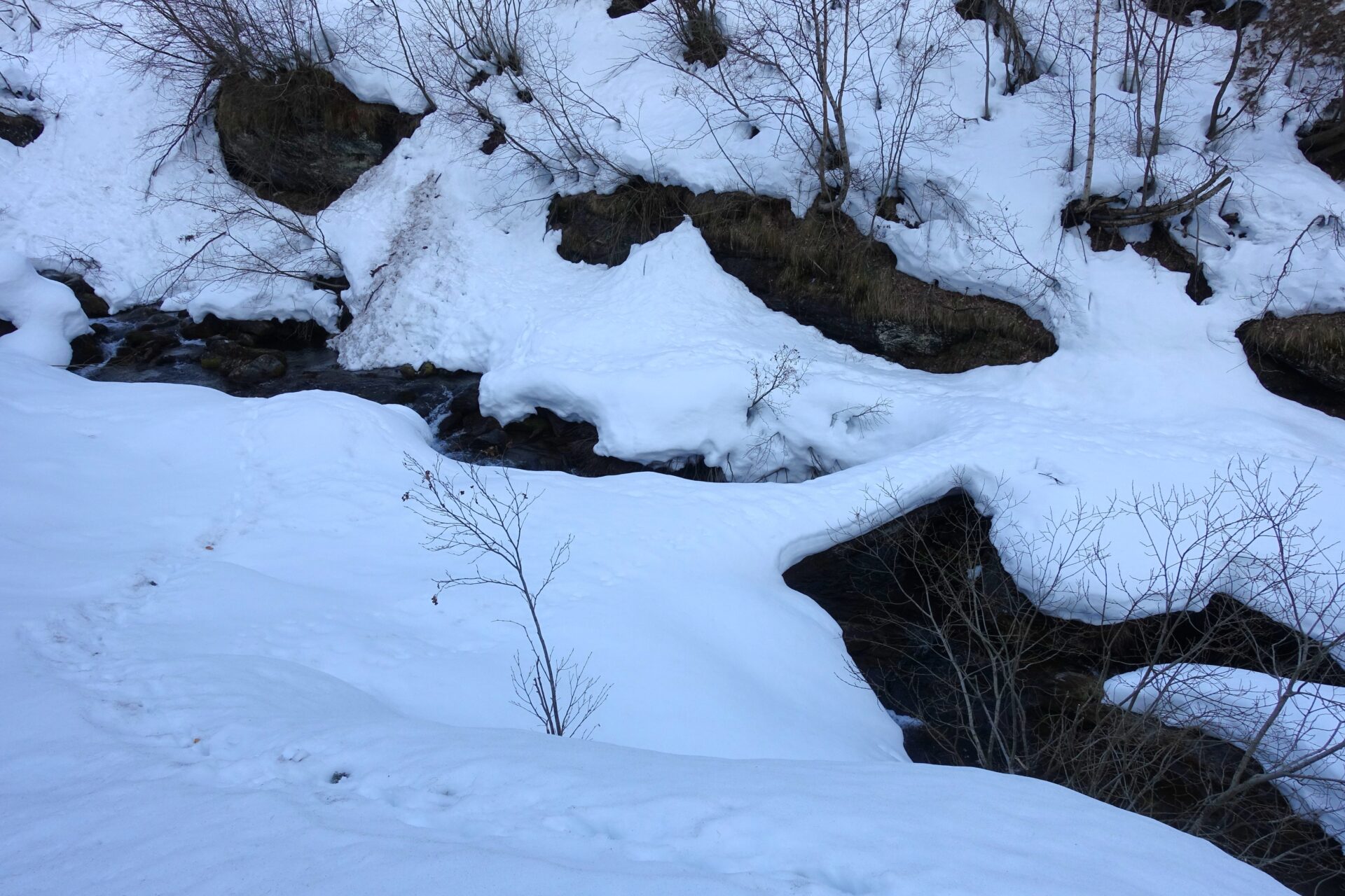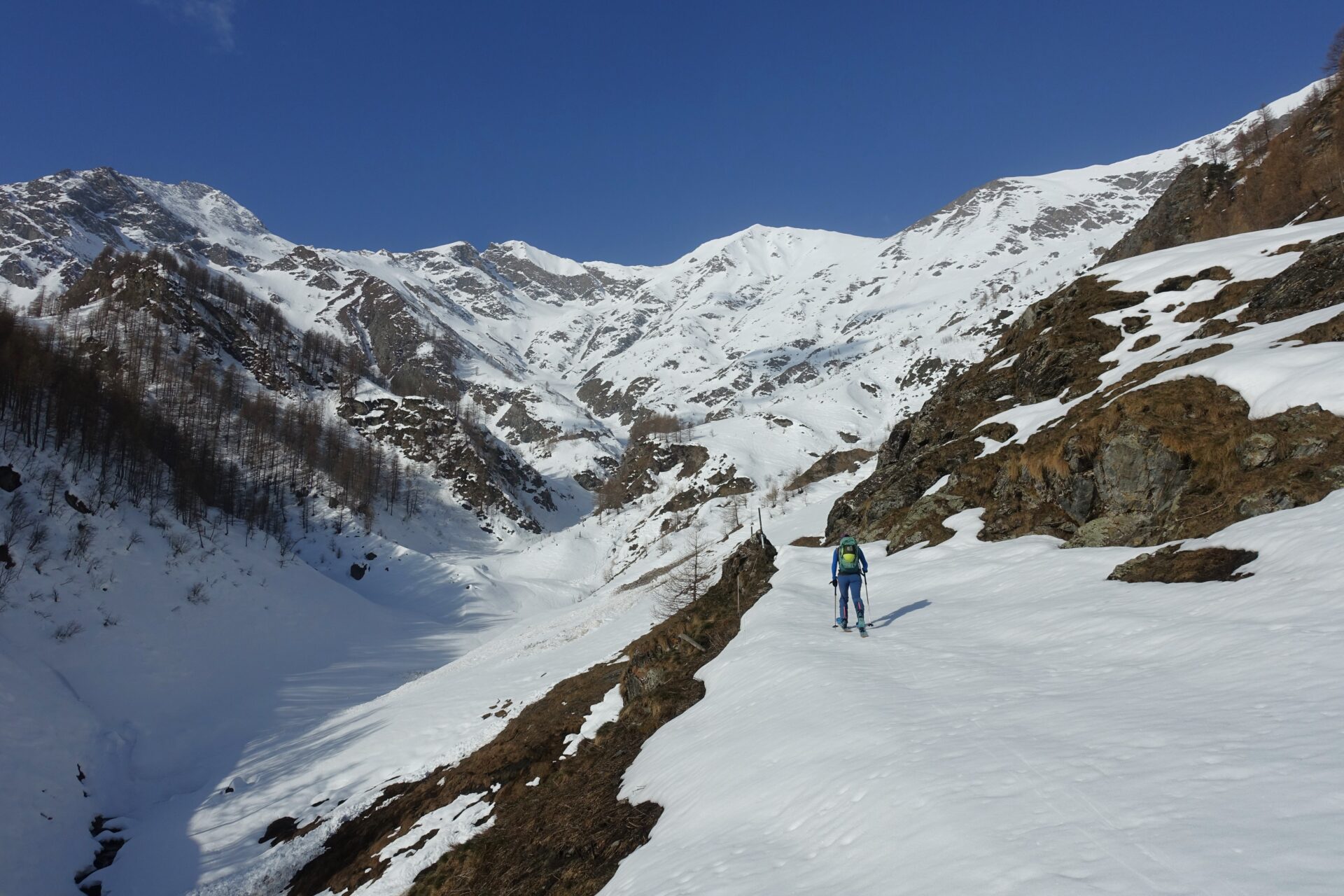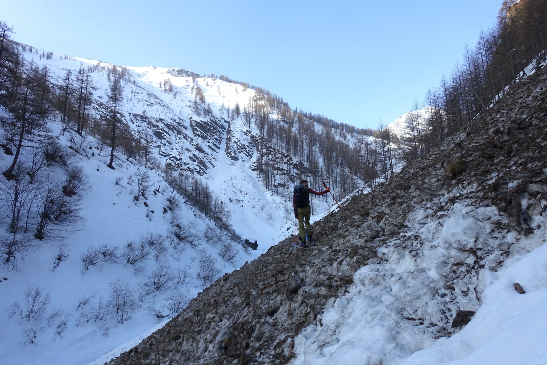 c-d: Dall’Alpe Vialetti, continuare sul sentiero estivo fino all’Alpe di Salza, attraversantdo ancora alcuni canali con relative colate di neve. Attenzione a non farsi attirare dal fondovalle, qui più ampio e con il torrente spesso coperto, perché poco oltre una gola sbarra l’accesso e non permette di proseguire.