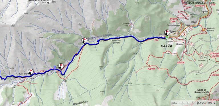 a-b: Dalla borgata Coppi si prende a seguire la strada forestale che si inoltra nel vallone e che, quasi subito, attraversa un ponte per portarsi sul lato destro orografico della valle. Trascurando le deviazioni secondarie, si continua a seguire la strada e si oltrepassa un acquedotto. Il tracciato diviene poi sentiero che, con alcune ripide e strette svolte (cautela in discesa), sale nel bosco e, sempre per questo, si oltrepassa una strettoia seguita da un falsopiano, sino a giungere al bivio per l’Alpe Vialetti e l’Alpe di Salza, a quota 1.570 circa.