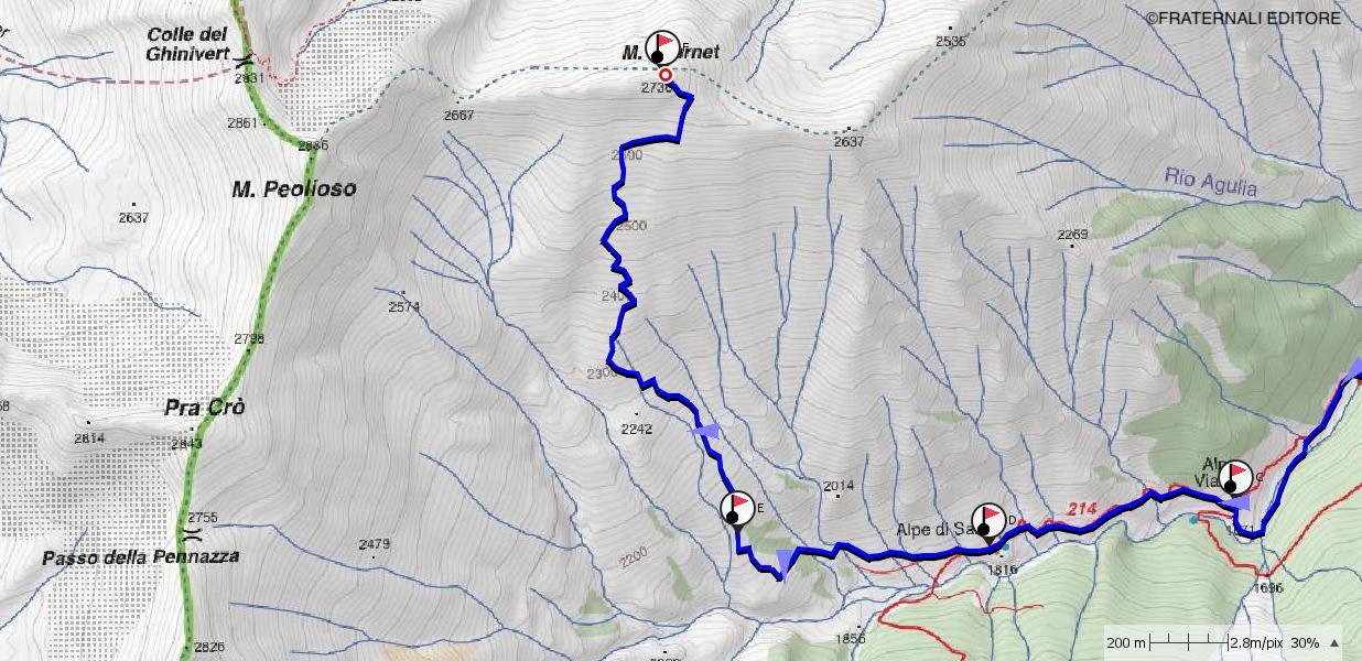 e-f: Pur non apparendo così evidente dal basso, di qui, senza percorso obbligato è possibile concatenare una serie di dossi e piccoli pendii che man mano si rivelano, salendo con pendenze sempre modeste e mantenendo, grosso modo, il lato sinistro del pendio (sguardo a monte). Il percorso non è obbligato e si presta a numerose interpretazioni. Nell’ultima parte, la serie di dossi e vallette porta poi a spostarsi verso destra (sguardo a monte) puntando alla cresta sommitale fino ad uscire dove è più agevole, su medie pendenze, leggermente a destra della vetta (a sud-est di questa). Con un ultimo breve tratto verso sinistra, sulla dorsale spartiacque, si raggiunge la cima.
