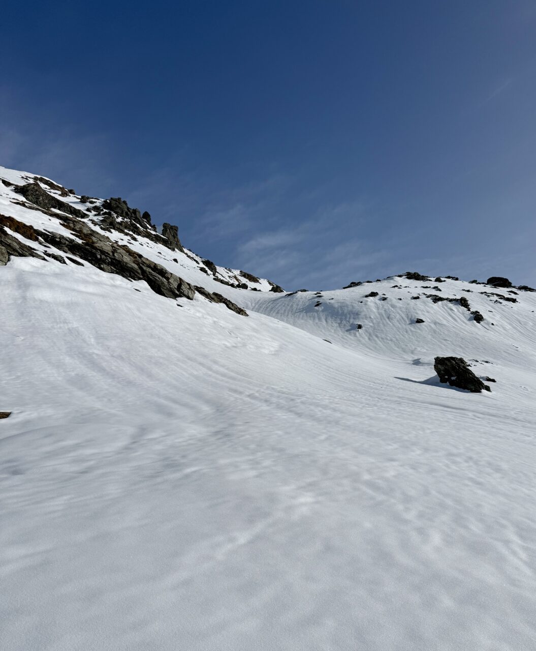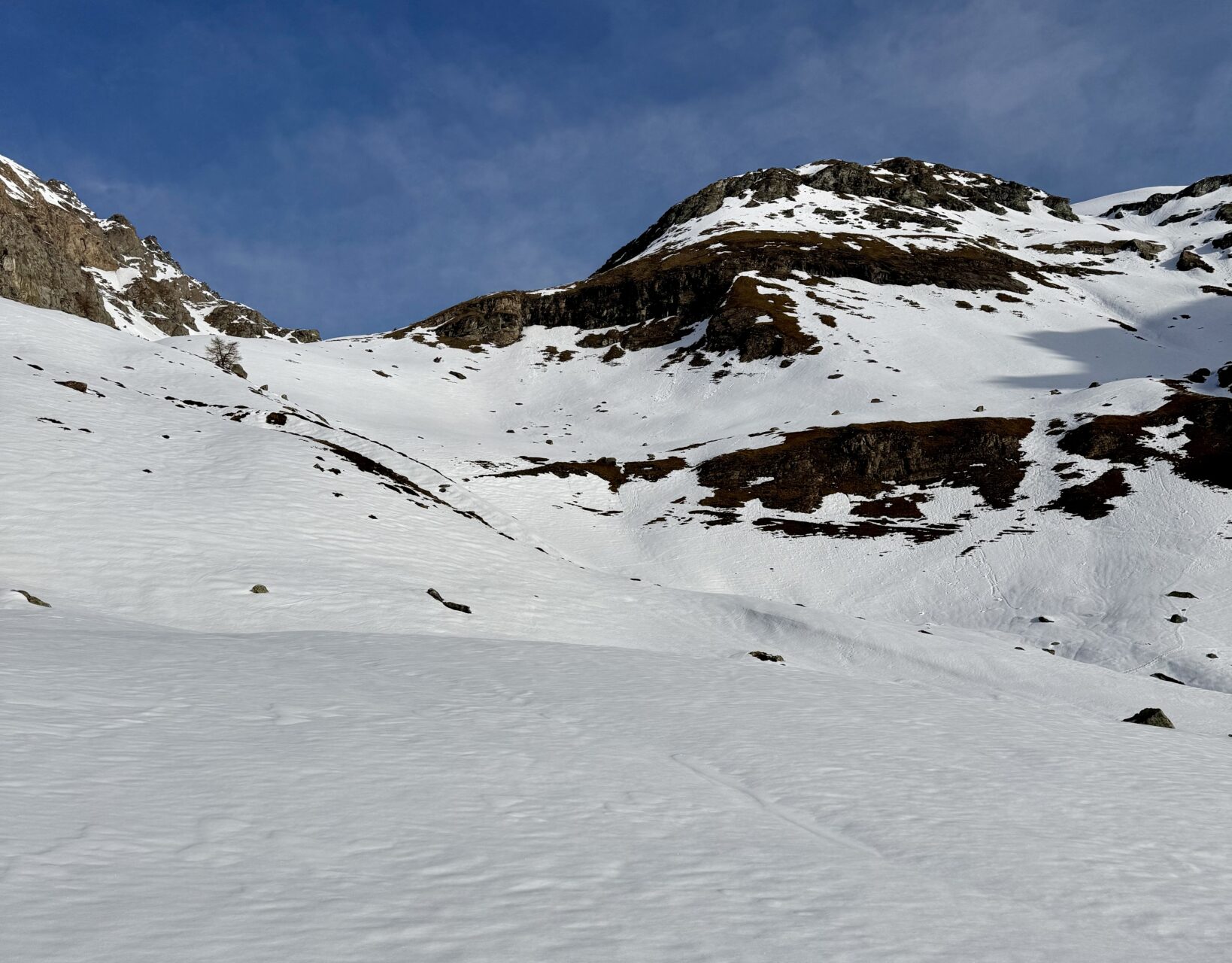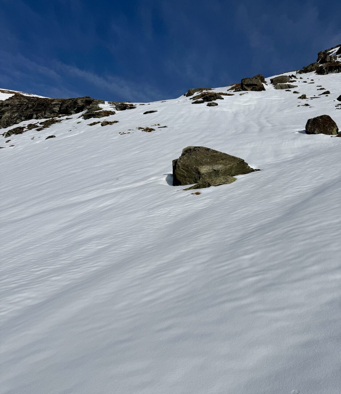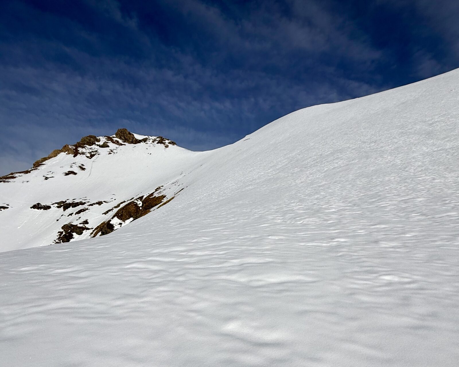 e-f: A quota 2.500 m circa, in uscita su un colletto tra vari massi evidenti si tiene ancora sinistra (ovest) per superare con un traverso ripido delle balze rocciose, un passaggio che permette di raggiungere l´ampio e bellissimo pendio finale prima della dorsale che sale dal colle del Sabbione. Pendio però da non sottovalutare per pendenza, ampiezza e esposizione in pieno sud. Risalito con la traccia migliore il pendio si raggiunge il culmine della dorsale.