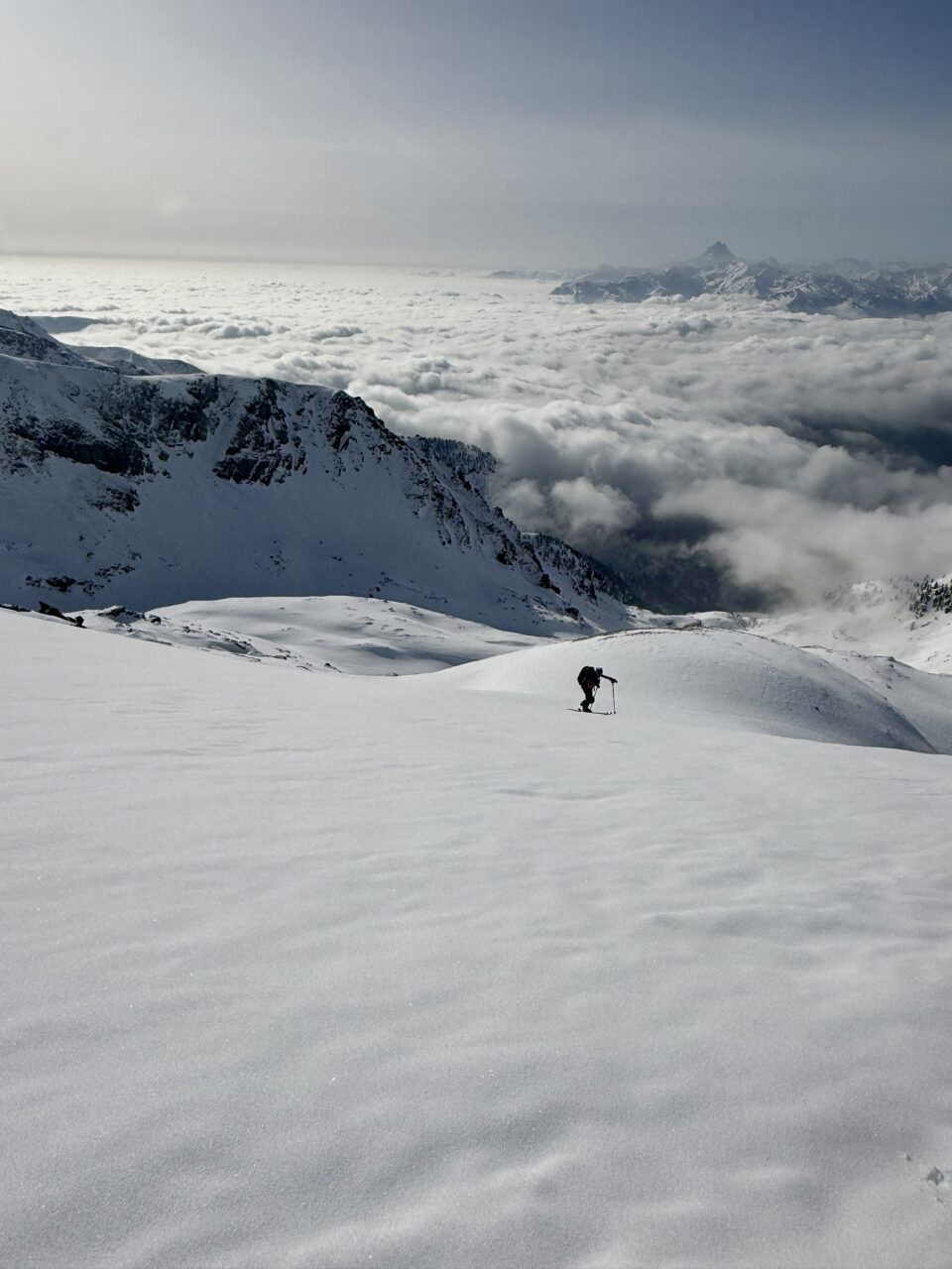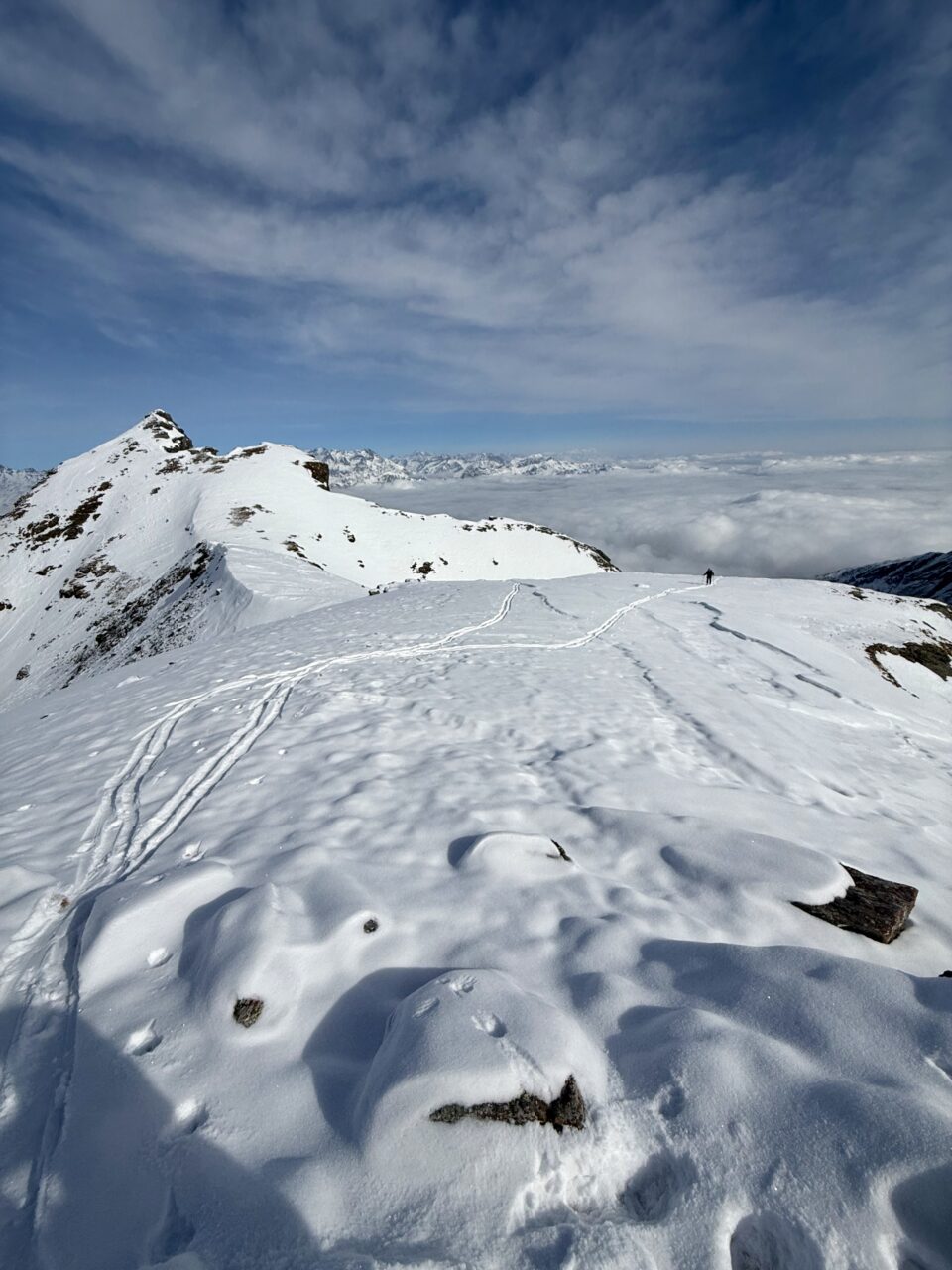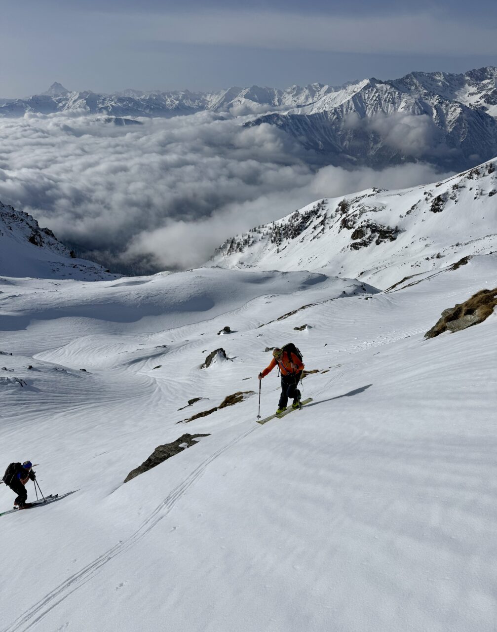 e-f: A quota 2.500 m circa, in uscita su un colletto tra vari massi evidenti si tiene ancora sinistra (ovest) per superare con un traverso ripido delle balze rocciose, un passaggio che permette di raggiungere l´ampio e bellissimo pendio finale prima della dorsale che sale dal colle del Sabbione. Pendio però da non sottovalutare per pendenza, ampiezza e esposizione in pieno sud. Risalito con la traccia migliore il pendio si raggiunge il culmine della dorsale.