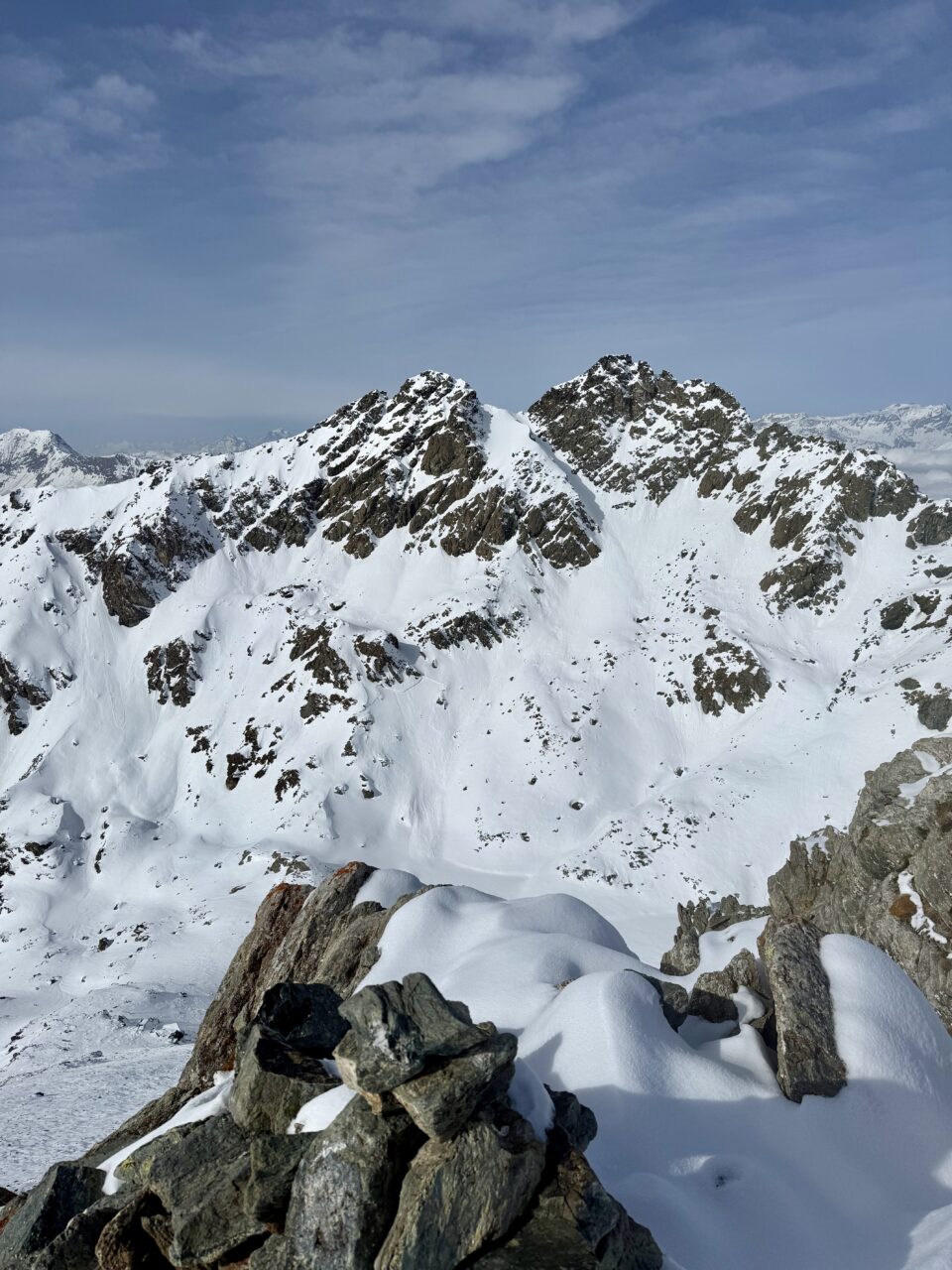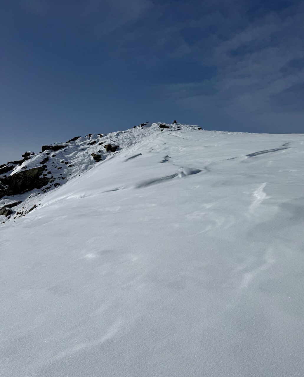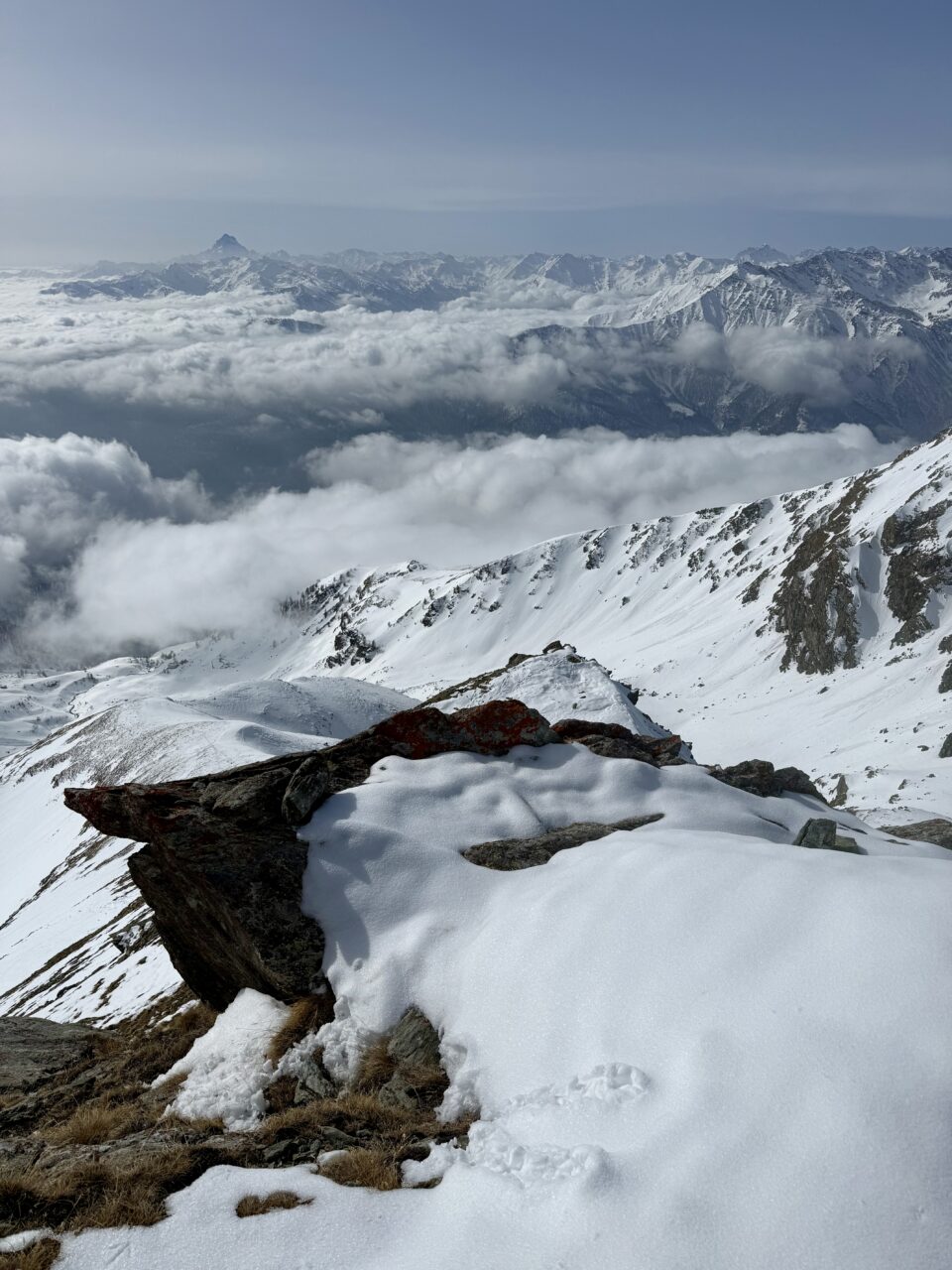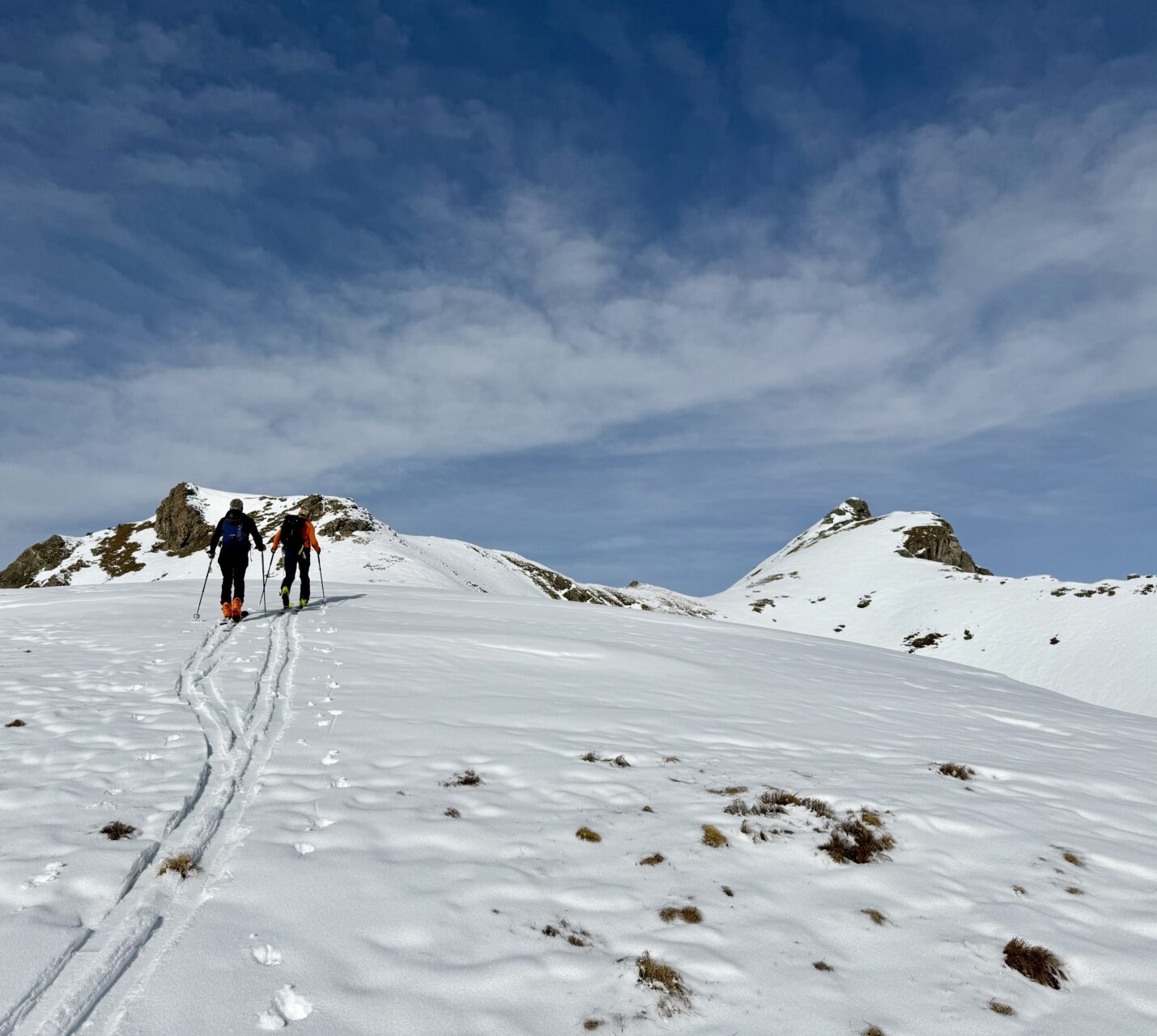 e-f: A quota 2.500 m circa, in uscita su un colletto tra vari massi evidenti si tiene ancora sinistra (ovest) per superare con un traverso ripido delle balze rocciose, un passaggio che permette di raggiungere l´ampio e bellissimo pendio finale prima della dorsale che sale dal colle del Sabbione. Pendio però da non sottovalutare per pendenza, ampiezza e esposizione in pieno sud. Risalito con la traccia migliore il pendio si raggiunge il culmine della dorsale.