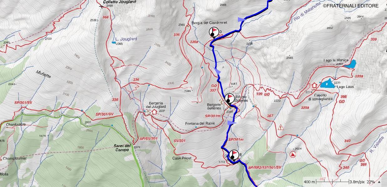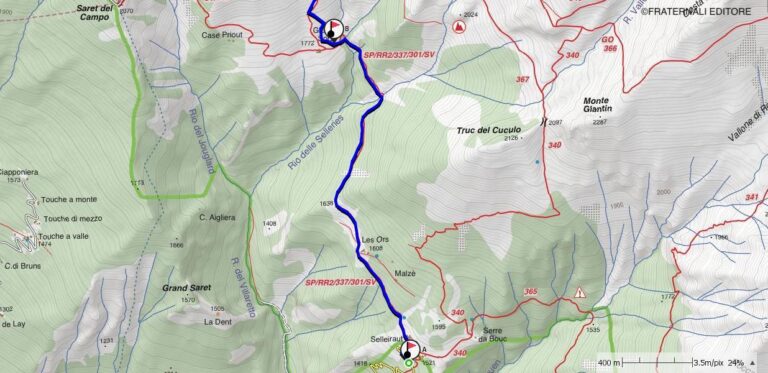 a-b: Dal Parcheggio sotto le case di Selleiraut salire fino all’abitato, attraversarlo e imboccare la traccia della mulattiera estiva n. 337 (in direzione Rifugio Selleries) che transita presso la bucolica borgata di Les Ors a circa 1.600 m. Di qui continuare a seguire la mulattiera che comincia ad attraversare in mezza costa le pendici nord-ovest del Truc del Cuculo. Dopo poco, la mulattiera piega su versanti più all’ombra dove la neve permane di più e si può generalmente scorrere in salita e in discesa con gli sci. Raggiunto il ponte sul Rio delle Vallette, posto a quota 1.690 m circa lo si attraversa e si prosegue (notando la lapide sulla destra del giovane partigiano Domenico Folis morto per la nostra libertà a 22 anni), raggiungendo il guado del rio delle Selleries a circa 1.750 m. Di qui, con un diagonale esposto, ci si porta sul versante opposto, e si risalgono i bei pendii dove sorgono le ex grange Sors 1.770 m. Il tratto di mulattiera, da ben dopo le Grange Ors, fino oltre il guado del rio delle Selleries richiede particolare attenzione nel valutare gli attraversamenti di alcune canalette e un canalone potenzialmente valanghivi.
