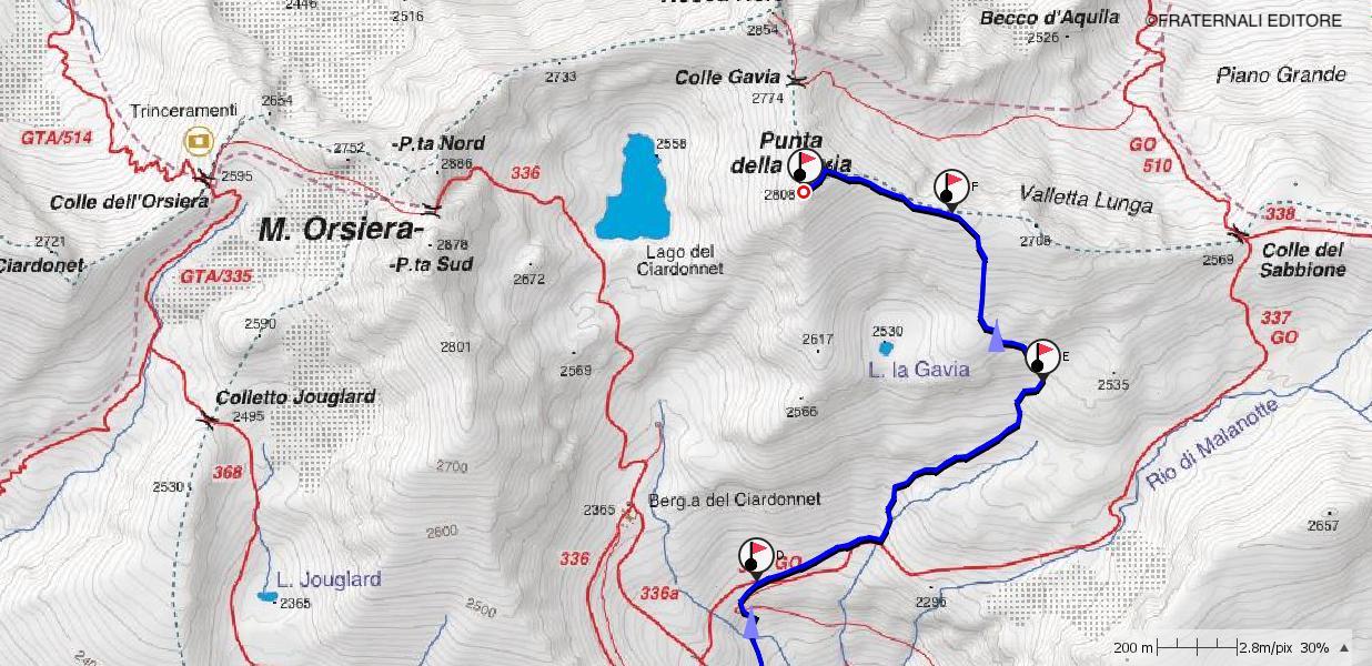 f-g: Si svolta sempre e decisamente a sinistra (est) per percorrere la dorsale pianeggiante da cui si apre la vista sulla Punta della Gavia a sinistra e Rocca Nera a destra con al centro il colle della Gavia. La salita si conclude con un ultimo tratto di dorsale che, in leggera discesa, porta ad un colletto esposto sui versanti nord della val Susa e con la risalita alla punta aggirando a destra le roccette sommitali.