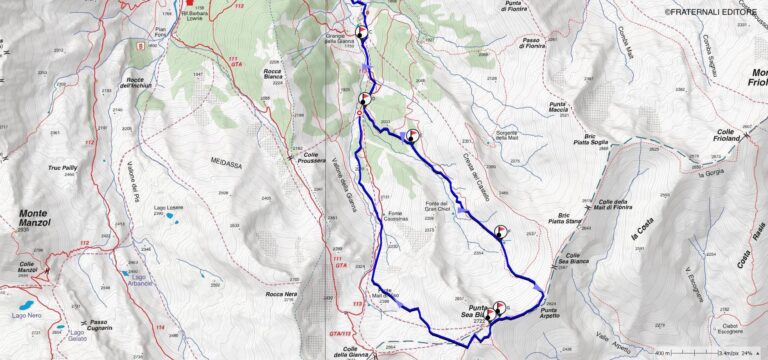 a-b: Dal punto di partenza (variabile a seconda della percorribilità in auto) raggiungere, seguendo a grandi linee il percorso della strada asfaltata, il ponte sul Rio Guicciard, che scende dalla conca del Rifugio Barbara a quota 1.500 m