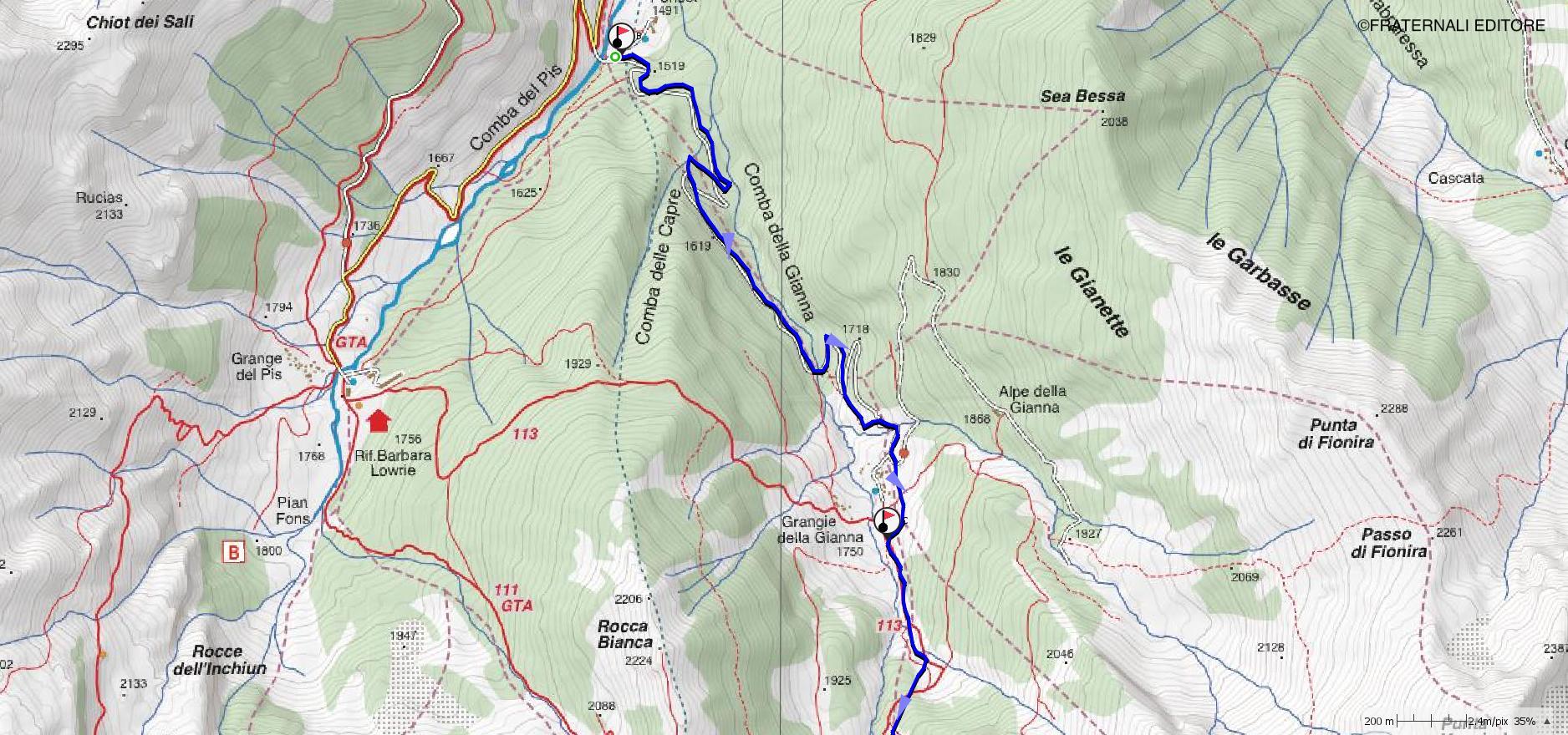 a-b: Dal punto di partenza (variabile a seconda della percorribilità in auto) raggiungere, seguendo a grandi linee il percorso della strada asfaltata, il ponte sul Rio Guicciard, che scende dalla conca del Rifugio Barbara a quota 1.500 m