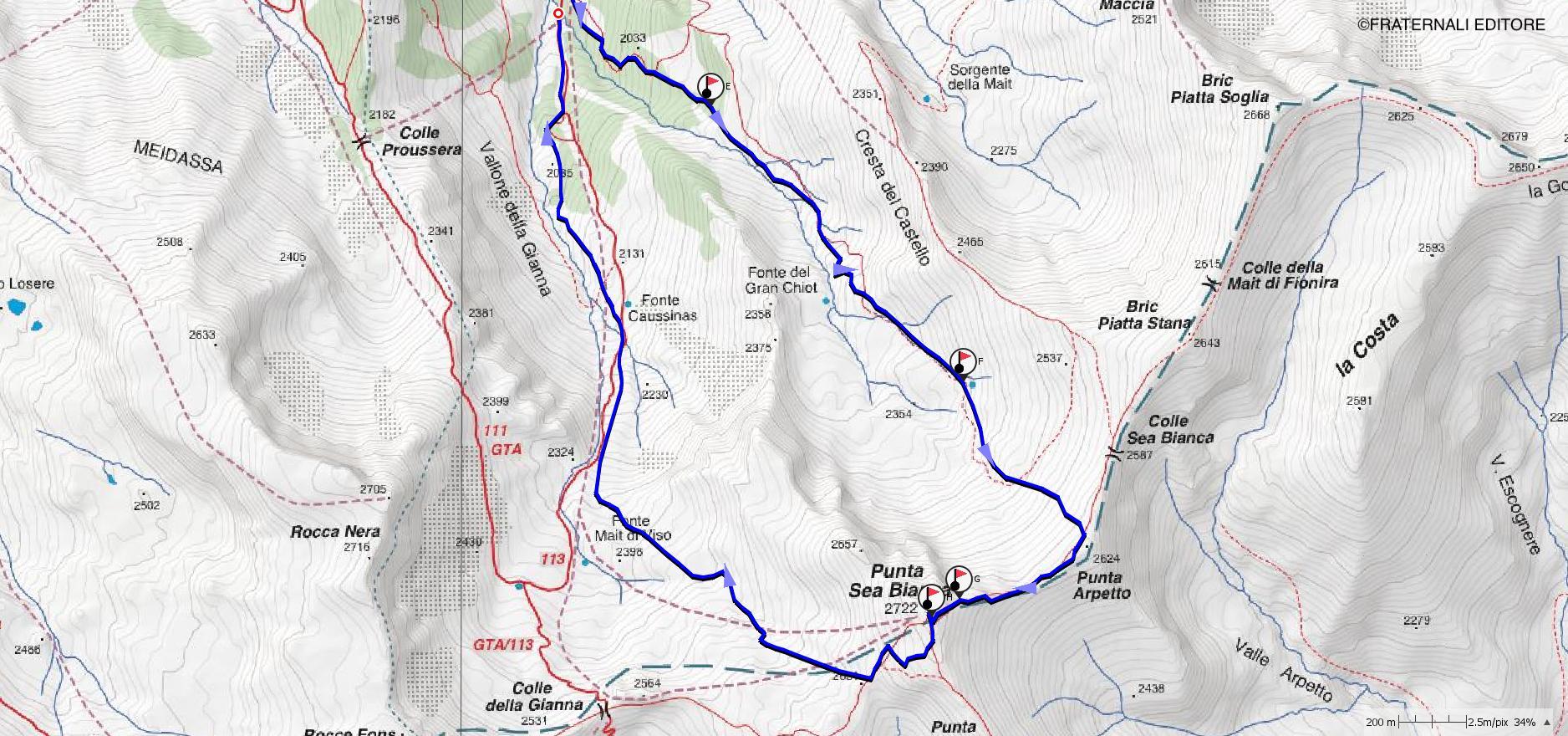 f-g: A questo punto è necessario proseguire dritto per il pendio nord-ovest della punta Arpetto 2.624 m raggiungendo lo spartiacque con la Val Po, al piede della cresta nord-est della Sea Bianca 2.721 m.