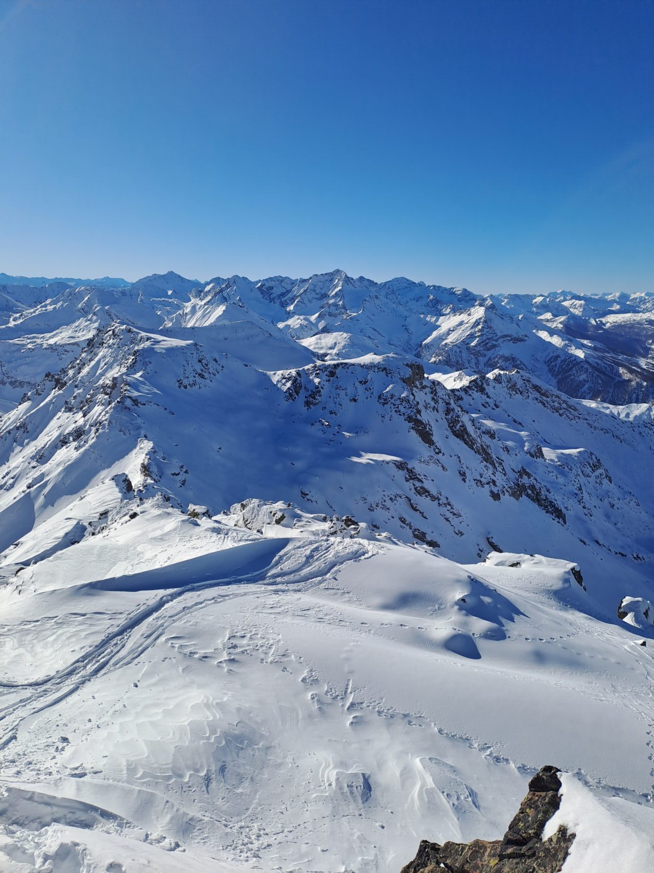 Magnifica sciistica che si sviluppa in un ambiente grandioso, selvaggio e panoramico, sinora nota a pochi scialpinisti. Questa gita non è visibile dal fondo valle e lo è solo parzialmente dalle montagne vicine: forse anche questo ha contribuito a mantenerne l’aspetto di “gita da intenditori locali”. L’ampia conca sospesa della parte alta dell’itinerario sa ripagare ampiamente dello sforzo fatto per risalire le ripide pendici boscose della parte bassa. Rispetto alla storica guida di Eraldo Quero, qui si consiglia la salita dal recentemente segnalato “Sentiero della Madonnina”, che si mantiene sul dosso tra Comba Mendie e Rio Gran Muels, senza passare dalle Grange Jacques. Sfruttando questa nuova possibilità, si può restare nel bosco fino ad una quota più alta rispetto al sentiero classico che sale dalle Grange e accedere al canalone sottostante alla conca sospesa nella sua parte finale, dove si presenta più ampio e agevole. Sfruttando l’esposizione di questa porzione di versante, si può sperare di incontrare neve ad una quota più bassa, in modo da limitare il cosiddetto “portage”.
