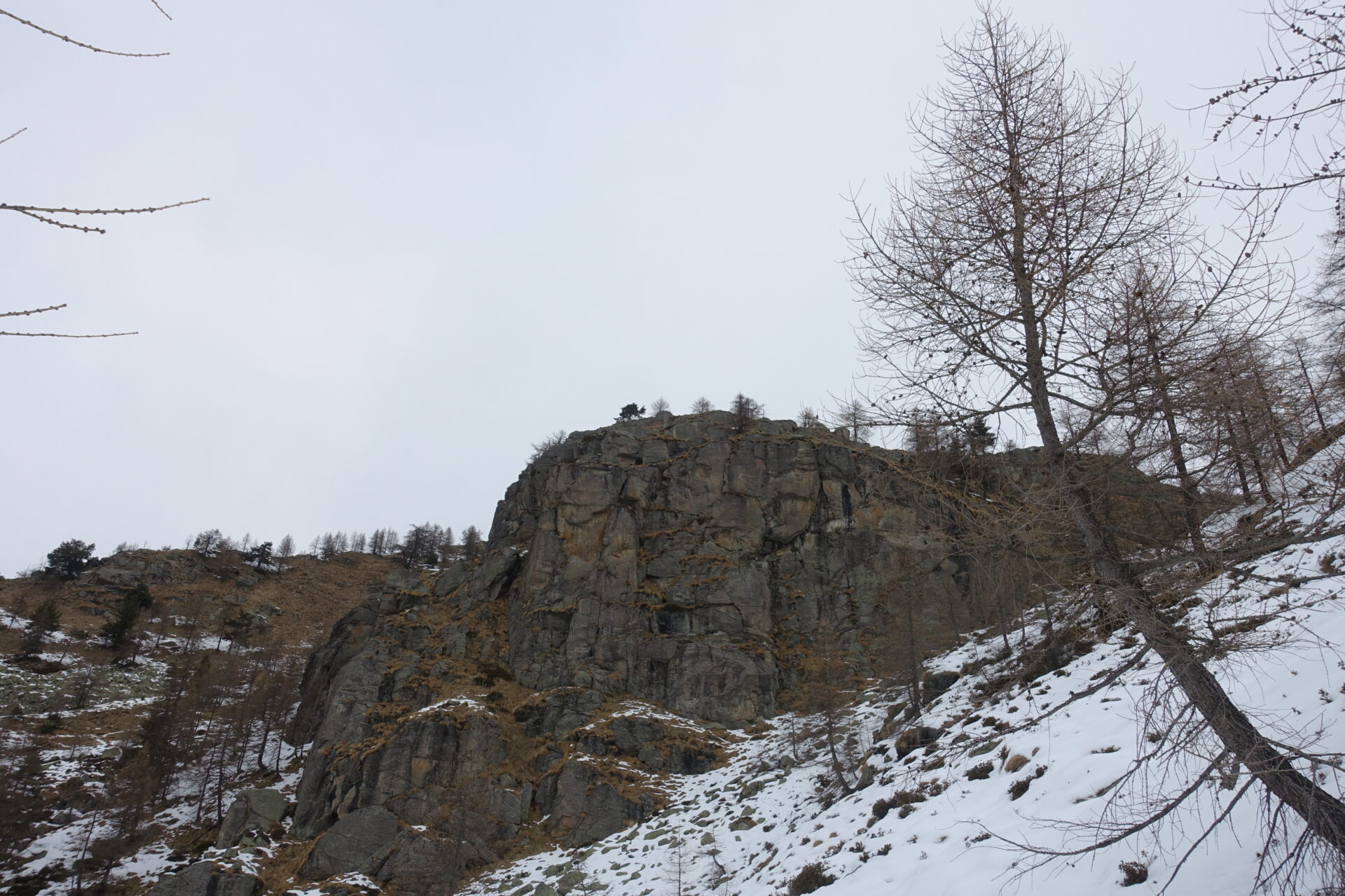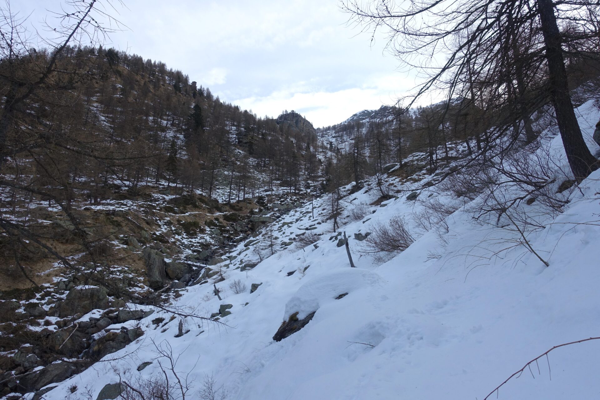 b-c: Senza attraversare il ponte, si inizia a salire sulla destra, in direzione est, puntando a imboccare il valloncello situato tra il caratteristico castello roccioso alla nostra sinistra (struttura che ospita una falesia di arrampicata, quotata 2.024 m sulla carta Fraternali) e il rilievo roccioso che lo sovrasta, appena più in alto a destra. In funzione dell’innevamento, si continua a salire fino a dove è comodo attraversare, in direzione nord-ovest (mantenendo sulla sinistra la struttura rocciosa quotata 2.024 m descritta precedentemente) e si accede al valloncello formato dalle acque del rio che scende dal Lago Laus, arrivando ad un pianoro sottostante il lago a quota 2.200 m circa. Dal pianoro, con un ultimo pendio ripido, si raggiunge la conca del Lago Laus a quota 2.270 m.