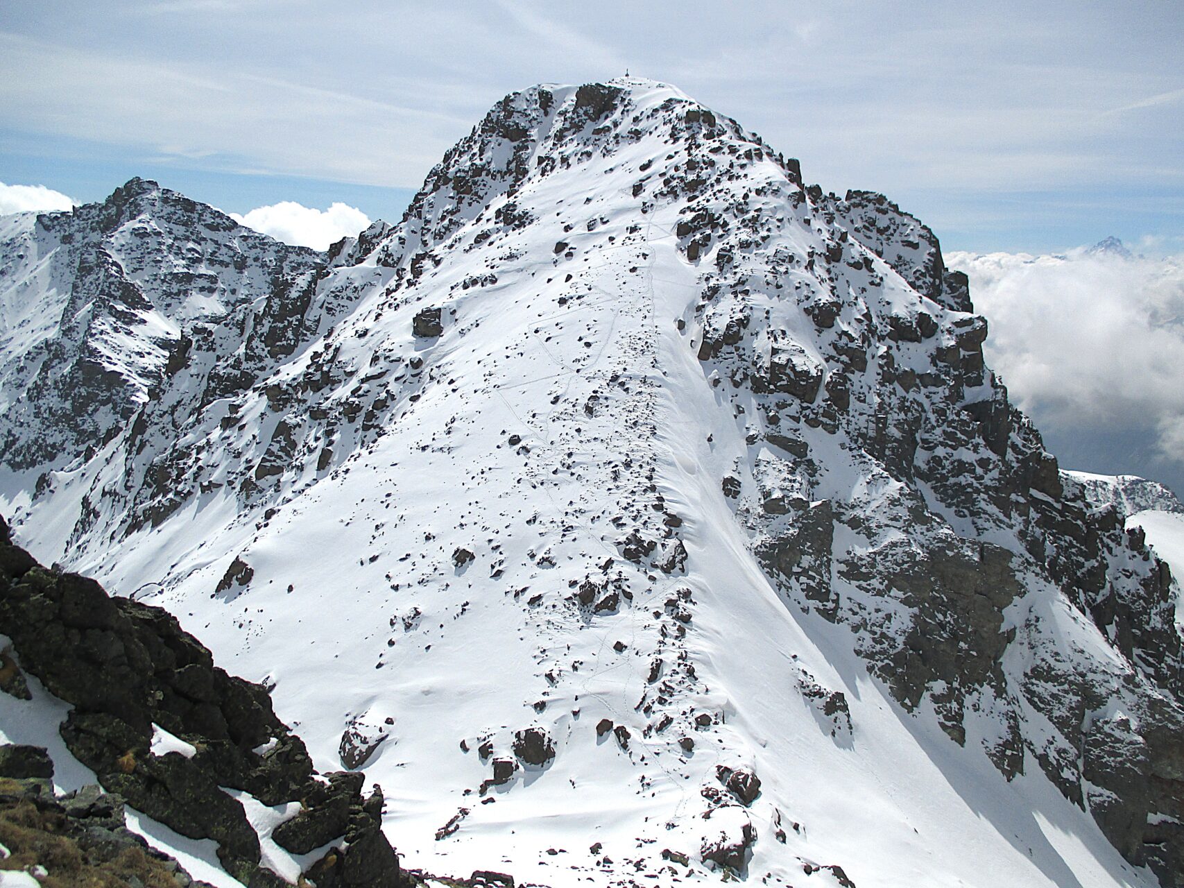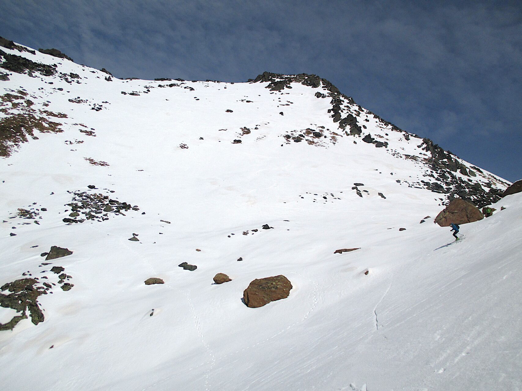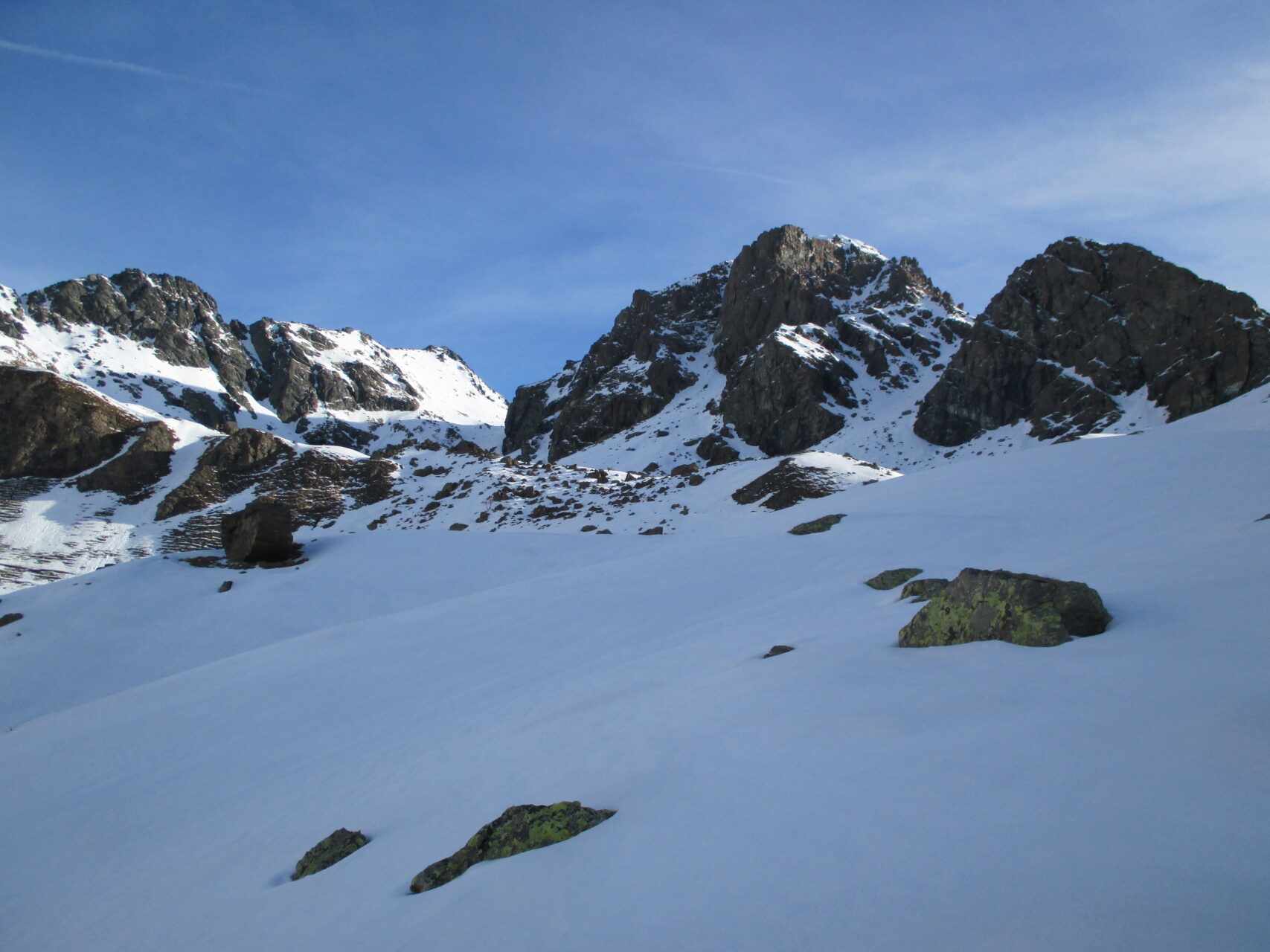 d-e: Attaccare il ripido pendio sud della punta Malanotte. A seconda delle condizioni, risalirlo a piacere, destreggiandosi tra le rocce che affiorano sul pendio, fino alla cresta sommitale. La vetta si raggiunge per roccette facili, tratto per il quale sono utili i ramponi.