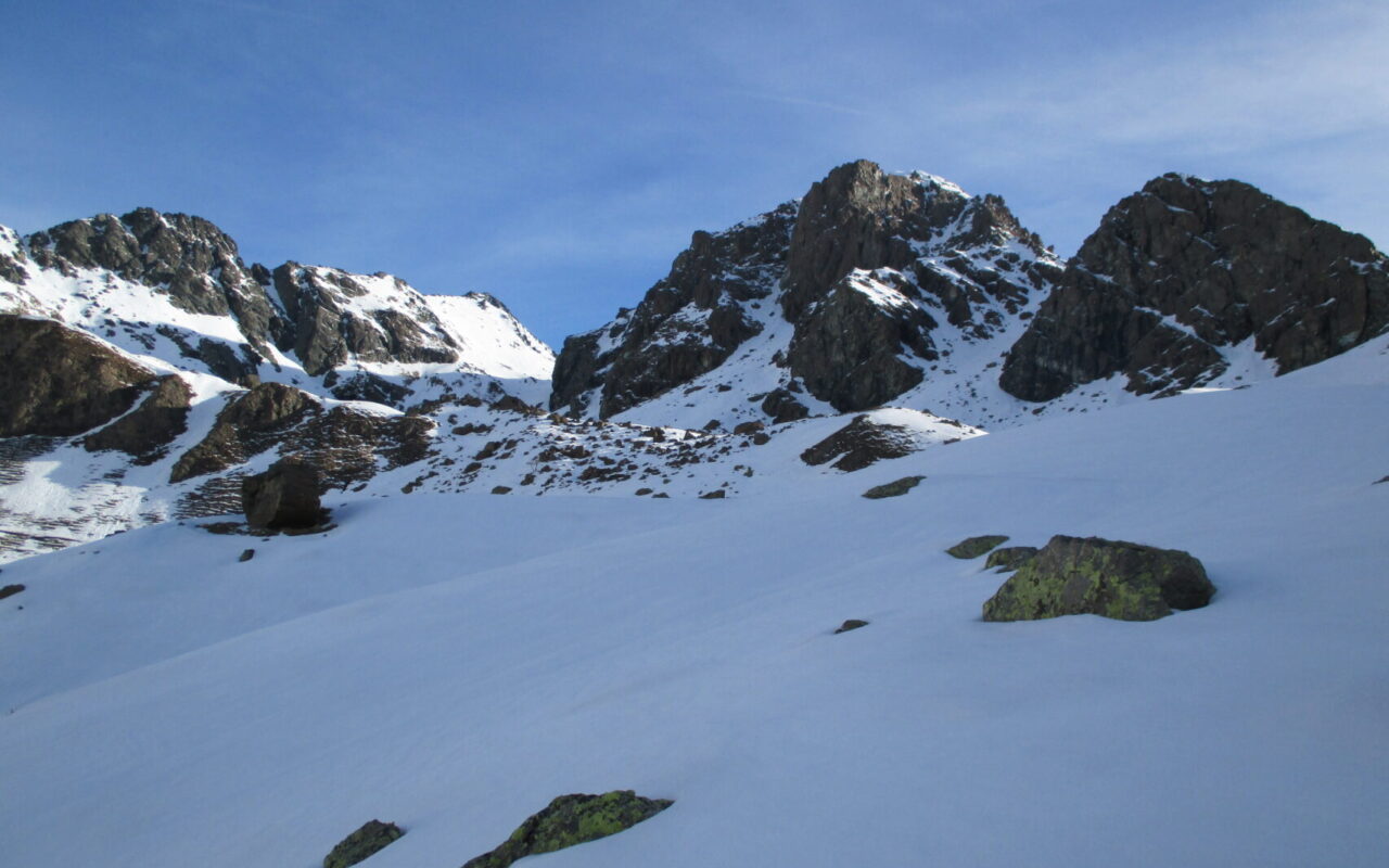 d-e: Attaccare il ripido pendio sud della punta Malanotte. A seconda delle condizioni, risalirlo a piacere, destreggiandosi tra le rocce che affiorano sul pendio, fino alla cresta sommitale. La vetta si raggiunge per roccette facili, tratto per il quale sono utili i ramponi.