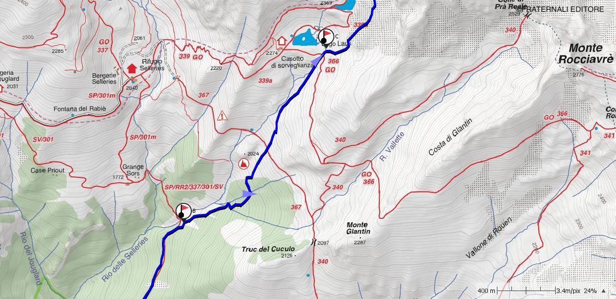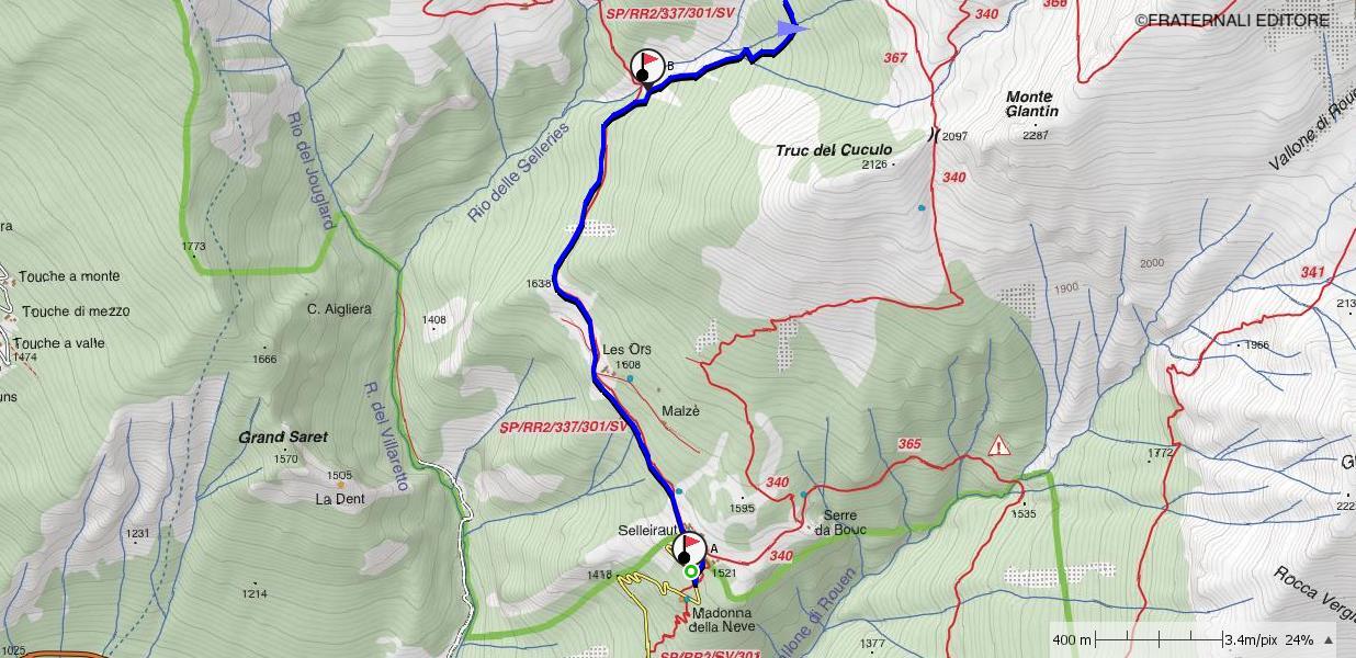 a-b: Dal Parcheggio sotto le case di Selleiraut seguire la strada (o il sentiero che permette di evitare l’asfalto) e, all’uscita dall’abitato, imboccare la traccia della mulattiera estiva transitando presso la bucolica borgata di Les Ors. Di qui continuare a seguire la mulattiera che comincia ad attraversare a mezza costa le pendici nord-ovest del Truc del Cuculo. Continuare fino a giungere al ponte sul Rio delle Vallette, posto a quota 1.690 m circa.
