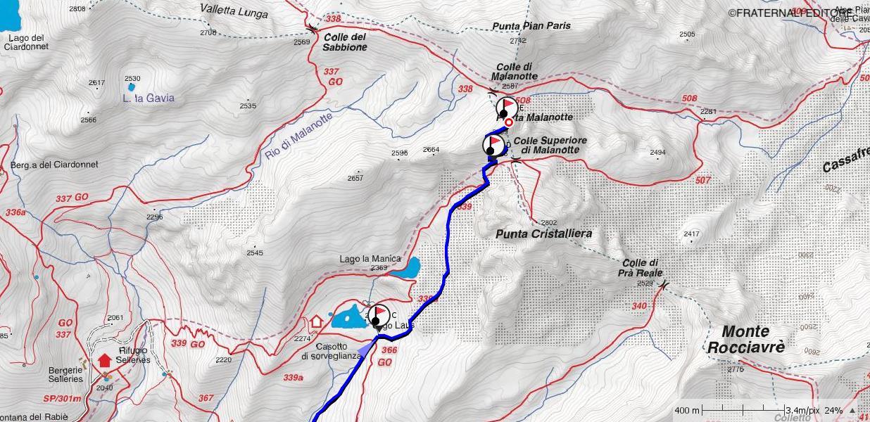 c-d: Di qui, per dossi, su terreno caratterizzato da grossi massi, si continua a salire puntando all’evidente insellatura del Colle Superiore di Malanotte (2.616 m) lasciando sulla nostra sinistra il Lago della Manica (2.370 m). Durante il percorso si costeggia per intero il versante ovest della Cristalliera con il suo caratteristico torrione (emblema dell’alpinismo pinerolese) giungendo infine alla ripida rampa che porta verso il Colle Superiore di Malanotte quotato 2.616 m. Prima del colle, a quota 2.560 m circa, giunti nuovamente su pendenze più dolci, si punta direttamente al pendio sud della Punta Malanotte.