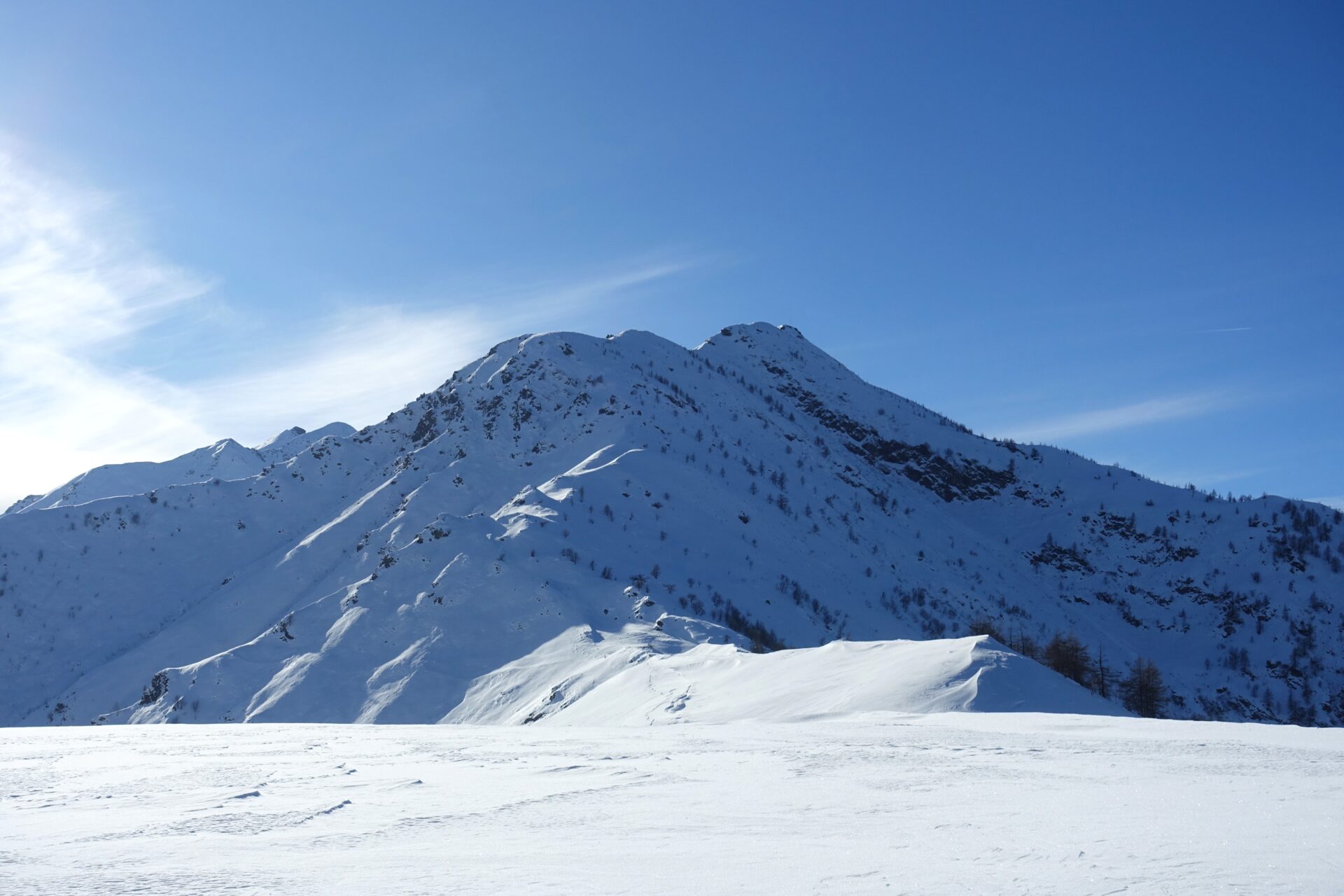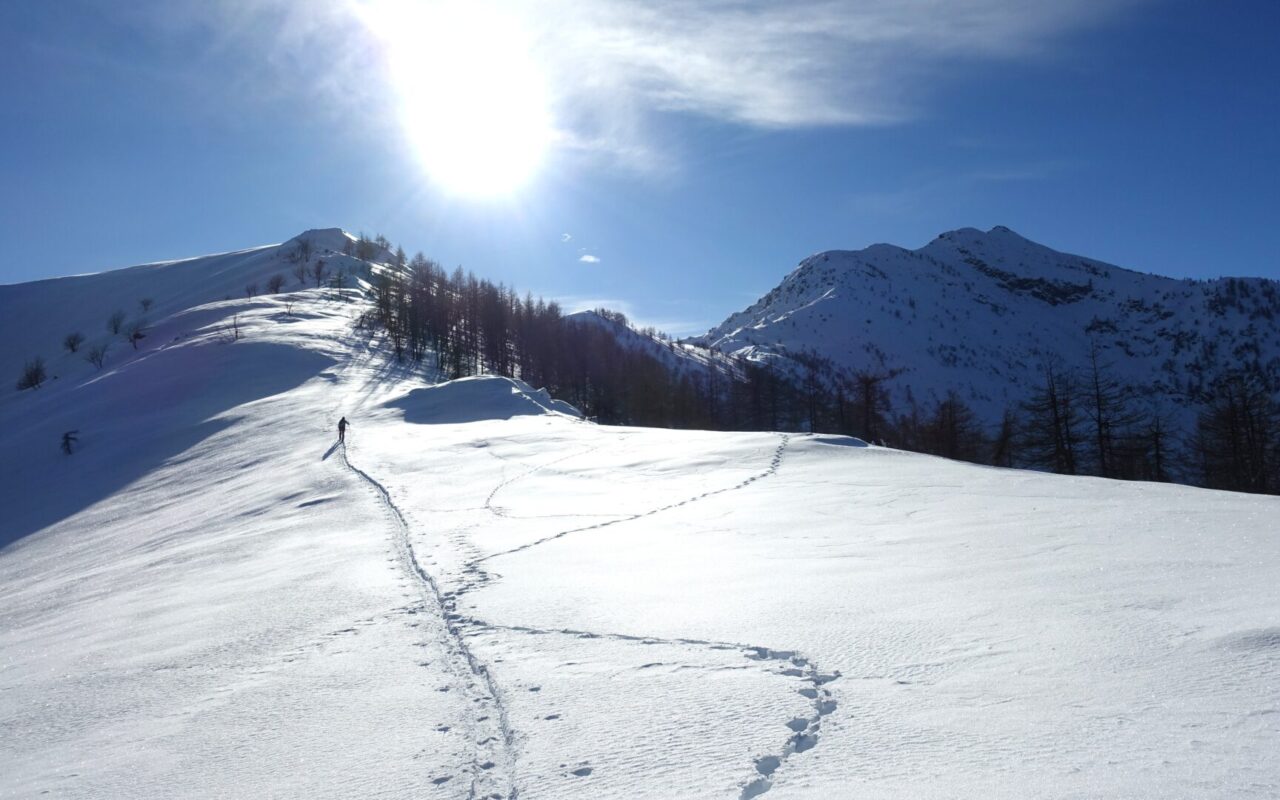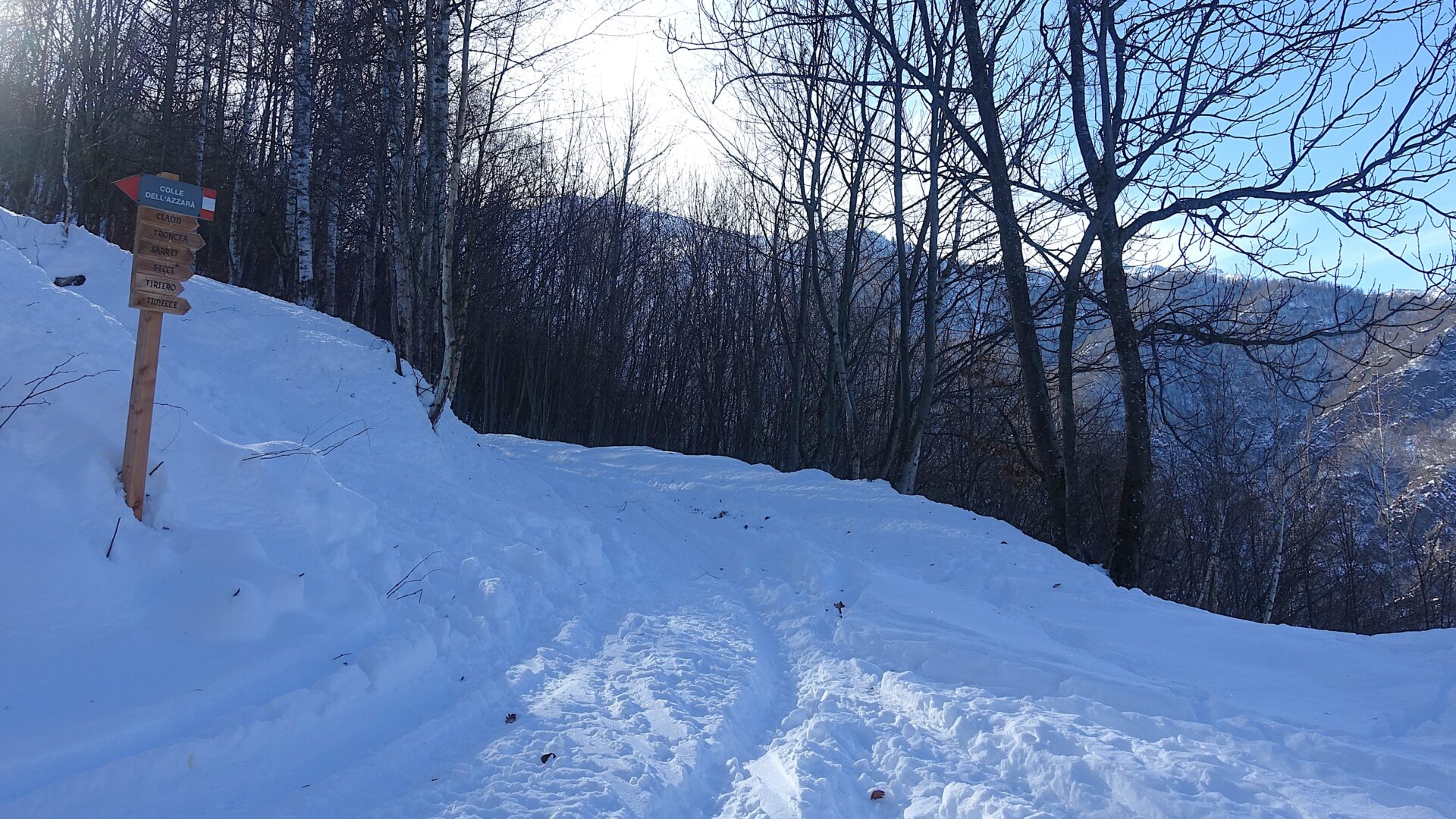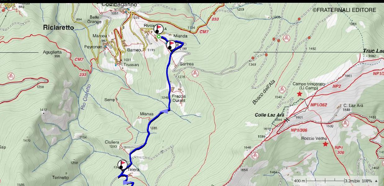 a-b: Giunti alla Rivoira Superiore (1.160 m) imboccare la strada carrozzabile sterrata e non mantenuta sgombra da neve per il Colle di Laz Ara. Percorrerne il primo tornante; in corrispondenza del secondo tornante è visibile una palina (a quota 1.210 m circa) con indicazioni per varie borgate, compresa la borgata Tiriera. Seguire verso le borgate e abbandonare la pista che porta al Colle di Laz Ara.