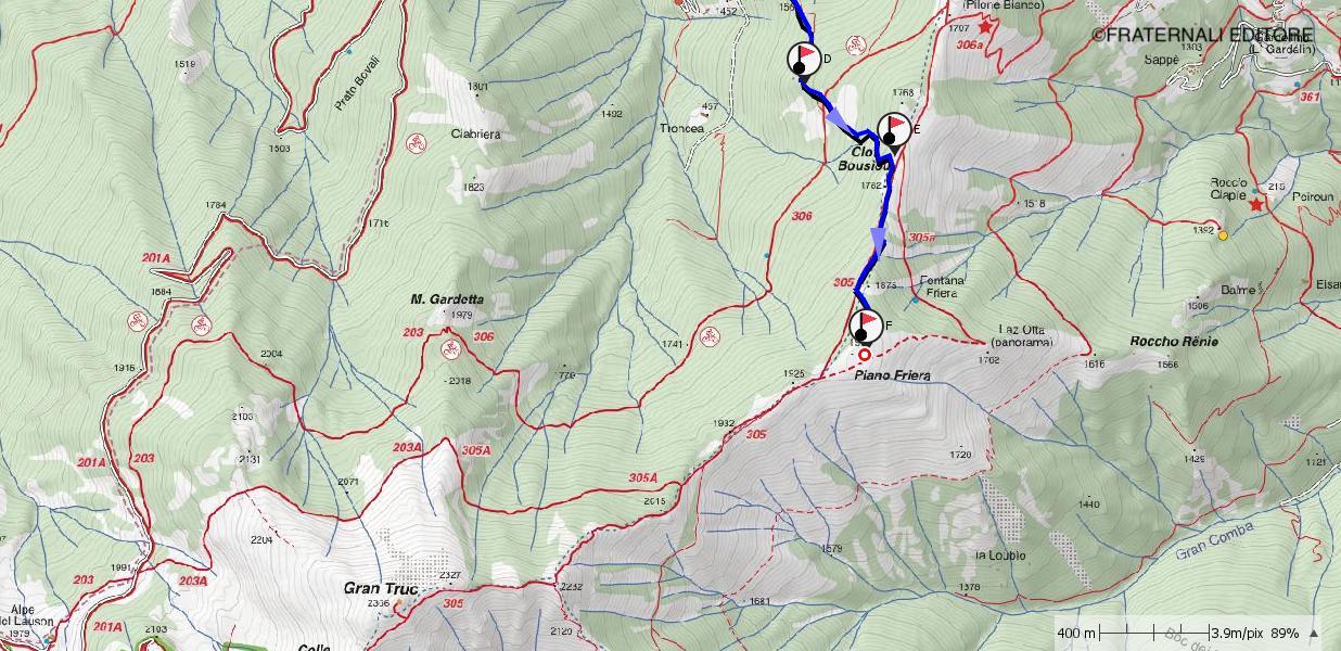 c-d: Giunti a questo punto, deviare a sinistra, e cominciare a risalire il dosso boscoso, tenendo grosso modo come riferimento il dosso stesso, intersecando più volte le tracce di un vecchio sentiero. A quota 1.480 m, si transita sul piano di una ampia strada, verosimilmente utilizzata per scopi di gestione forestale. Continuare a seguire il dosso, in direzione sud-est, fin quando questo sfuma nelle ampie radure a quota 1.660 m.