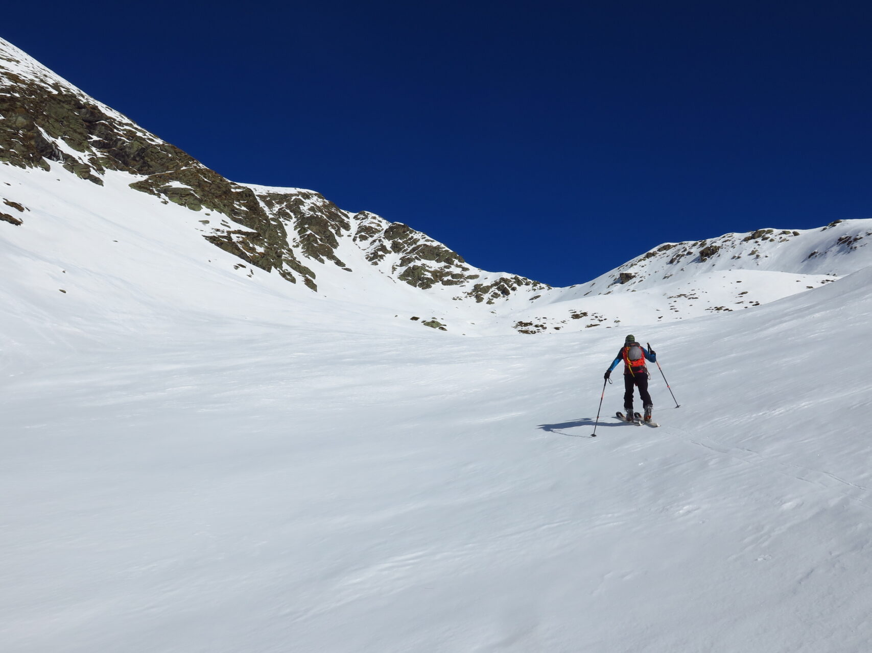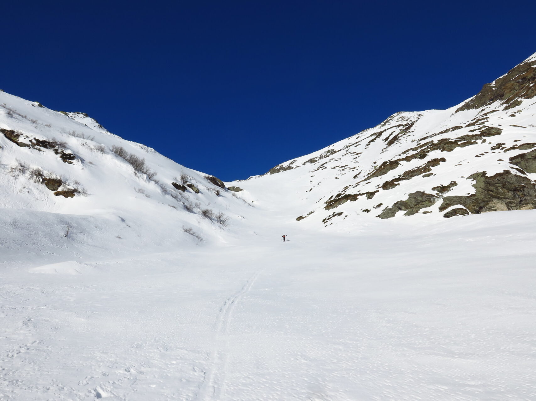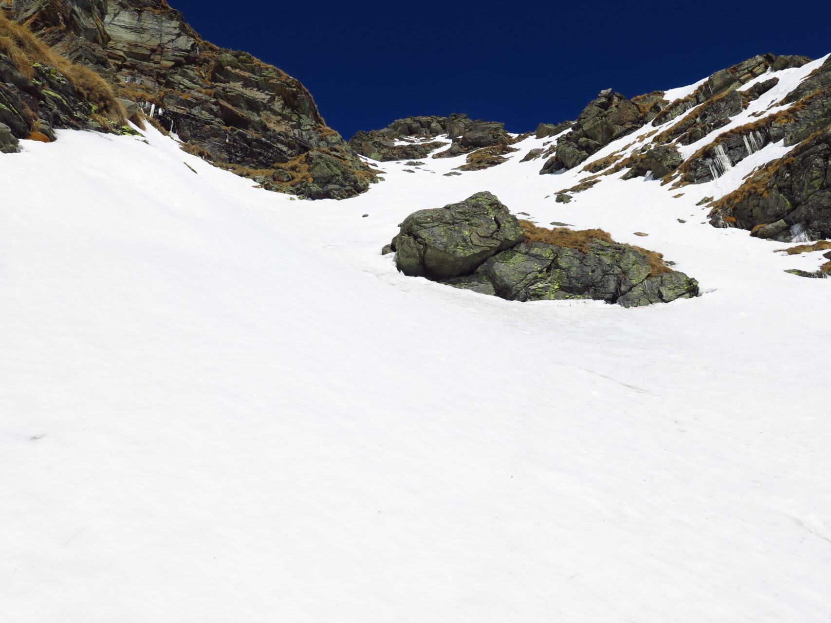 b-c: Si svolta quindi a destra (direzione nord) e si entra nel vallone di Piano Salei. Dapprima si affrontano pendii dolci, poi si sale su pendenze crescenti fino alla base dello stretto canale a quota 2.460 circa.
