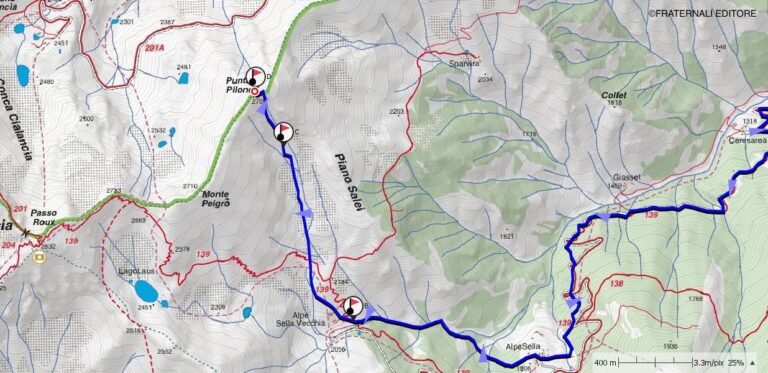 a-b: Dal parcheggio si prende a seguire la strada consortile che, diramandosi per Chiot a quota 1.200 m e per i Sap quota 1.370 m, porta ai 1.804 metri dell’Alpe della SeIla. Da qui si procede in direzione ovest, perdendo alcuni metri per poi salire un bellissimo e ripido (a tratti) vallone che conduce all’Alpe di Sella Vecchia (2.056 m).