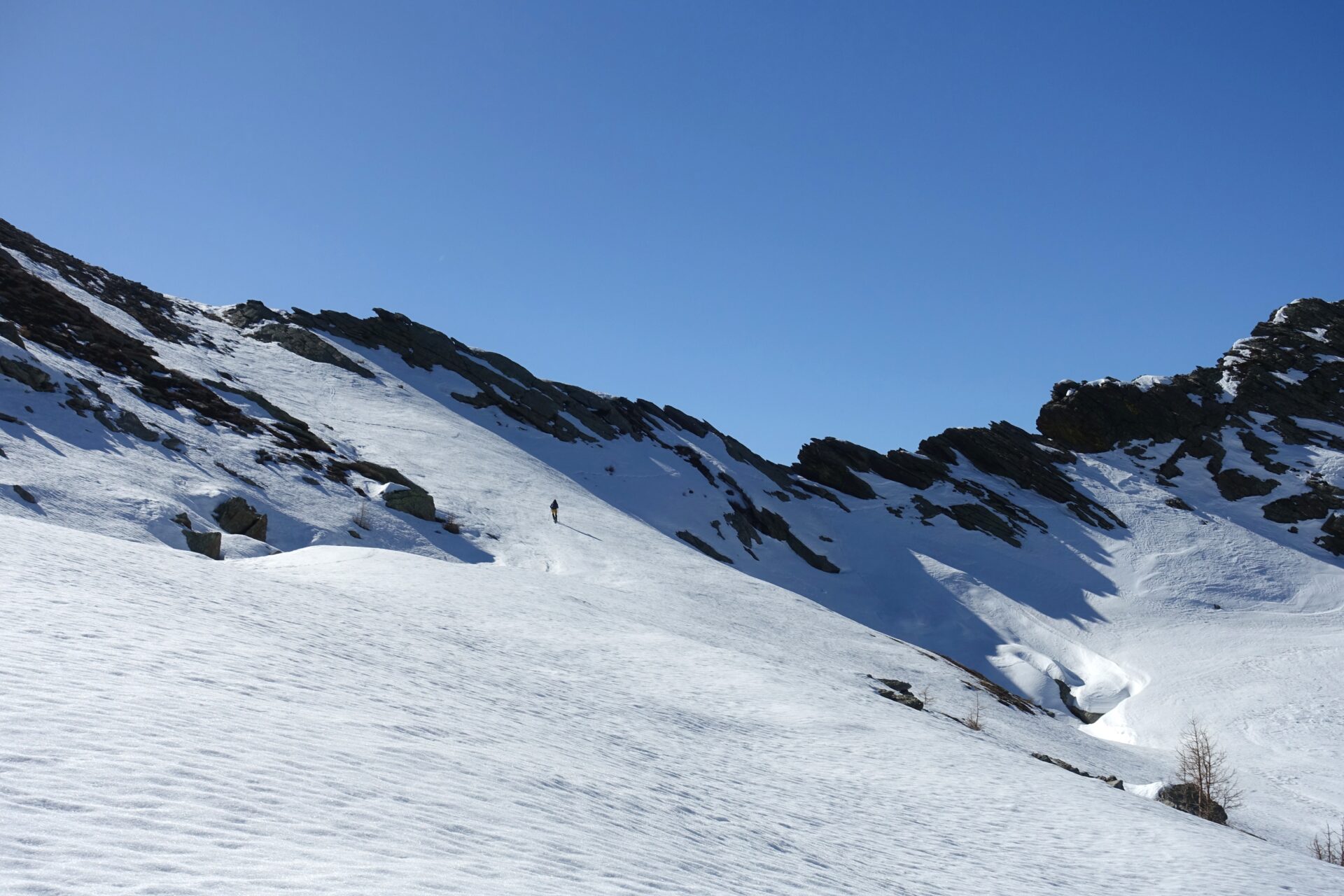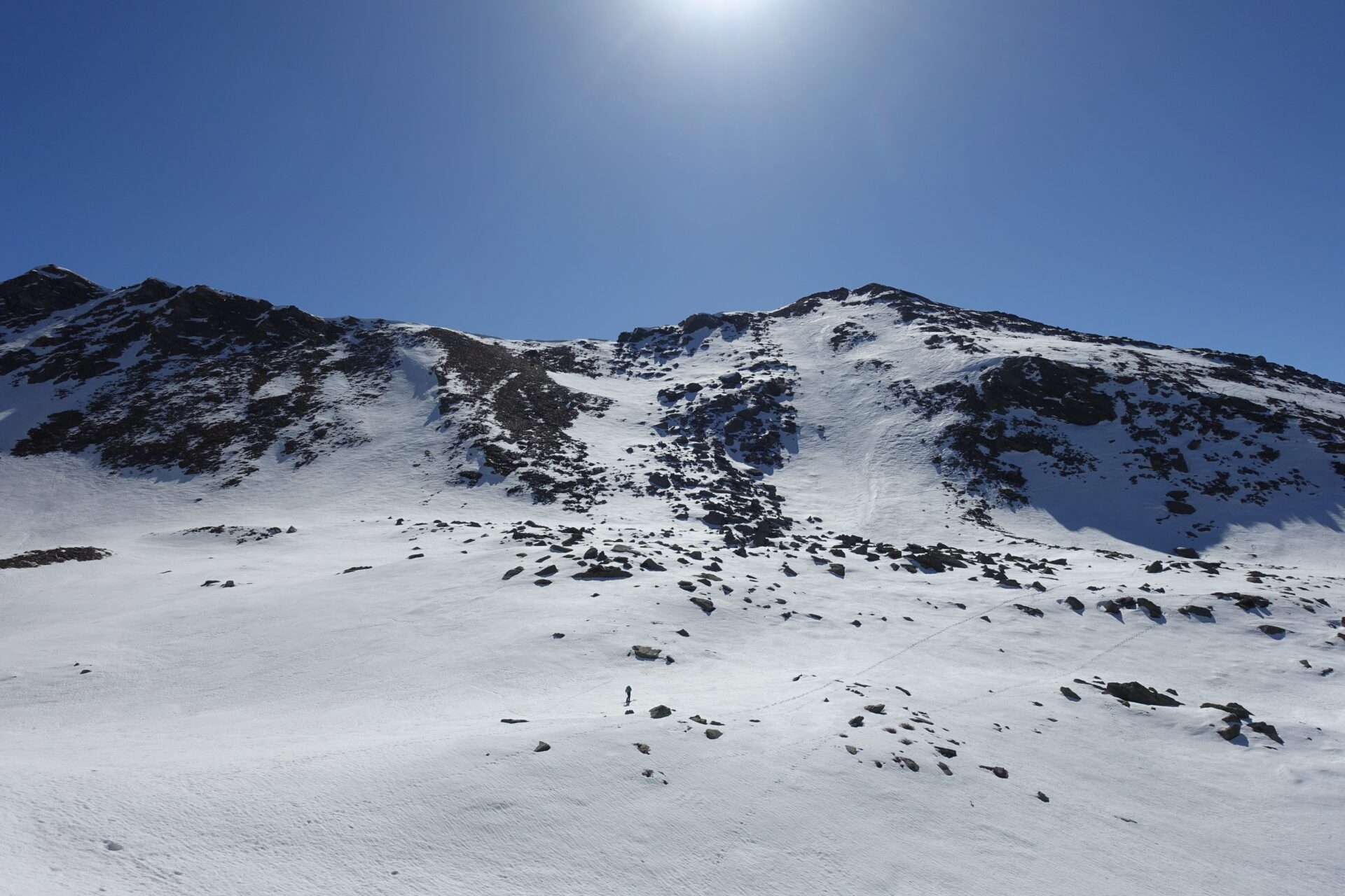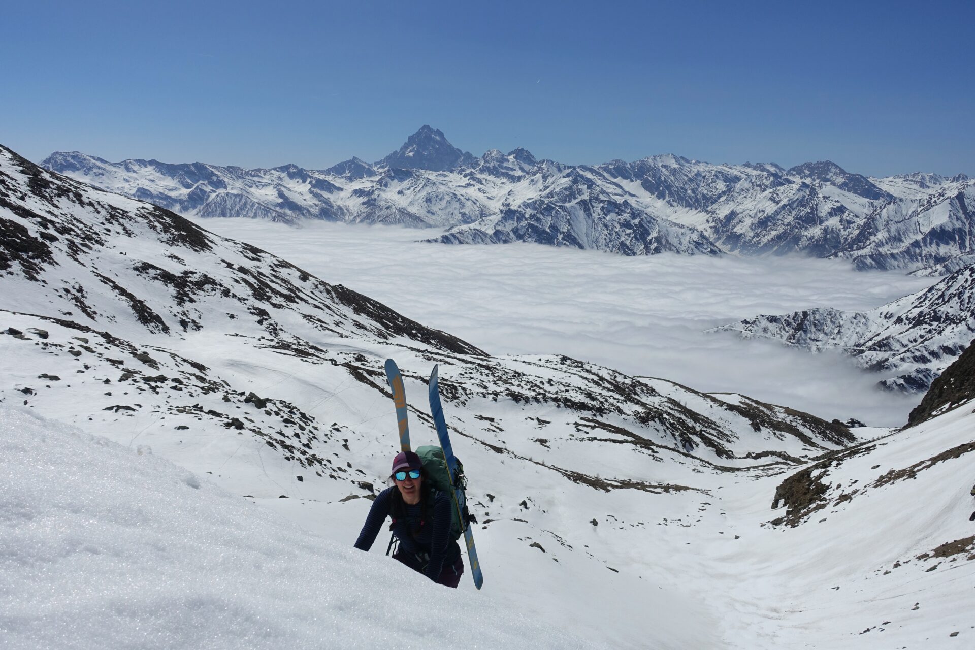 Discesa sull’itinerario di salita con risalita al Col Rousset, portando gli sci sullo zaino.