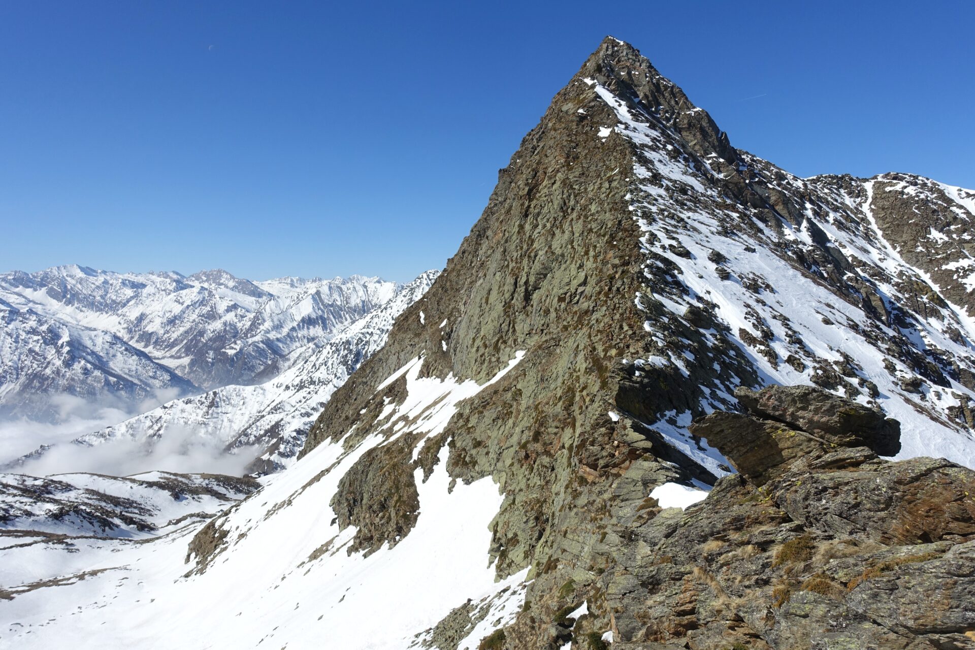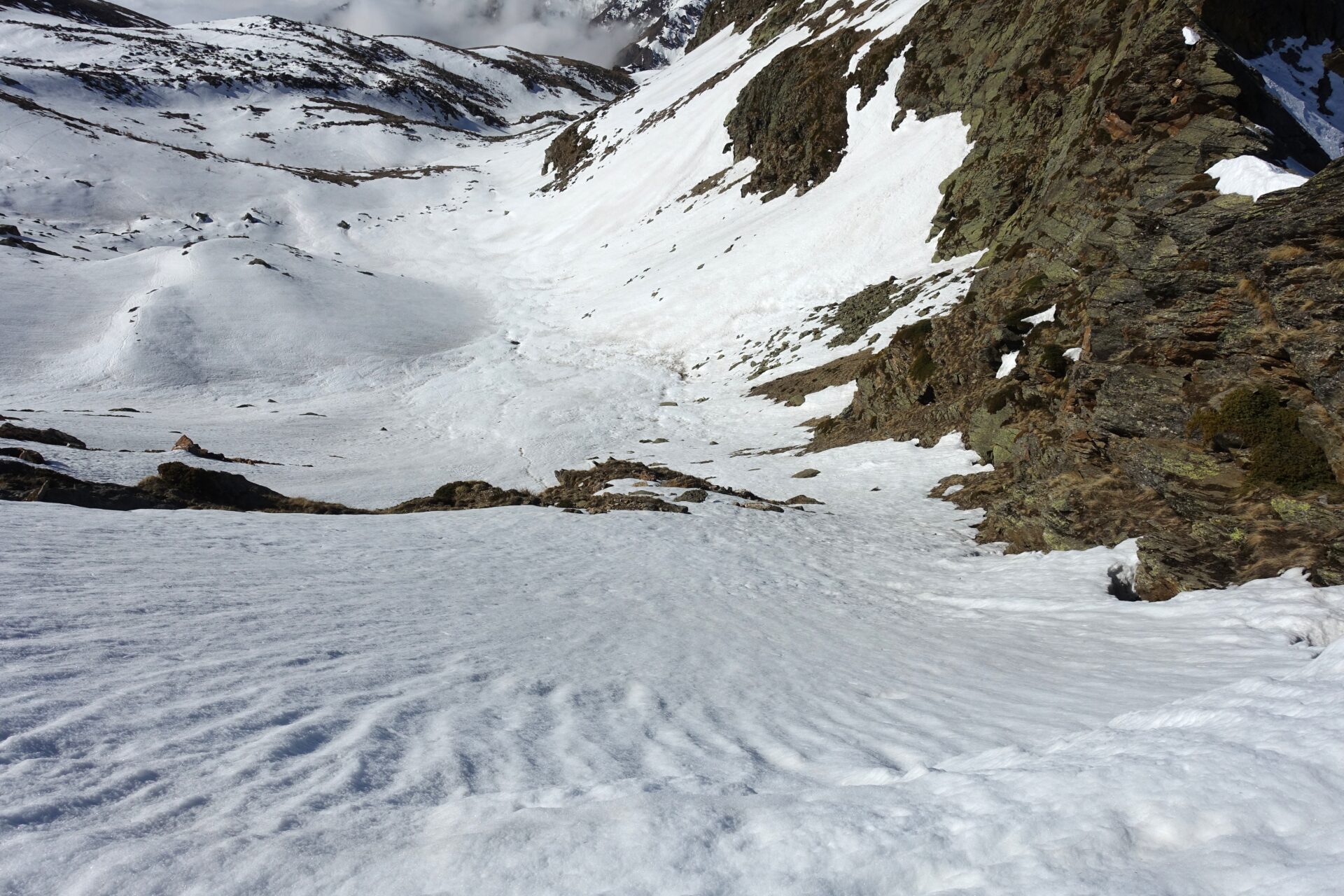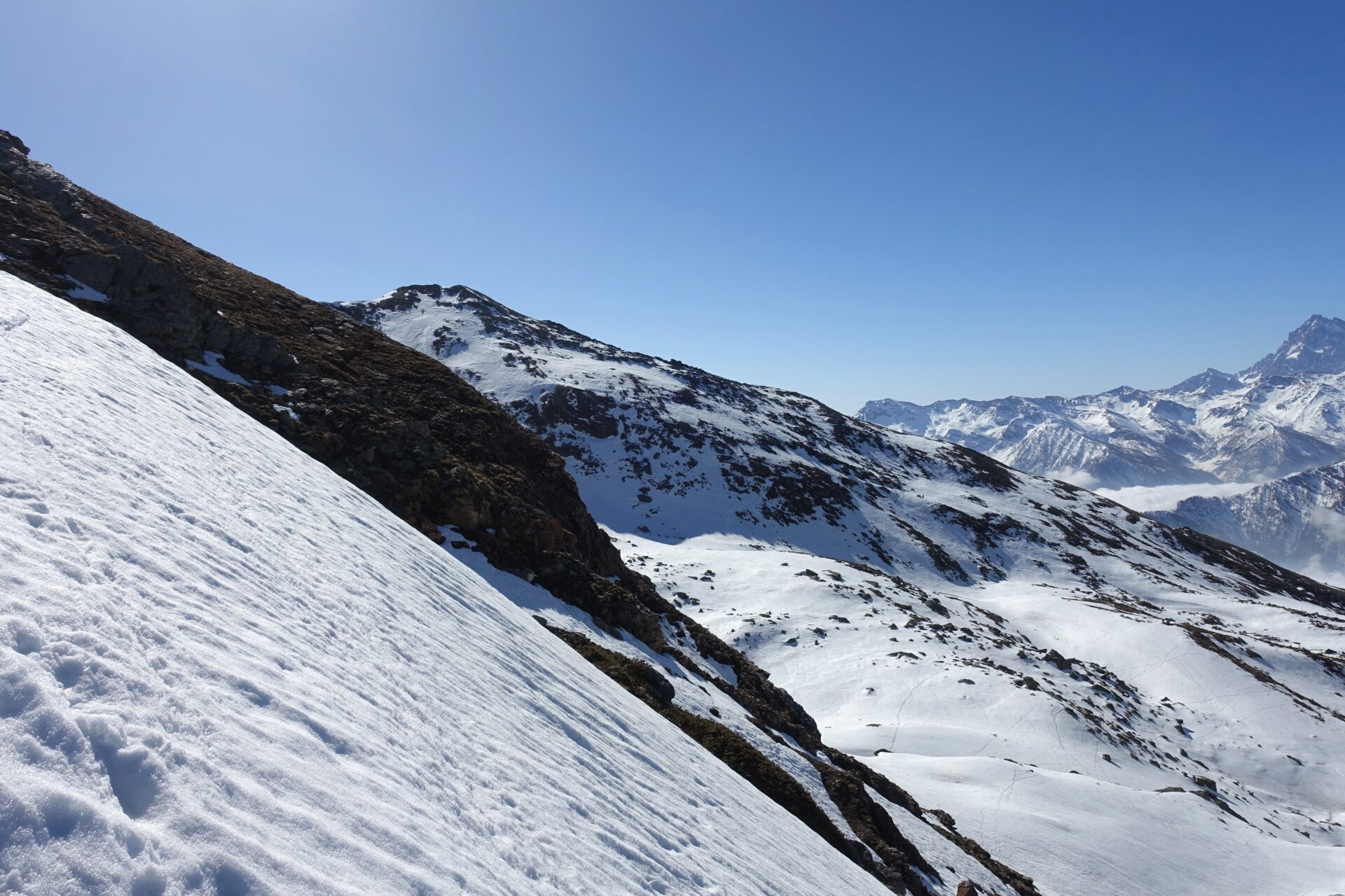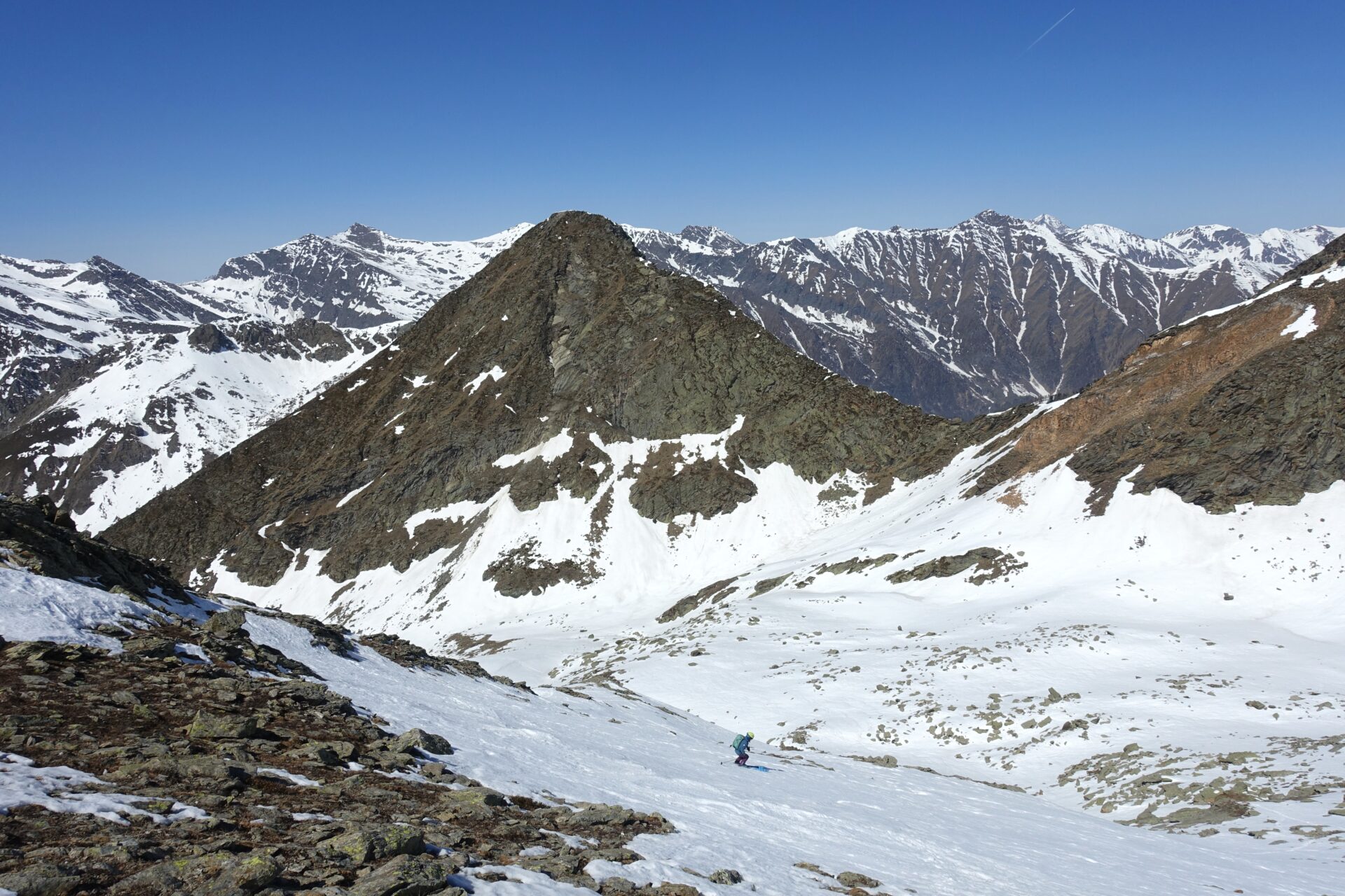 Discesa sull’itinerario di salita con risalita al Col Rousset, portando gli sci sullo zaino.