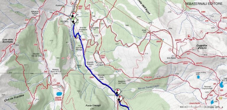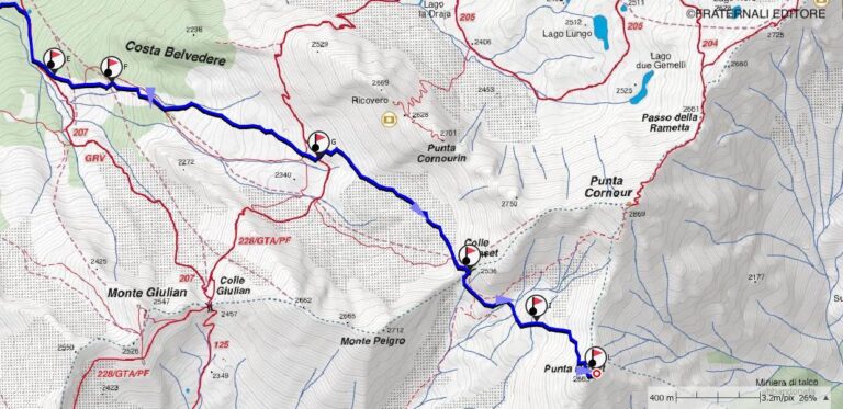 f-g: Percorrere l’intero vallone, arrivando ad intersecare il sentiero GTA proveniente dalla Conca dei Tredici Laghi, a quota 2.340 m circa.