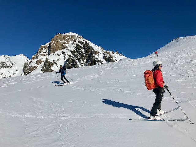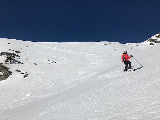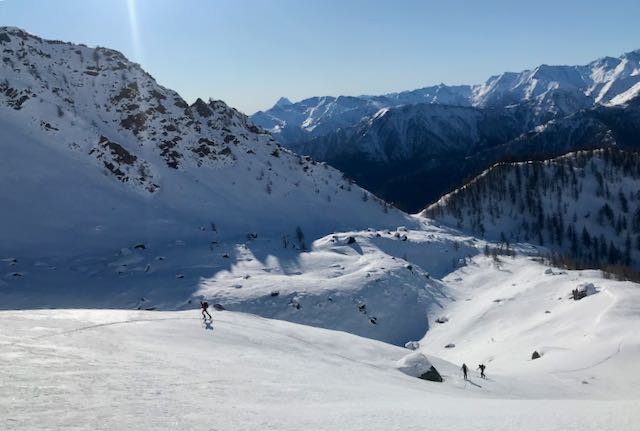 c-d: Svoltare a sinistra in direzione nord imboccando una valletta ascendente che porta sotto un ripido traverso a sinistra (tratto da valutare con attenzione), in corrispondenza del sentiero estivo 366 per il Robinet, che permette di salire sull’ampia e sicura dorsale.