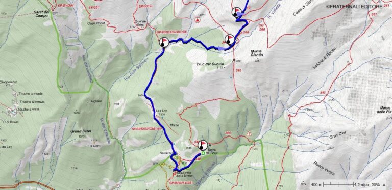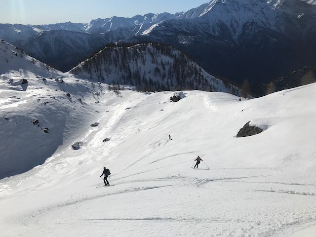 Per l’itinerario di salita o, con giuste e sicure condizioni, scendere dalla dorsale in direzione sud e raggiungere con poca risalita il colletto del Truc del Cuculo. Dal colletto sempre in direzione sud, occorre individuare e valutare la migliore linea di discesa, in particolare dall’inizio del bosco in giù. Raggiunta la baita isolata di Serre da Bouc a 1.555 m si segue poi a destra lungo la cengia per rientrare facilmente a Selleiraut.