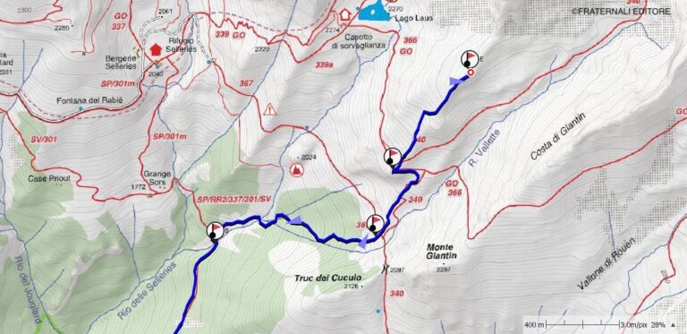 a-b: Dal Parcheggio sotto le case di Selleiraut seguire la strada e all’uscita dall’abitato imboccare la traccia della mulattiera estiva fino al primo ponticello sul rio delle Vallette.