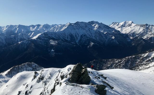 d-e: Proseguire seguendo la dorsale in direzione nord-est fin dove il filo di cresta si restringe (e dove si attacca la via alpinistica Cresta delle Scuole) sotto le pendici del Monte Cristalliera, verso quota 2.440 m.