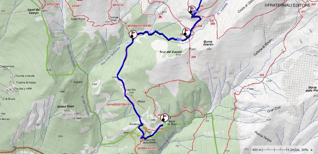 a-b: Dal Parcheggio sotto le case di Selleiraut seguire la strada e all’uscita dall’abitato imboccare la traccia della mulattiera estiva fino al primo ponticello sul rio delle Vallette.