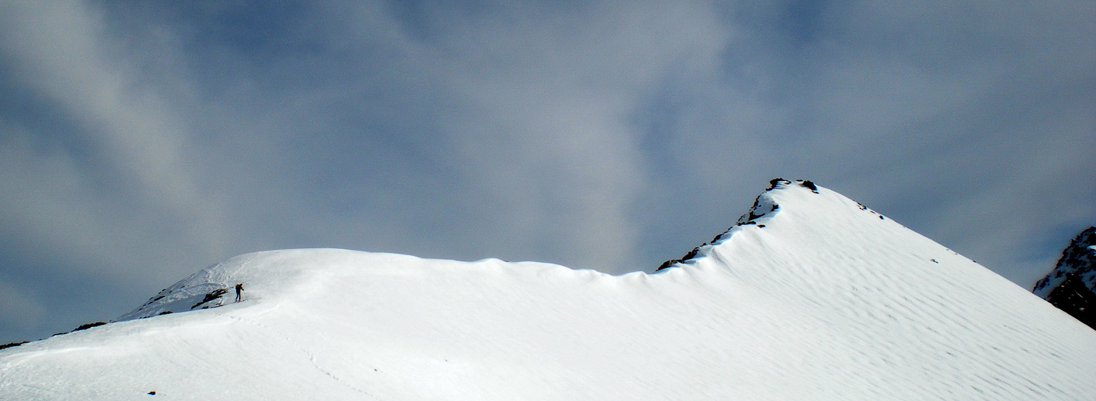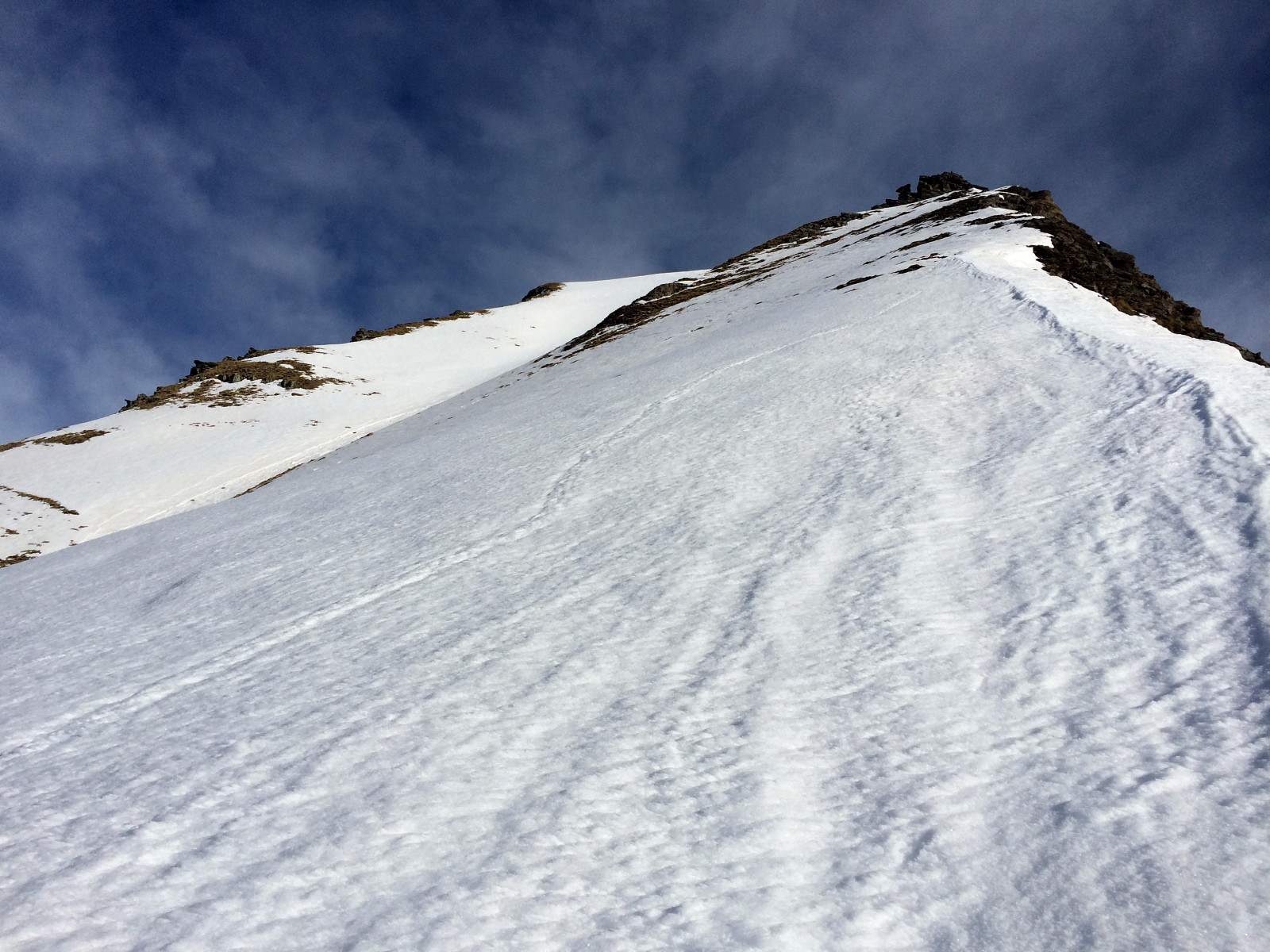c-d: Da qui inizia il tratto più ripido ed esposto: ci si porta sulla dorsale a sinistra e la si segue fino a che la pendenza non si abbatte. Utili i ramponi.