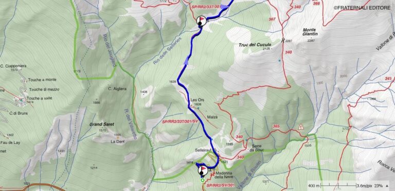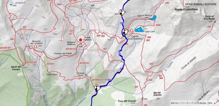 a-b: Dal Parcheggio sotto le case di Selleiraut seguire la strada e all’uscita dall’abitato imboccare la traccia della mulattiera estiva fino al primo ponticello sul rio delle Vallette.