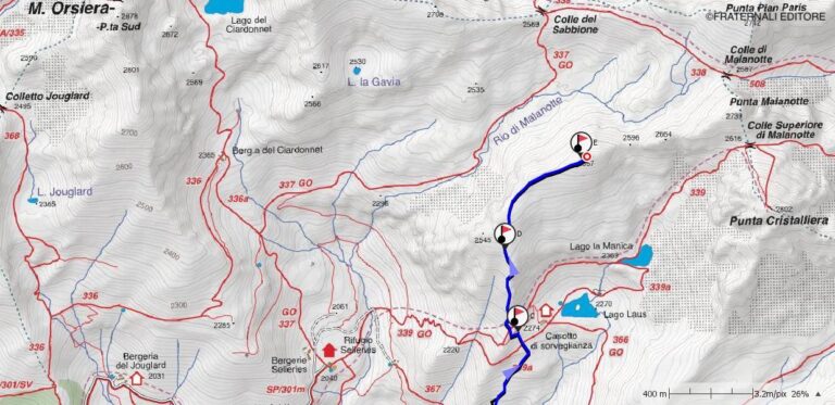 b-c: Prima del ponte iniziare a salire in direzione est e poi nord-est nel bosco, l’obiettivo è passare in un pendio canale alla destra di un evidente risalto roccioso. Superato e lasciato a sinistra risalto, dopo poco si raggiunge l’ampio ripiano che a destra ospita il Bivacco del Laus e l’omonimo lago a quota 2.300 m.