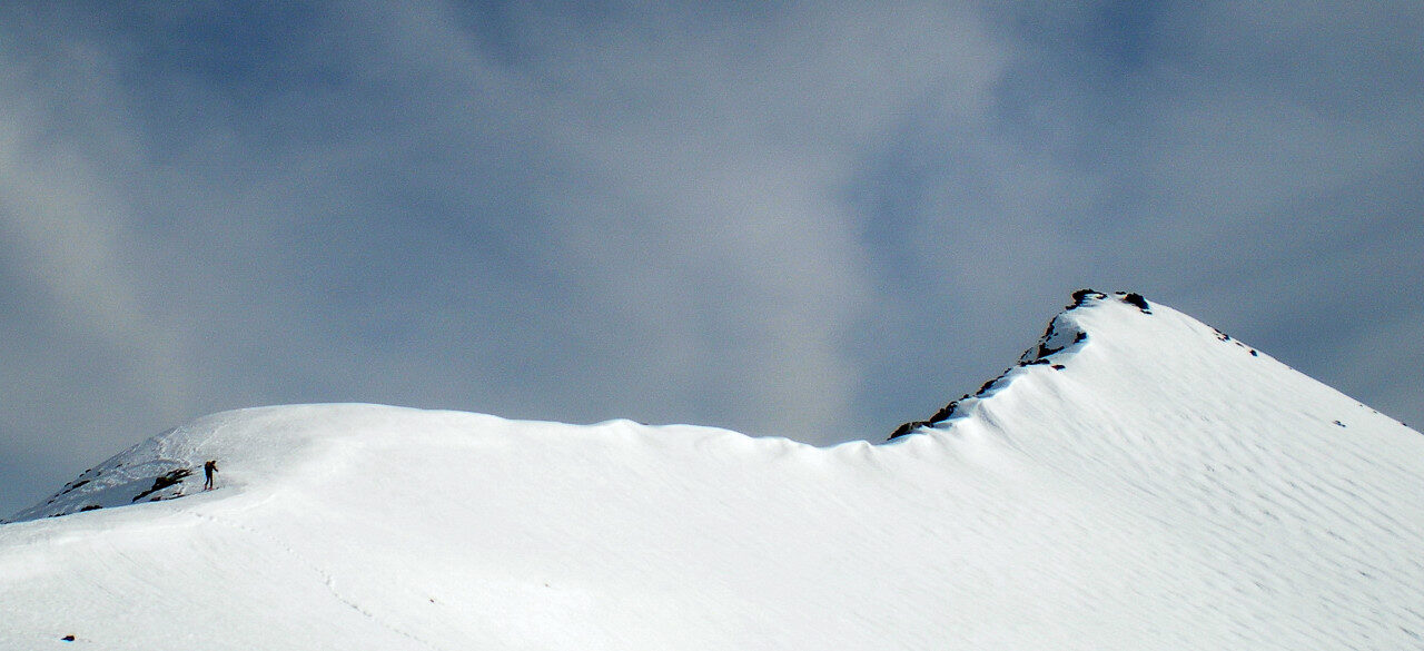 c-d: Da qui inizia il tratto più ripido ed esposto: ci si porta sulla dorsale a sinistra e la si segue fino a che la pendenza non si abbatte. Utili i ramponi.