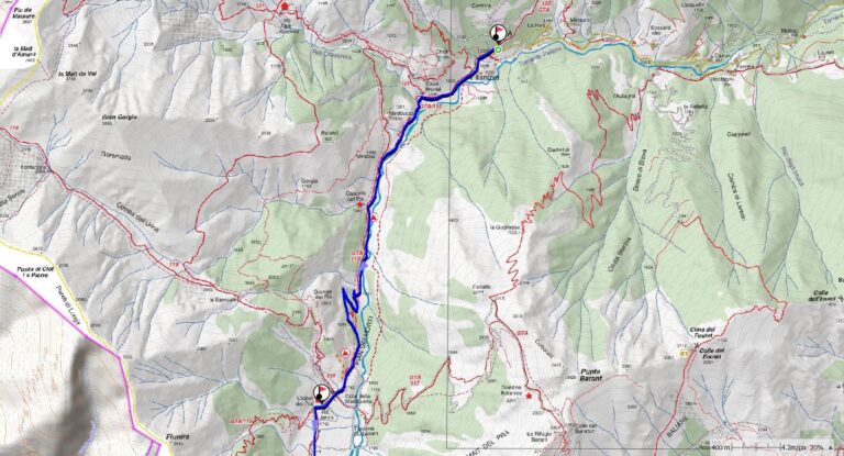 Variante: da Villanova, proseguendo lungo l’ampia strada, con un lungo tornante ci si innalza ad attraversare il rio Pissai (è il rio che forma la bella cascata all’ingresso del borgo) a quota 1.350 m e poi, per la seguente pista forestale, il rio Crosenna a quota 1.450 m circa. Di qui, con percorso pianeggiante si attraversano i prati di Mirabucas e quindi si raggiunge il sito del forte di Mirabuc, dove si incrocia l’itinerario principale. Questo percorso è molto più lungo del primo ma, ovviamente se innevato, decisamente più sciistico.