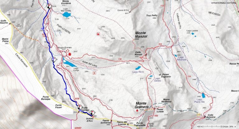 Tondeggiante rilievo dello spartiacque Pellice-Guil, compreso fra il passo Seillierino e il Colle Seilliere (noto in quanto facile punto di scavalcamento della cresta di confine). Localmente con questo toponimo si identifica il costone che da Pian Sineive si innalza alla volta del Lago Lungo e del vicino Rifugio Granero. Percorso d’ambiente particolare: prima il lungo tratto pianeggiante per percorrere tutta la conca del Pra circa (3 km e 70 m d+) poi si inizia a salire in ampio vallone con pendii protetti a Nord da imponenti balze rocciose. Considerato il notevole sviluppo chilometrico dal posteggio di Villanova al fondo della conca del Prà (circa 7Km e 570m d+) è consigliabile il pernottamento al Rifugio Jervis. Attenzione: l’accesso alla conca del Pra può essere molto rischioso in condizioni di pericolo valanghe, anche se molto facile, così come la parte di itinerario dal Pian Sineive in poi!
