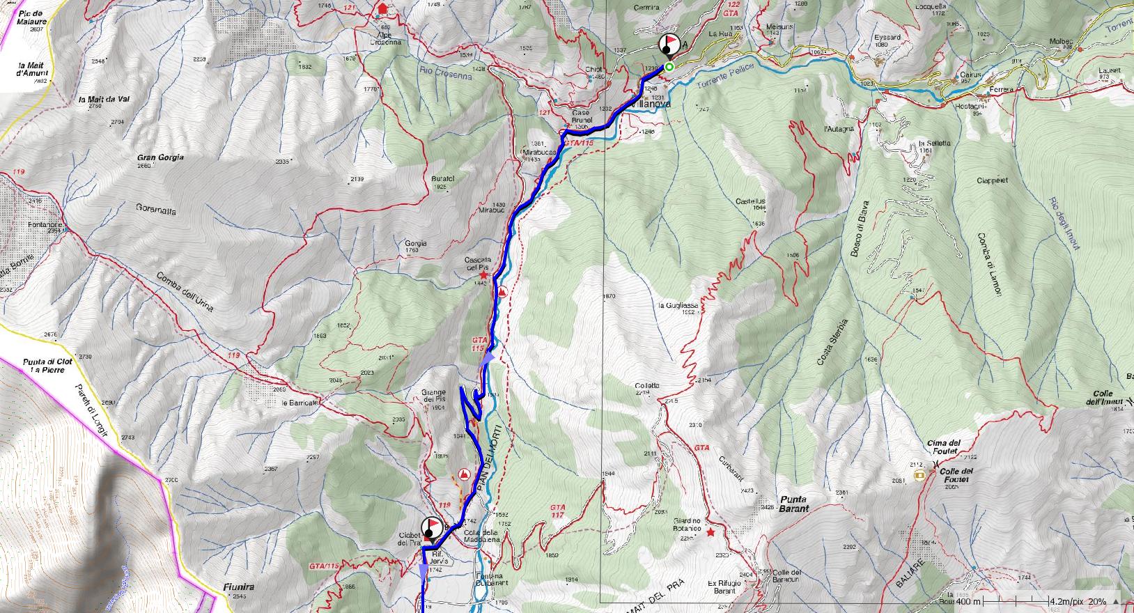 a-b: Attraversando l’abitato di Villanova (1.225 m) si prende a seguire la mulattiera del Colle della Croce che, attraversato il Rio Crosenna, costeggia con stretti risvolti le balze rocciose di Mirabucas per immettersi presso il sito del forte di Mirabuc sulla pista forestale che da Villanova sale al Pra. La si segue e, toccati il Pian del Pis e il Pian dei Morti, ci si porta sotto al Colle della Maddalena (1.737 m), vera e propria porta d’accesso al Pra, che si scavalca agevolmente per raggiungere, con leggera e breve discesa sia il rif. W. Jervis che la “Ciabota”.