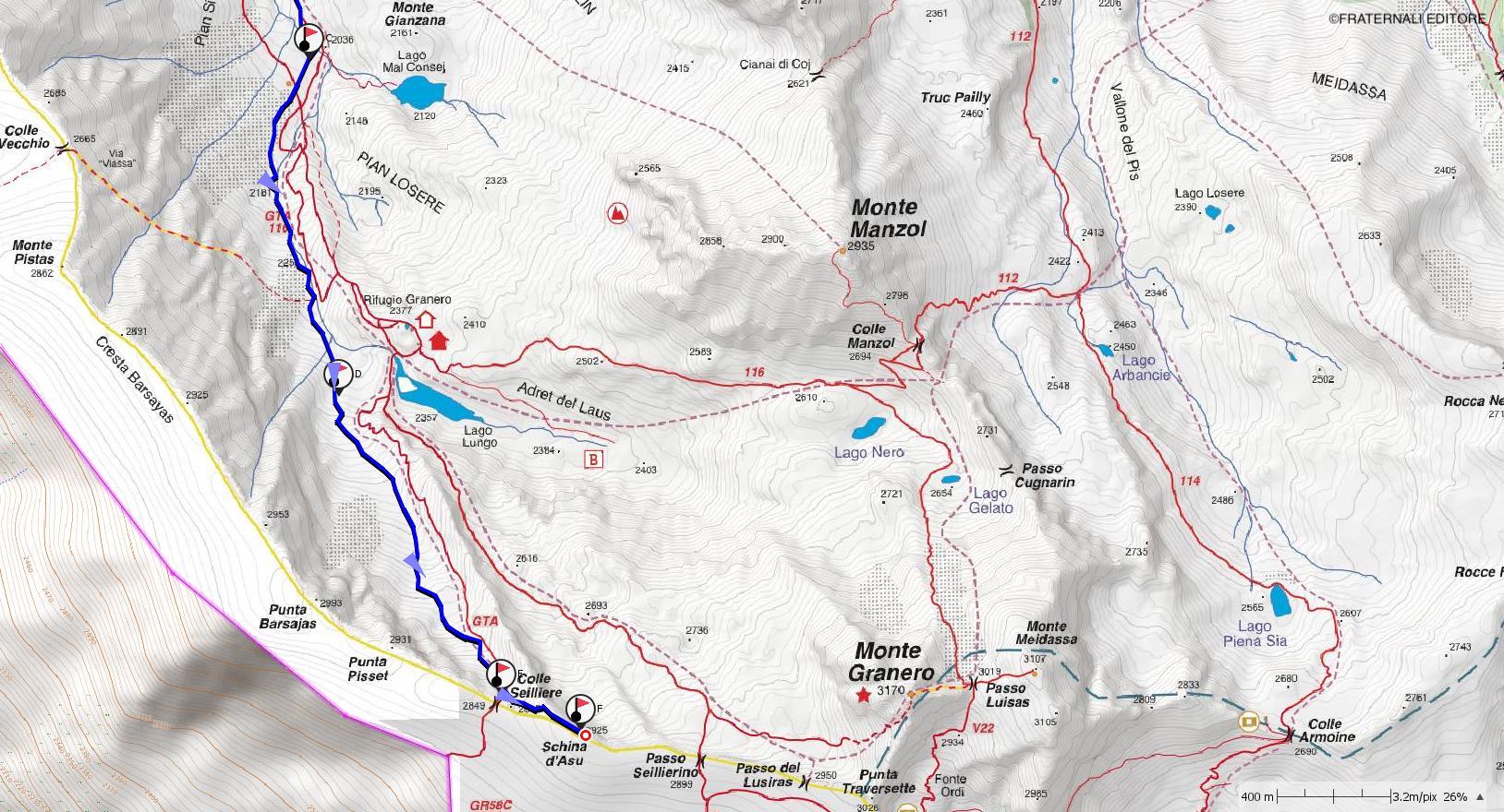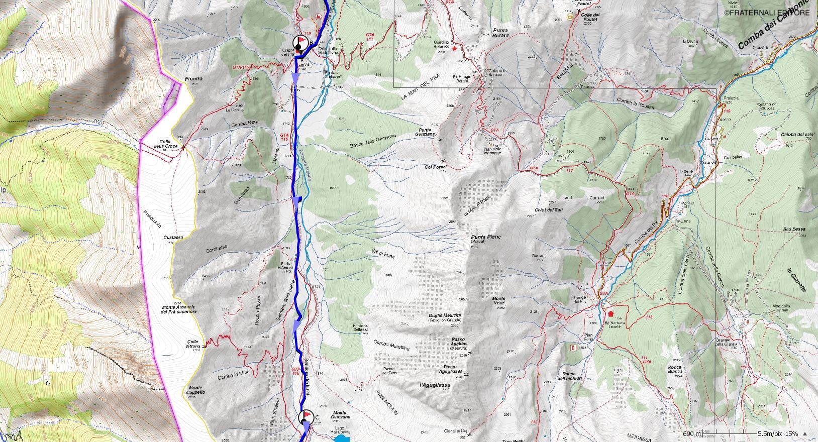 b-c: Dal Rifugio Jervis o dalla Ciabota, si percorre interamente la conca del Pra fino alla borgata di Partia d’Amunt 1.743 m. Continuando la strada ci si porta al di sotto dell’arrotondato e modesto rilievo del Monte Genziana che forma la sponda destra orografica del torrente Pellice. A questo punto si è arrivati al fondo della conca e, compatibilmente con le condizioni, si segue il sentiero che porta verso il RIfugio Granero. Seguirlo avanzando in un bosco rado di larici fino a passare accanto al cippo in memoria degli avieri americani qui precipitati il 21 Luglio del 1957, posto in località Pian Sineive a quota 2.060 m al cospetto dell’alta parete rocciosa Pisset-Barsajas.