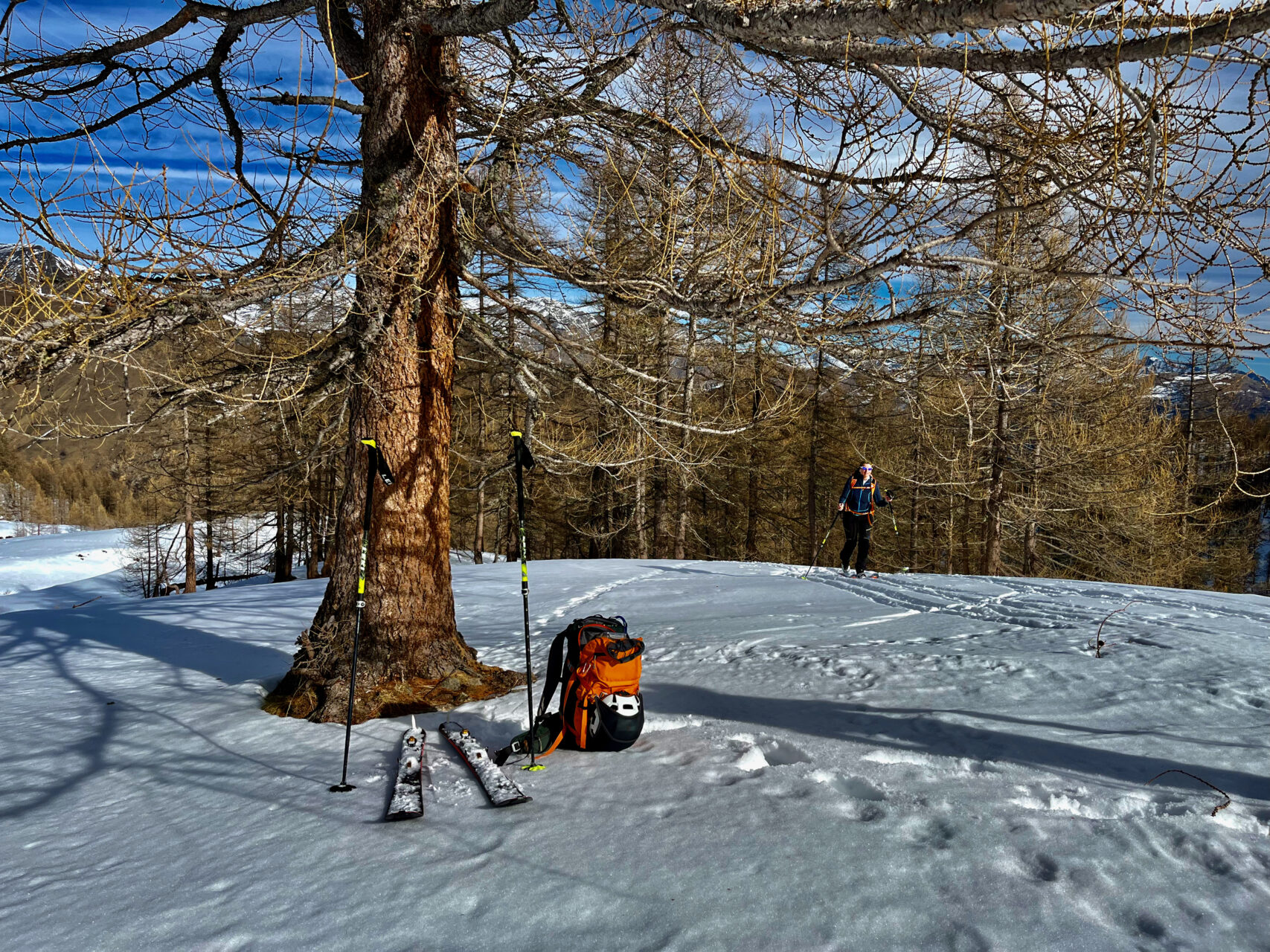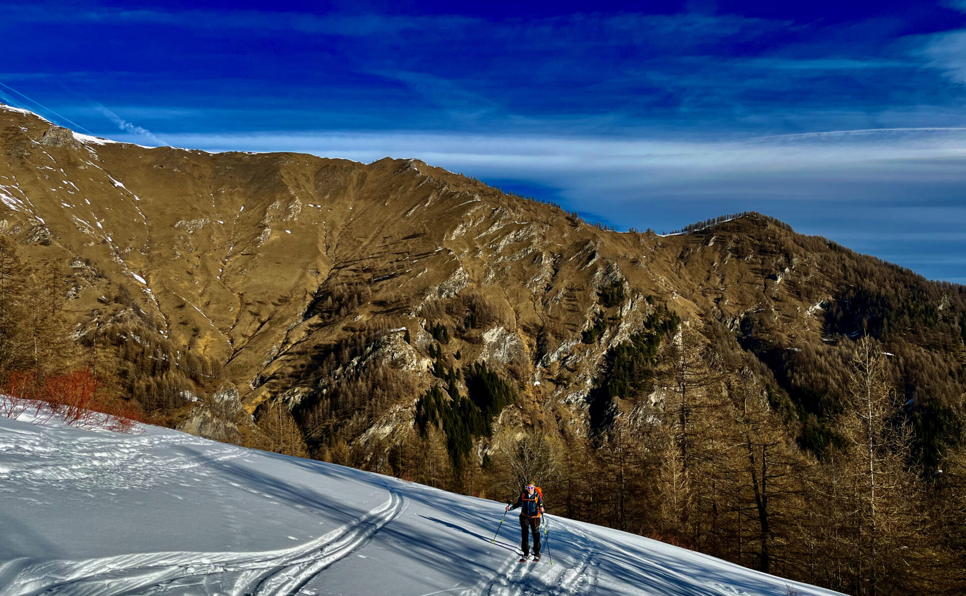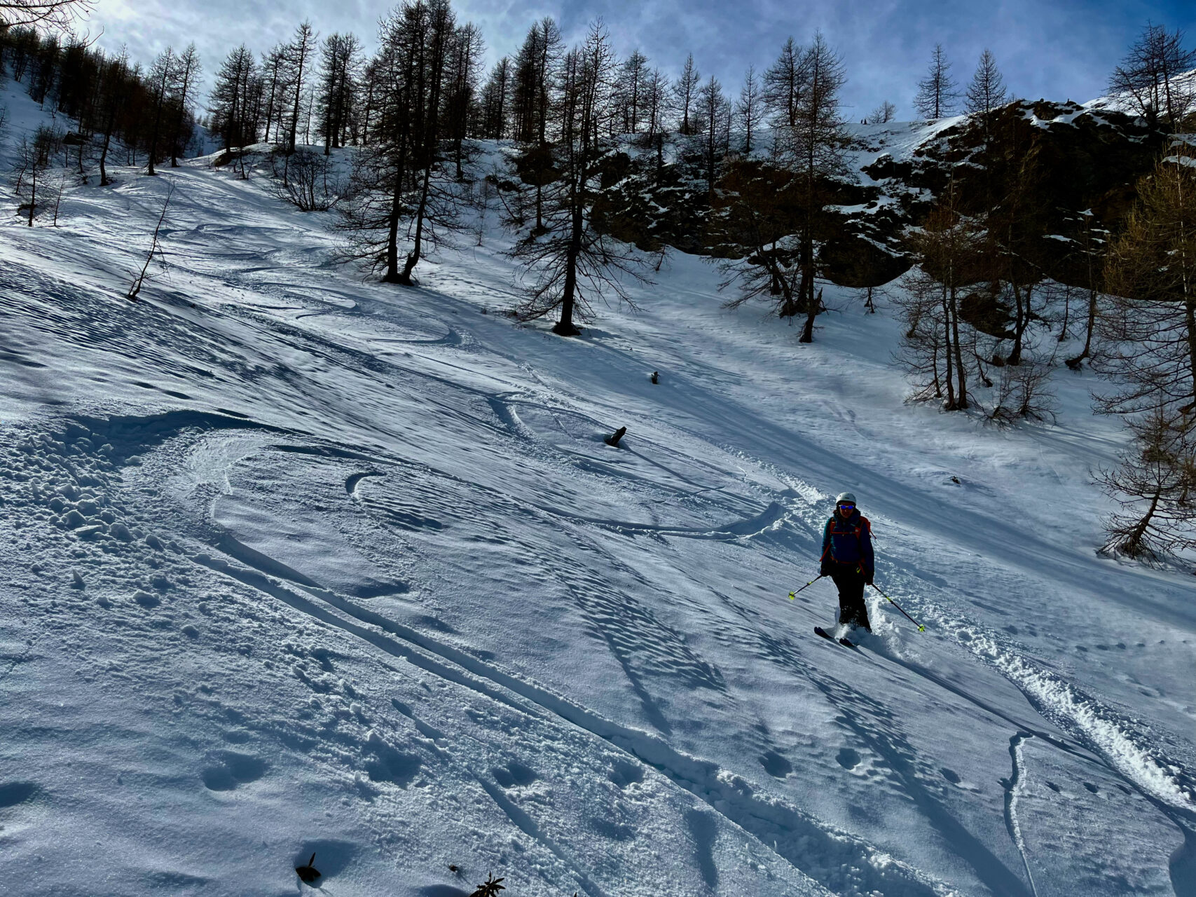 d-e: Attraversata agevolmente la comba si risale l’ampio e aperto pendio alla destra delle case del Clot d’la Ramà (1.760 m). Da qui per radure e facili dossi si prosegue in direzione sud sino ad un più ripido canaletto che scende dal bosco rado. Lo si supera da sinistra verso destra con l’attenzione dovuta alle condizioni, quindi si prosegue su un ampio valloncello fino al dosso che apre l’ingresso all’ampio vallone sotto la punta.