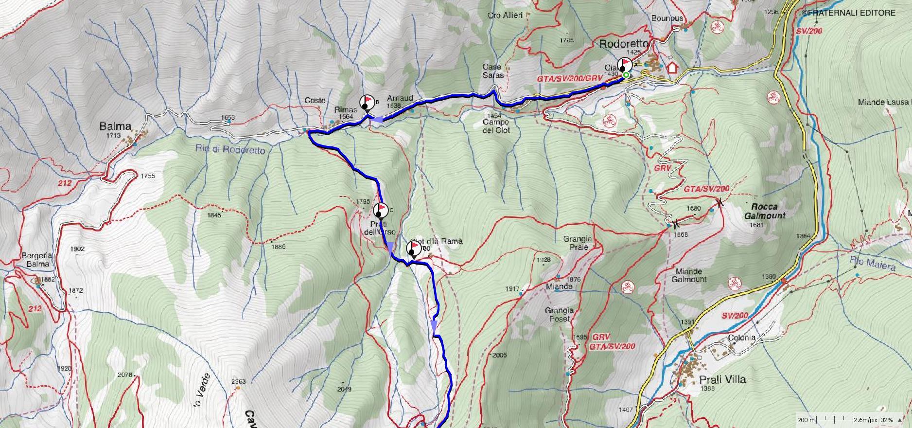 a-b: Dalla piazza di Rodoretto si ridiscende la strada d’acceso e si inizia a percorrere la strada di fondovalle. Si passano le borgate di Campo del Clot, Arnaud e Rimas, dove la strada entra in una spianata prima della salita all’alpe Balma, si individua un ponte sul Germanasca.